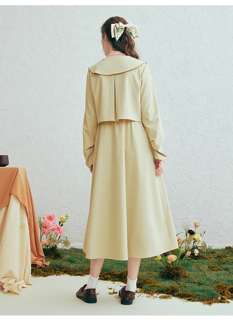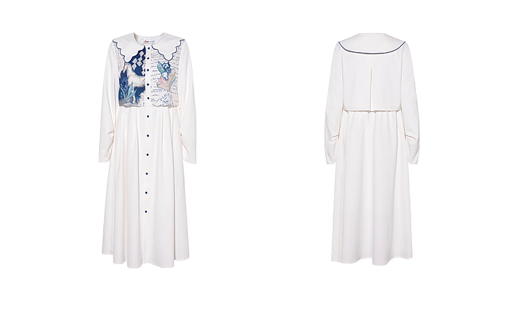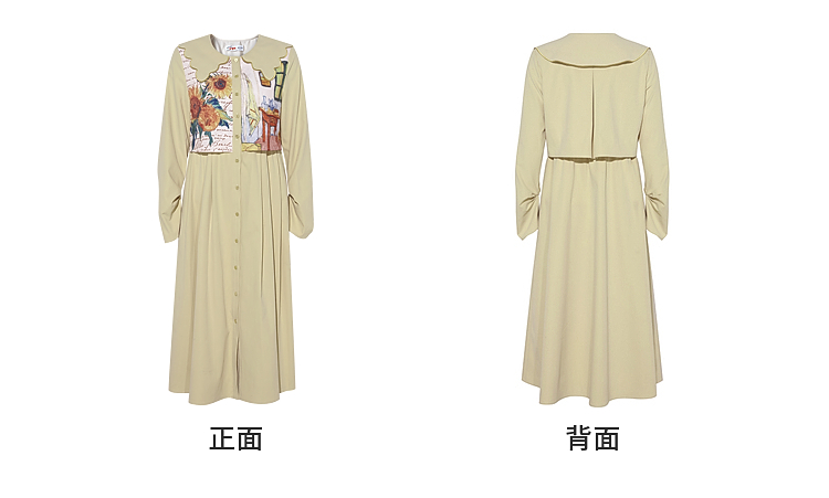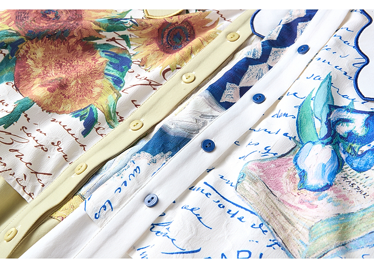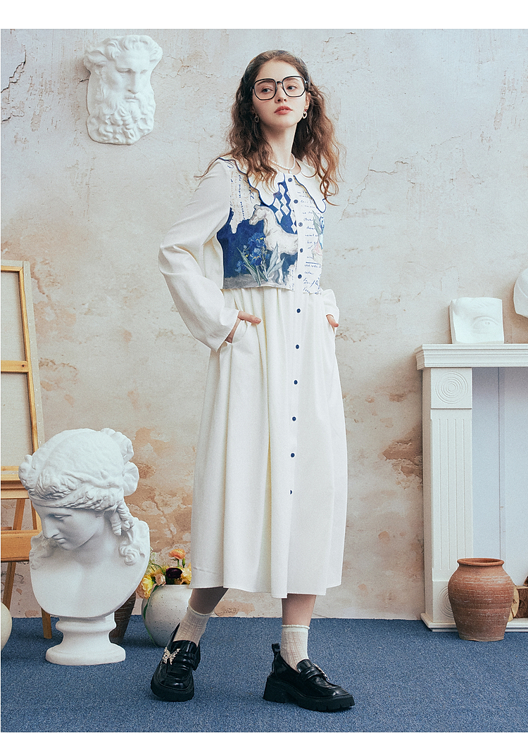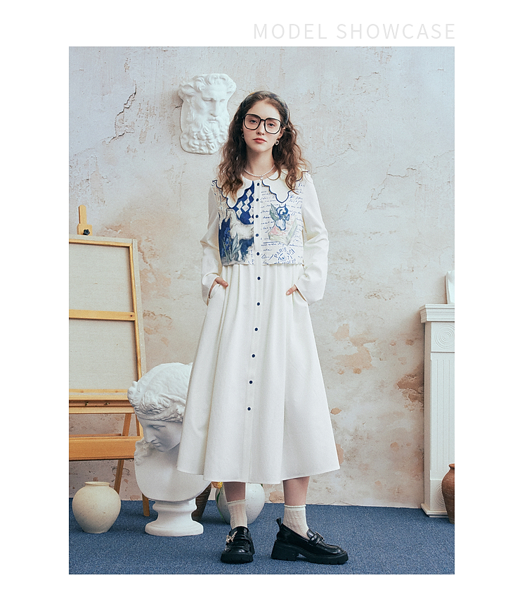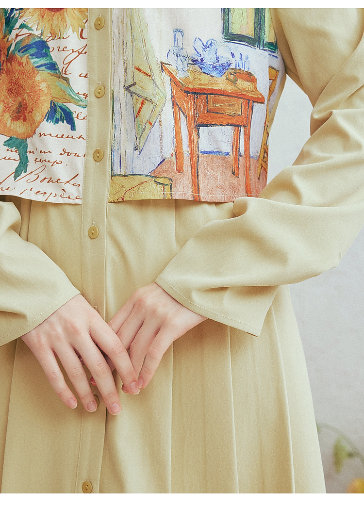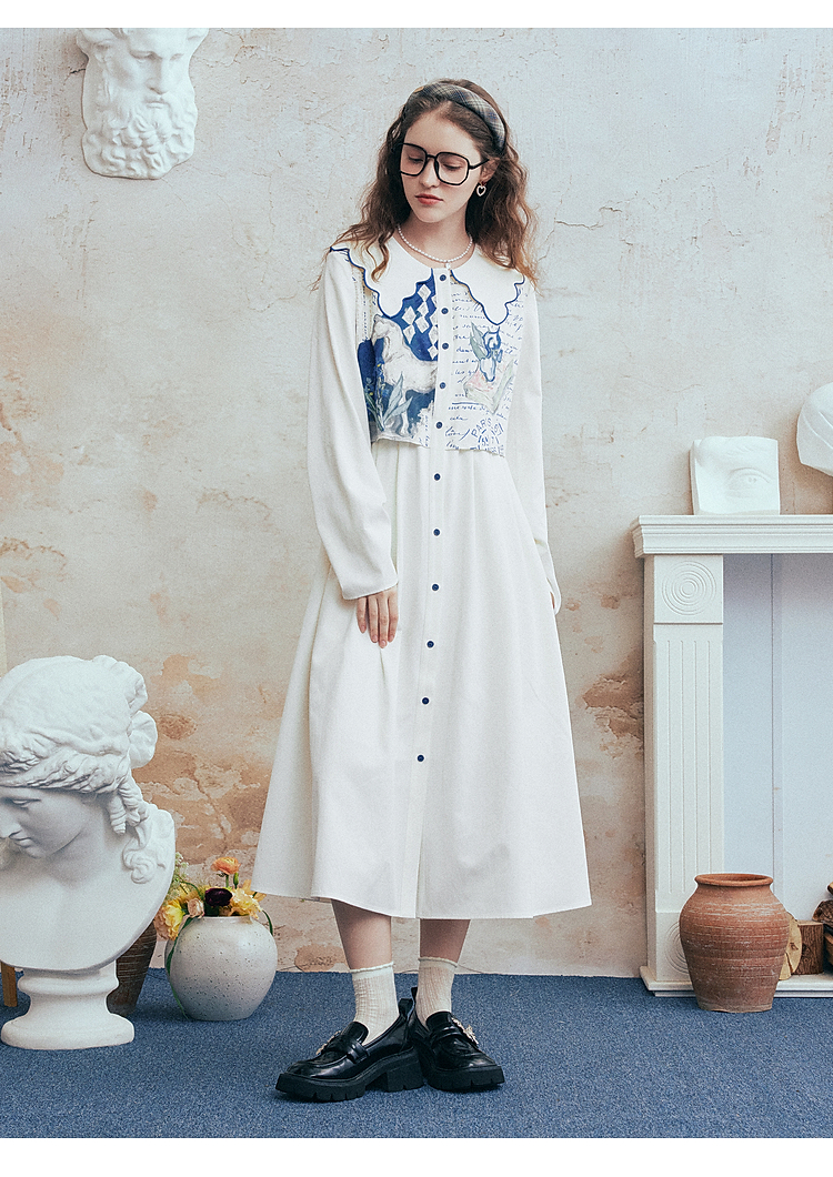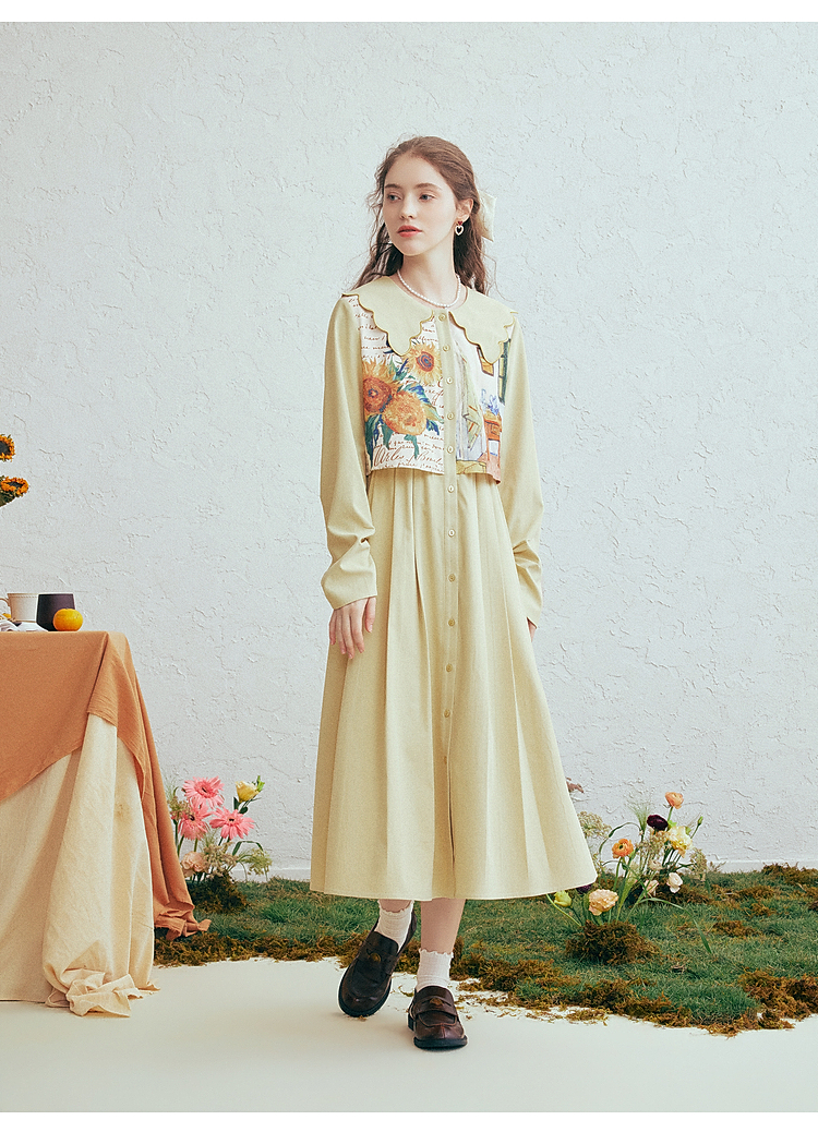 两三事梵高文艺微风呢喃2026春季新款森女风印花拼接假两件连衣裙