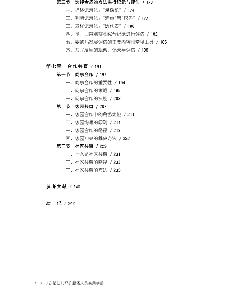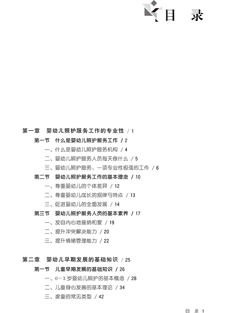 自2015年始,清华大学教育研究院联合课题组经与教育部、国家卫健委妇幼司、河北省市场监管局、河北省卫健委、北京市卫健委等部门沟通,接受委托并组织专业力量启动了“基于职业标准的0-3岁儿童早期发展专业人才能力框架”系列研究。相关研究的阶段性成果已被《婴幼儿发展引导员》《保育师》等国家职业技能标准以及《保教师专业能力要求》(河北)、《婴幼儿发展引导员行业企业评价规范》(河北)、《北京市托育行业人才标准》(北京)等地方标准吸纳,转化为婴幼儿照护服务领域的重大人才政策。本书正是基于相关研究的最新阶段性成果,以及在河北、北京两地的第一手调查数据,从婴幼儿照护从业人员职业伦理、婴幼儿发展基础知识、婴幼儿养育照料、婴幼儿安全健康、婴幼儿保教活动、婴幼儿观察评估、婴幼儿合作共育七个模块对婴幼儿照护专业化从业人员的职业内涵、职业功能、工作内容、知识和技能要求等进行详细描述,并从不同角度对一线实践工作的提升与改进做出了有效的探索。