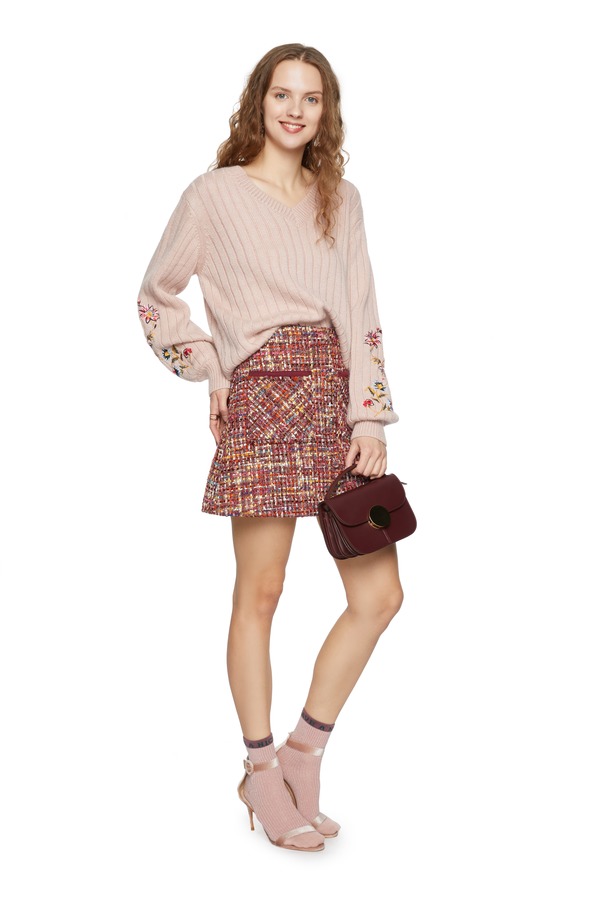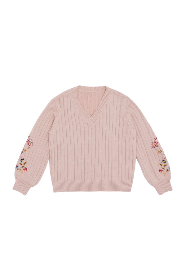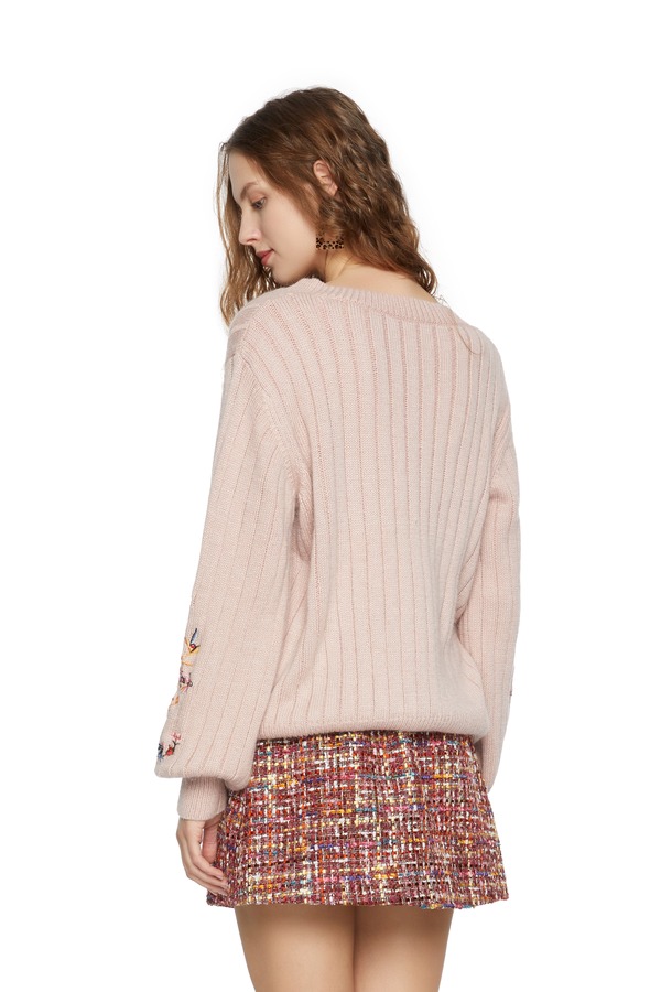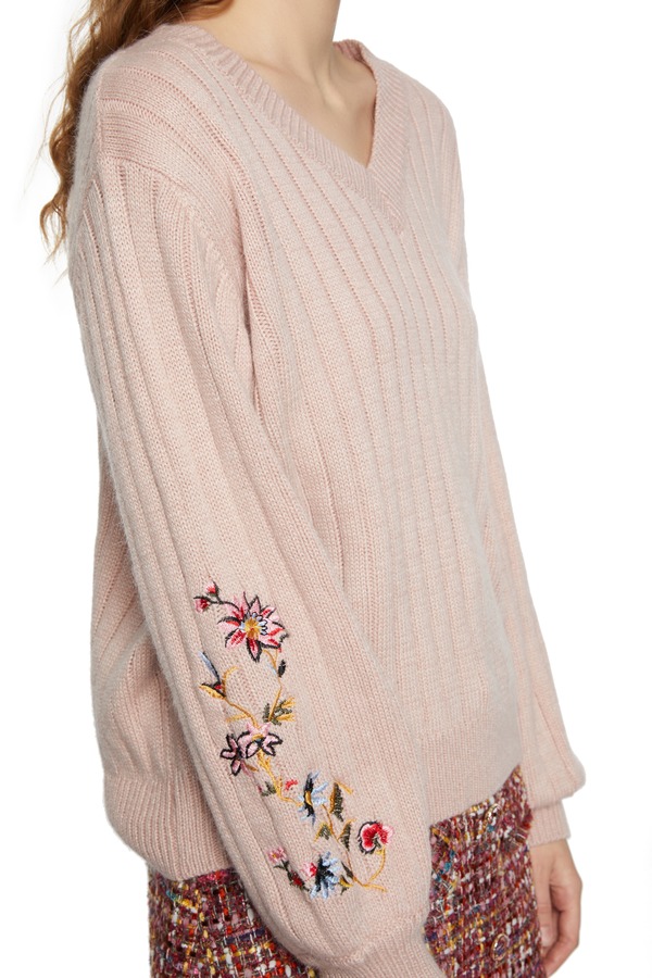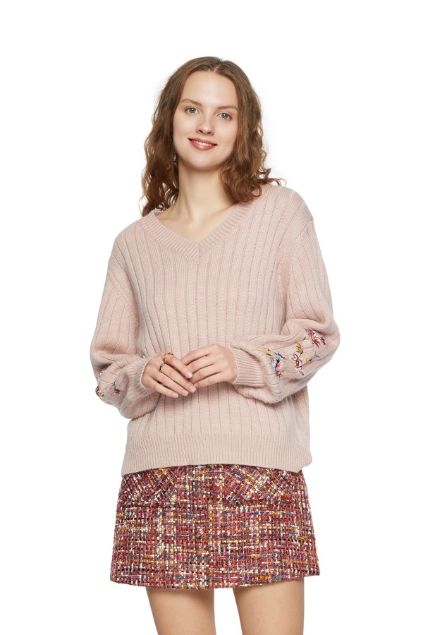 EVA OUXIU伊华欧秀 V领刺绣粉色毛衣 5746