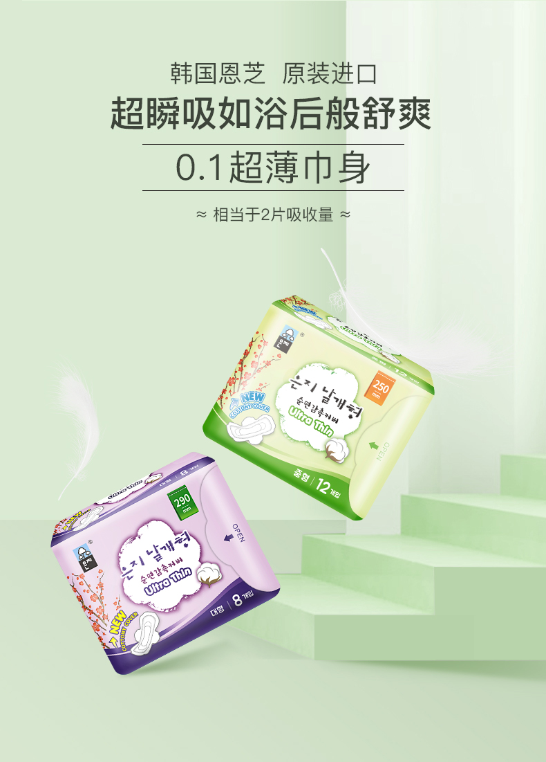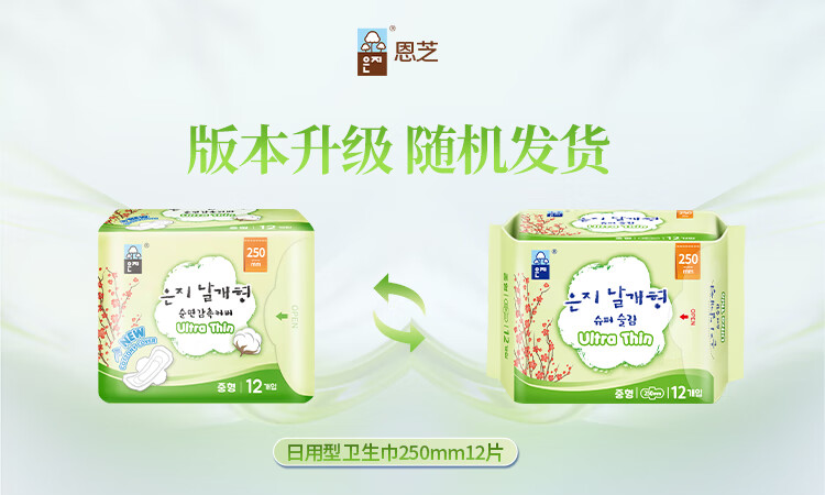 【2包装】恩芝(Eunjee)韩国进口超薄透气护翼型姨妈巾日用卫生巾250mm*12片/包