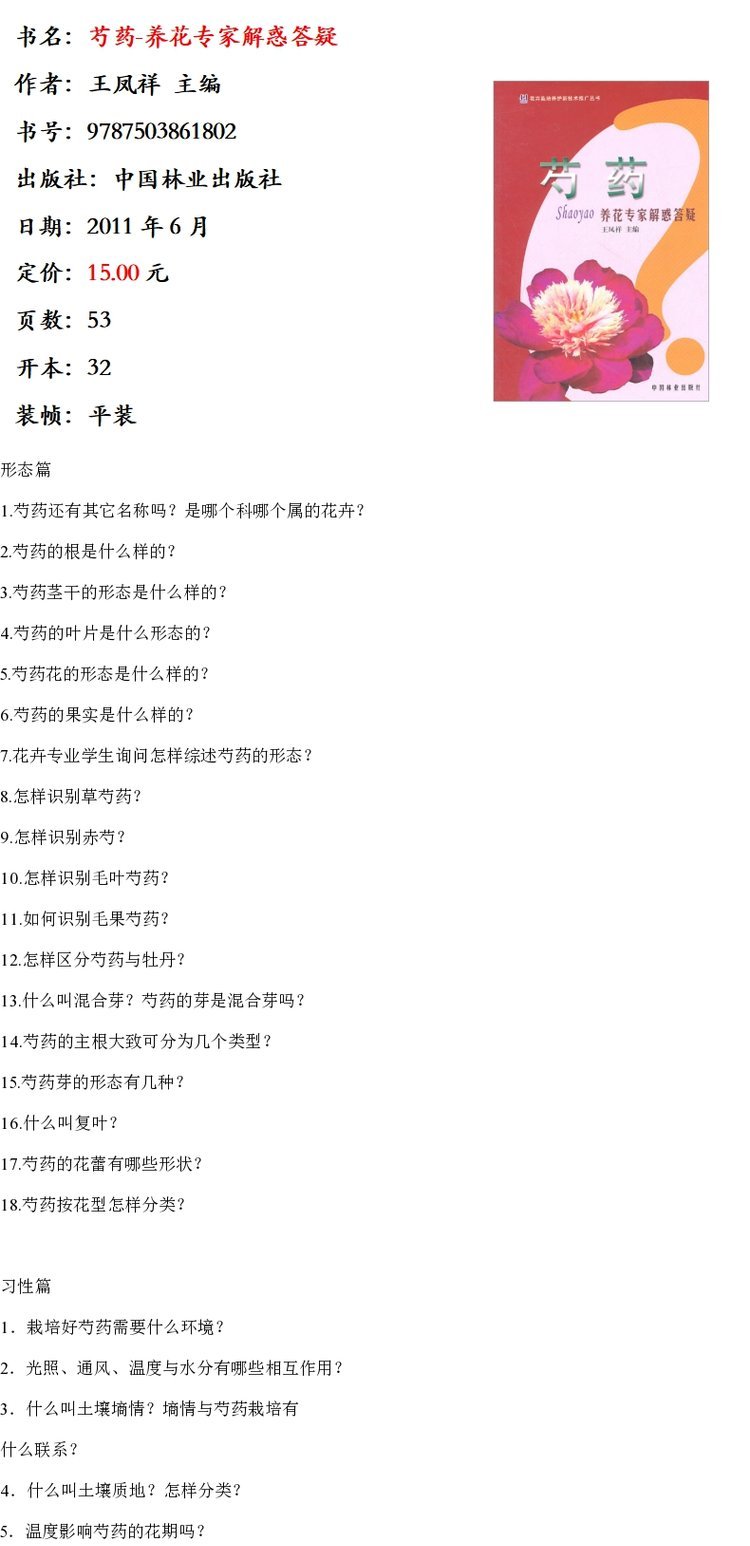 芍药 养花专家解惑答疑6180 王凤祥著作花卉栽培养护新技术推广丛书形态习性繁殖栽培病虫害防治花卉培育中国林业出版社畅销书