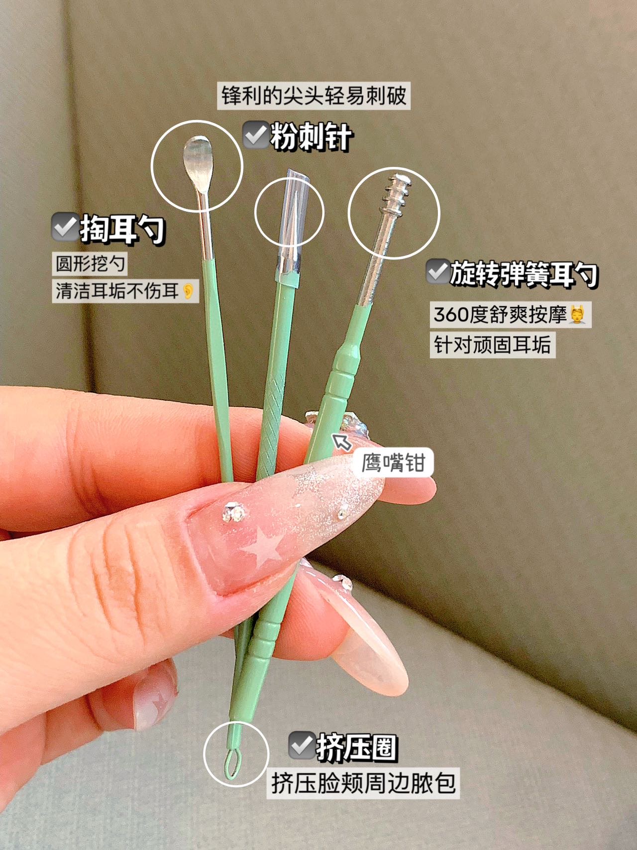 3️⃣挖耳勺圆形挖勺,轻松清洁耳垢。