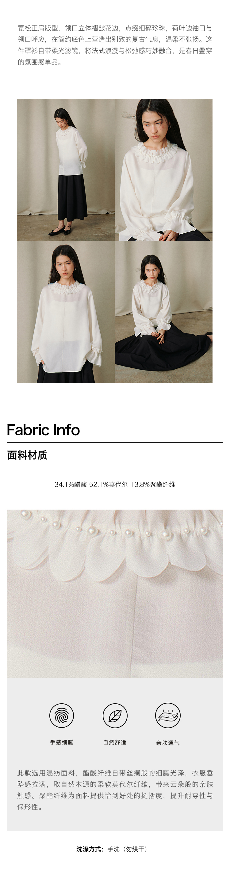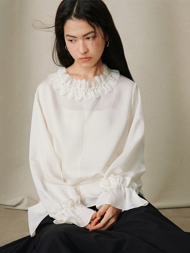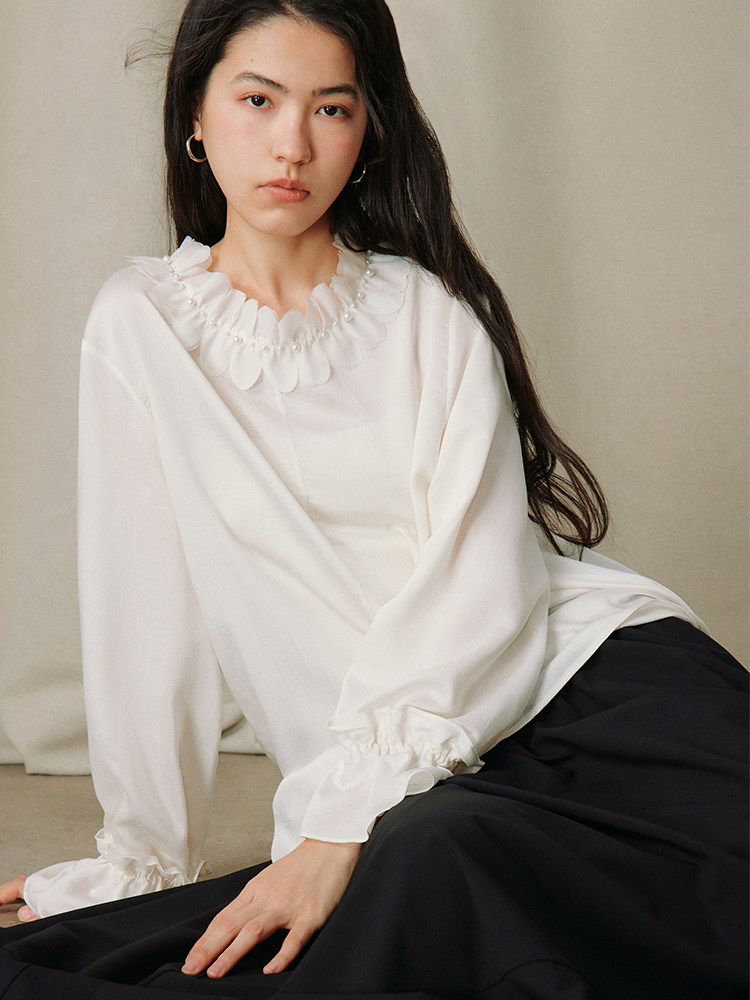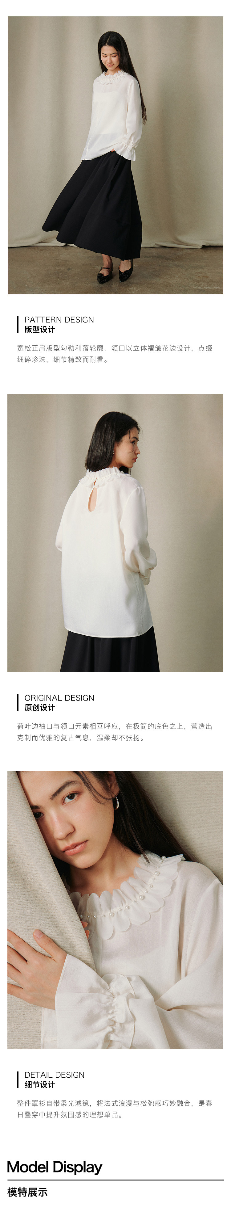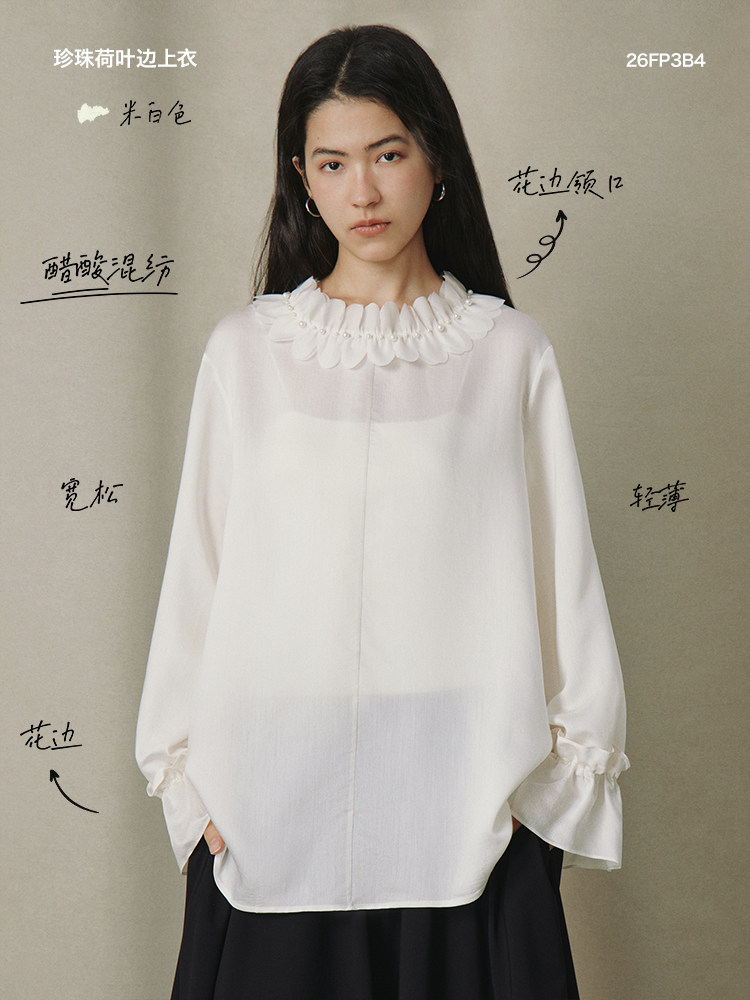 ForPoem 26/SS 原创设计珍珠荷叶边领口上衣米白