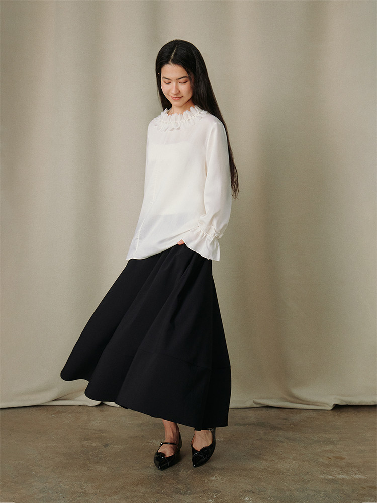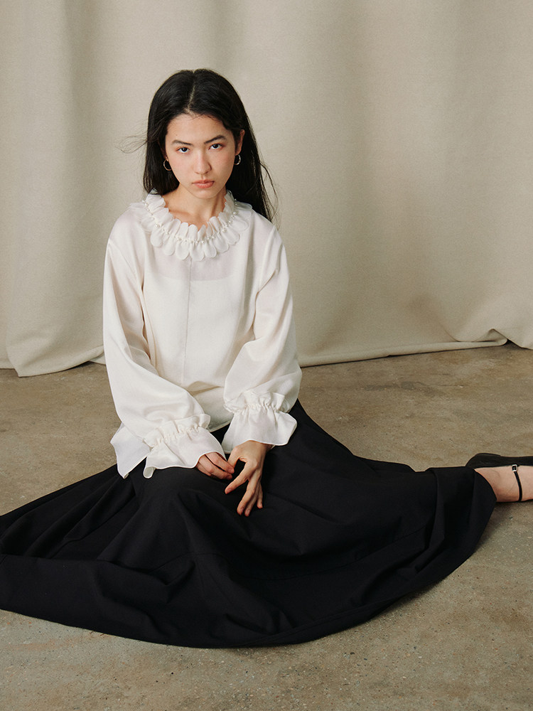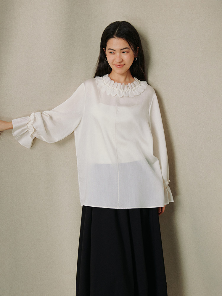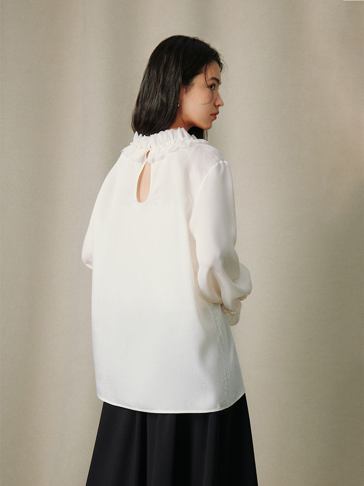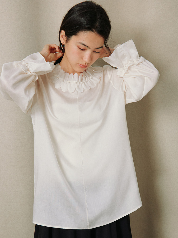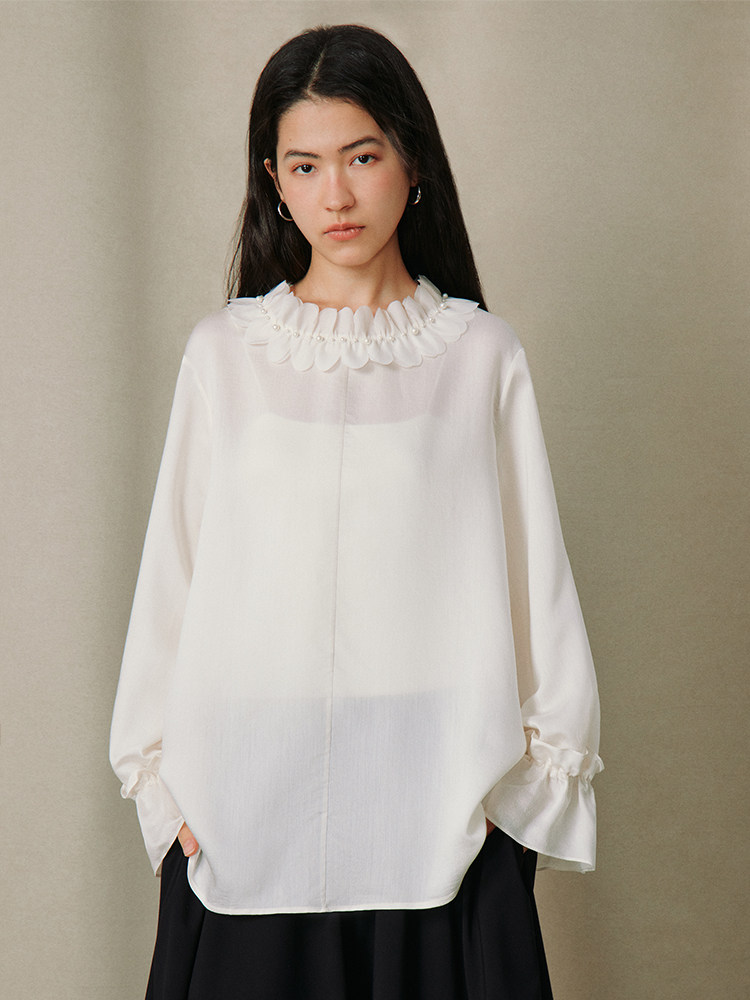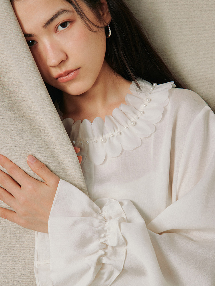 ForPoem 26/SS 原创设计珍珠荷叶边领口上衣米白