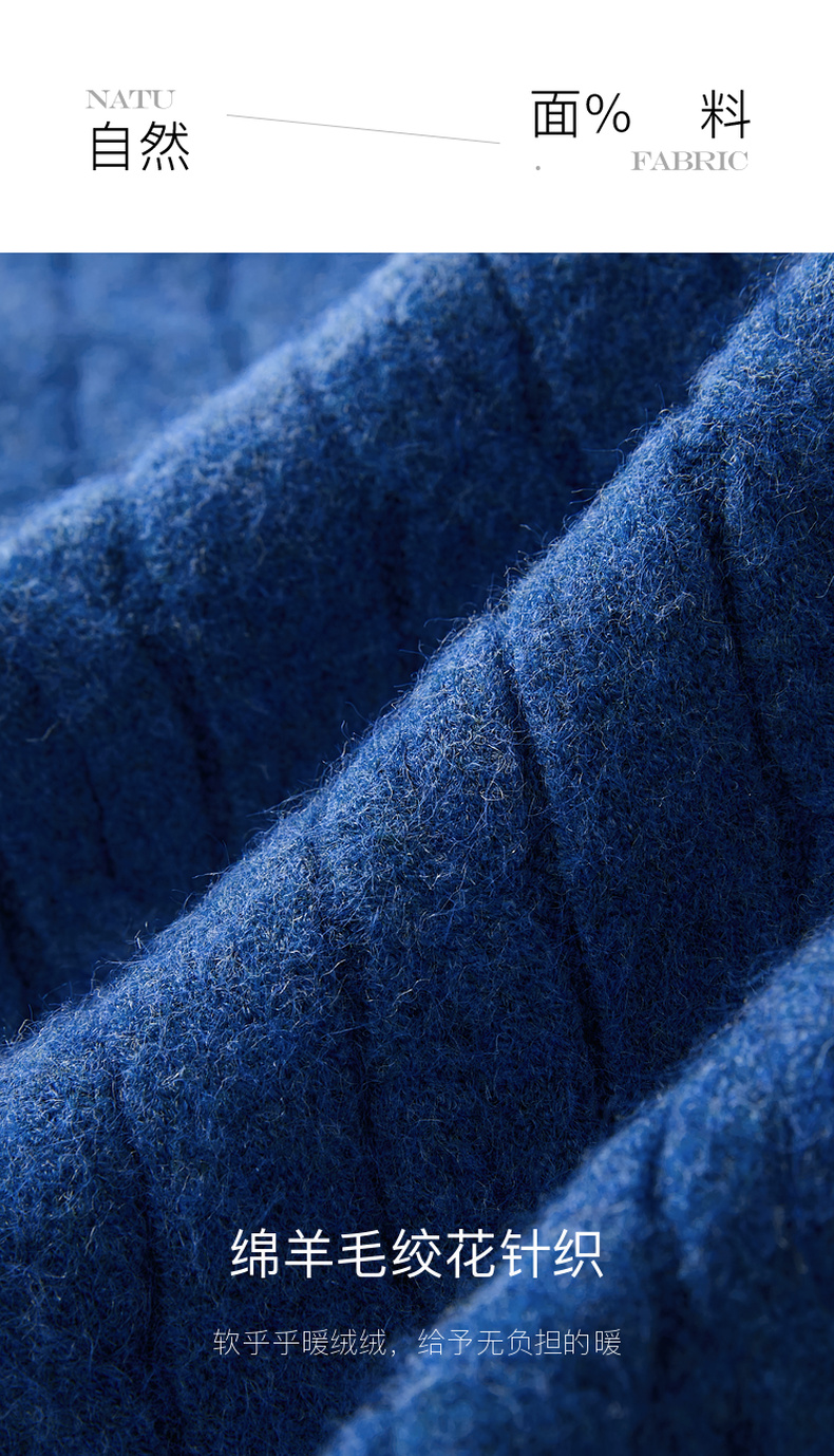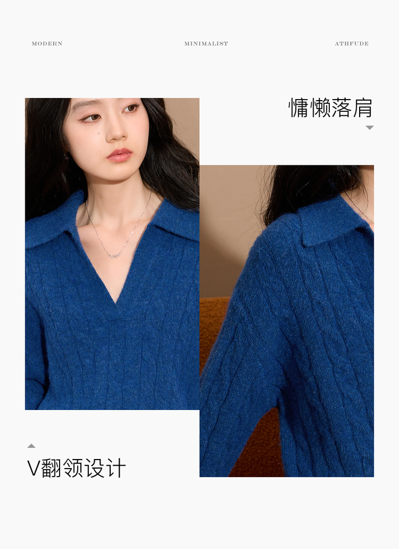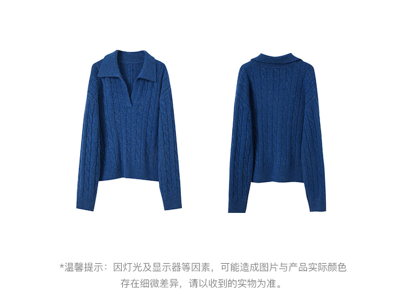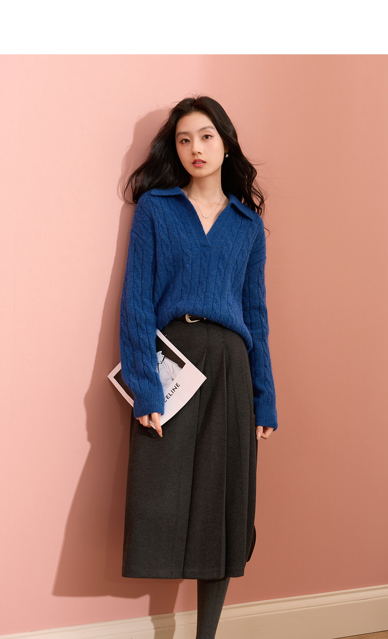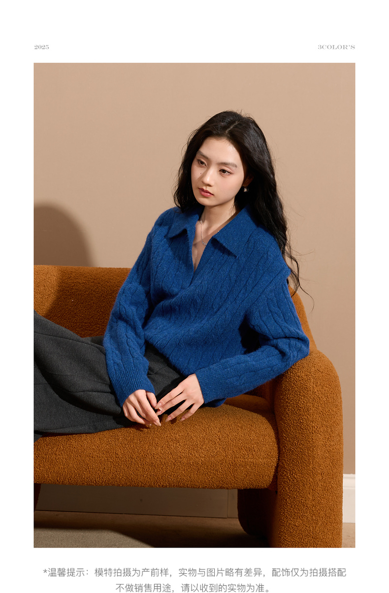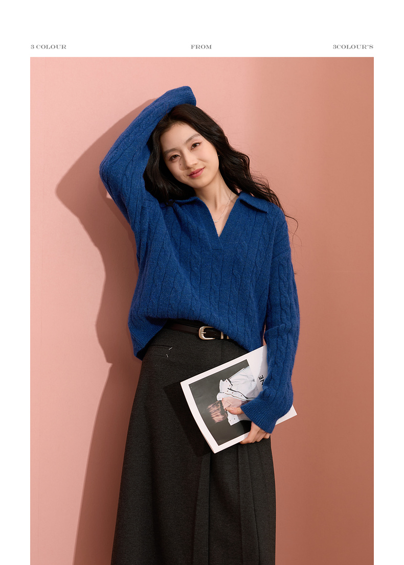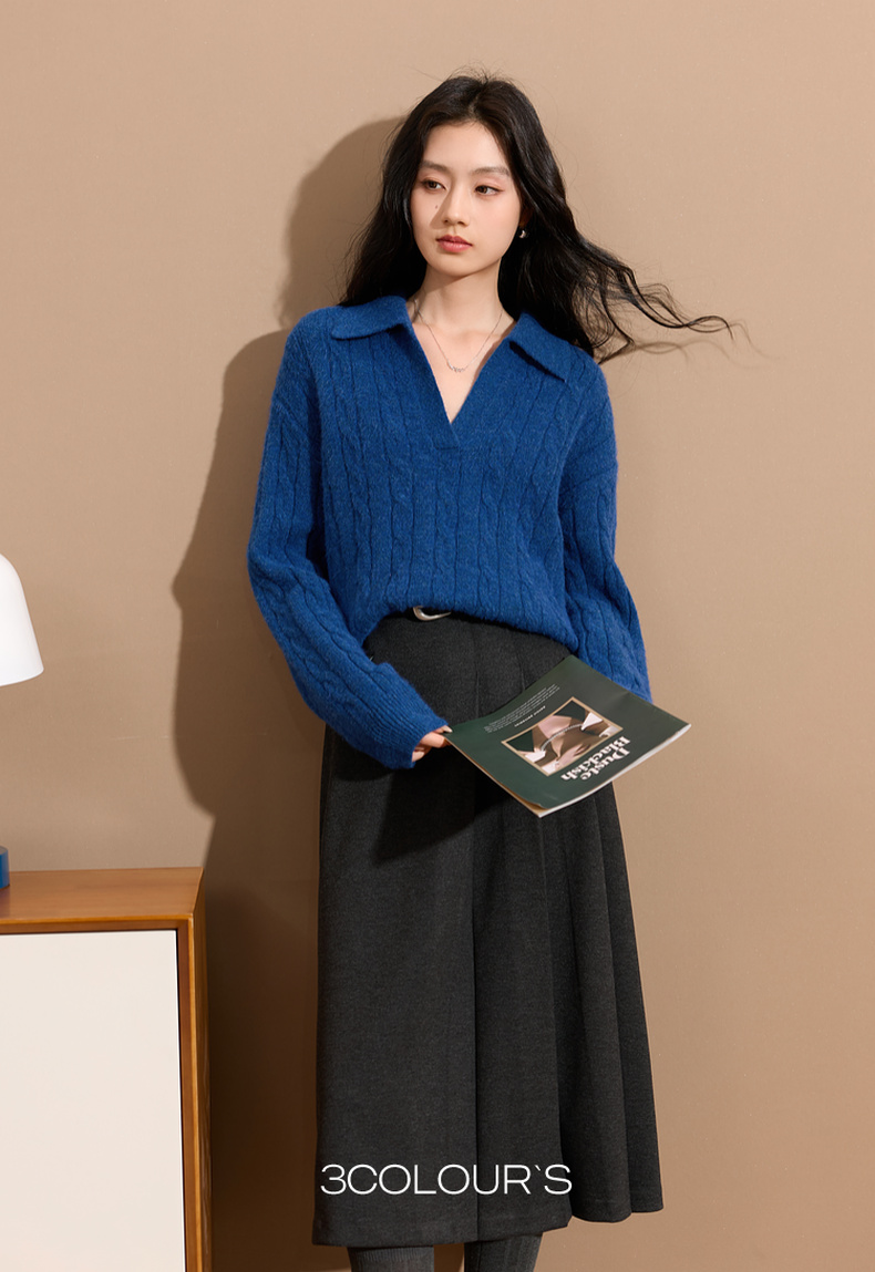 三彩2025冬季新款复古绞花翻领针织衫宽松保暖套头毛衫高级感S