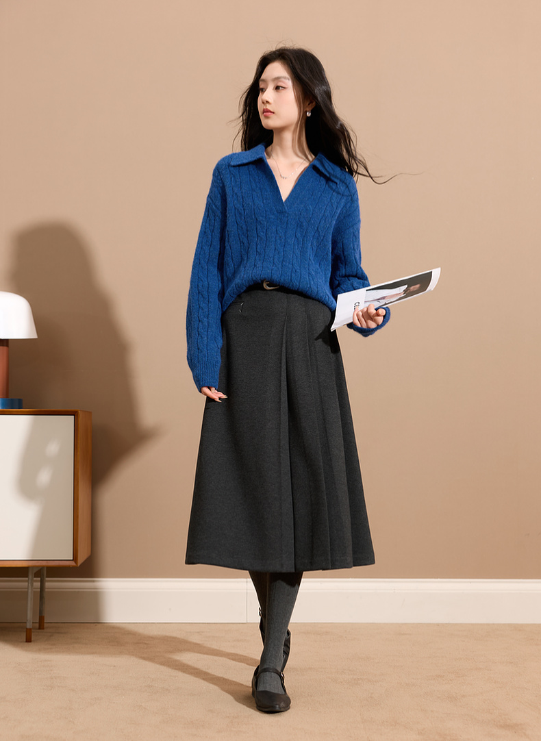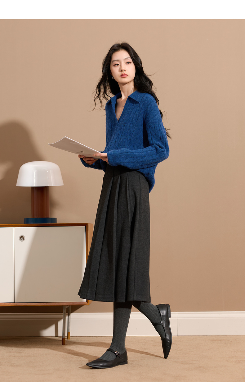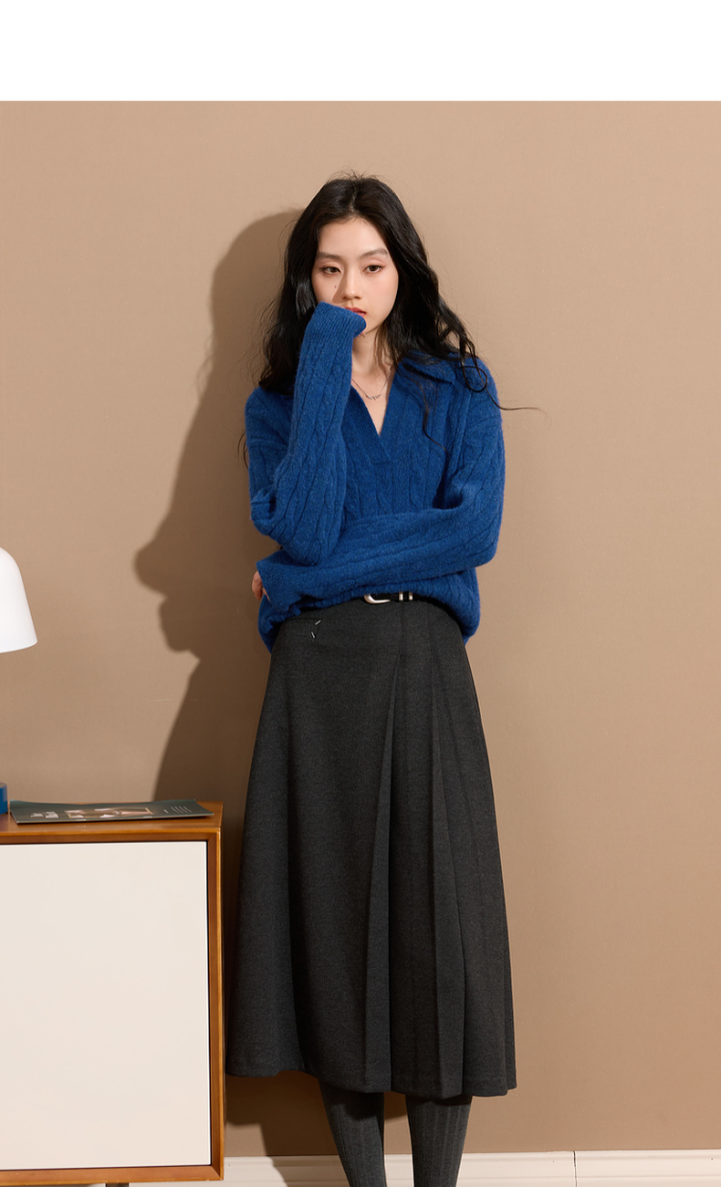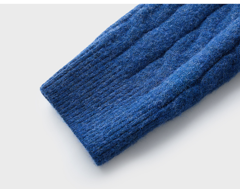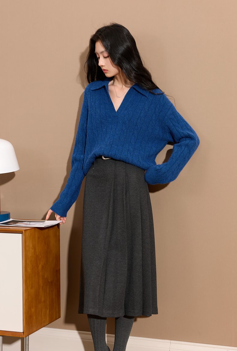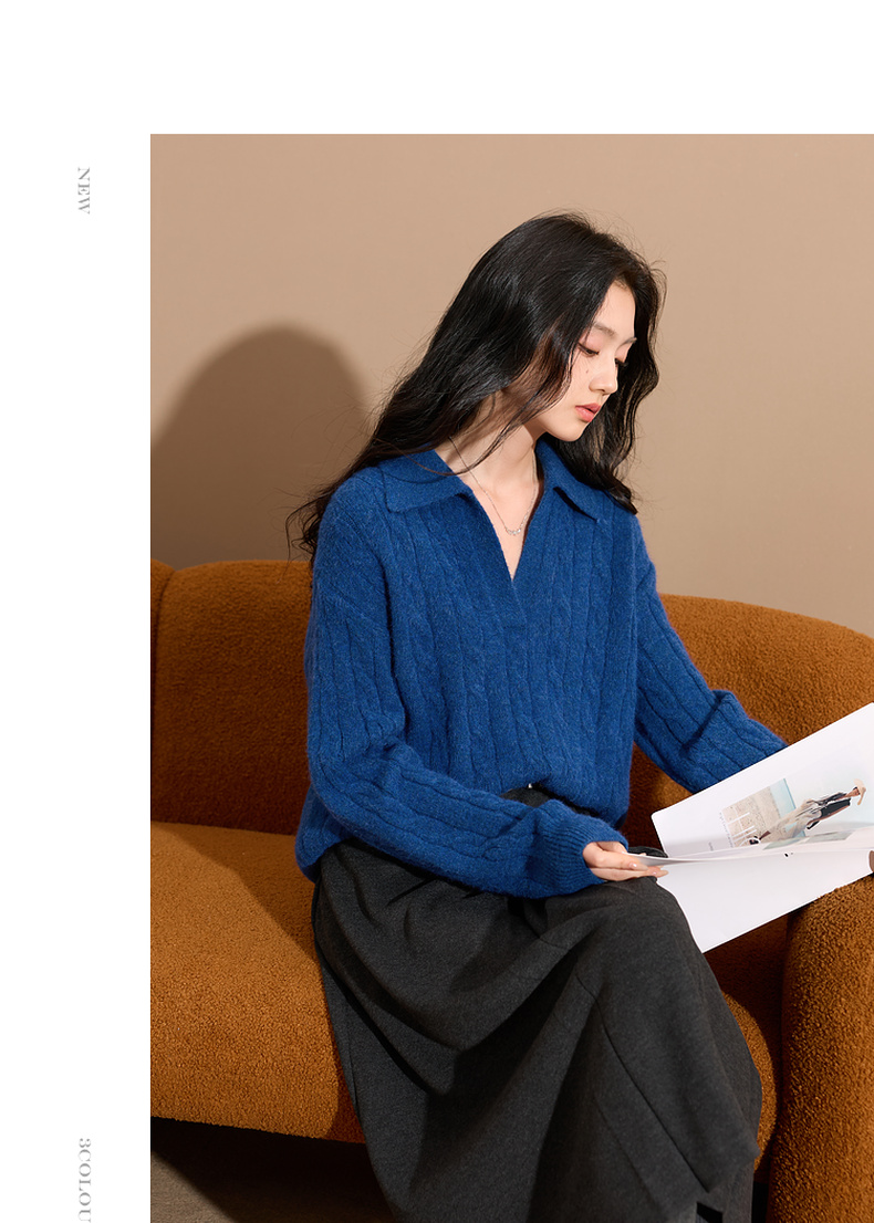 三彩2025冬季新款复古绞花翻领针织衫宽松保暖套头毛衫高级感S