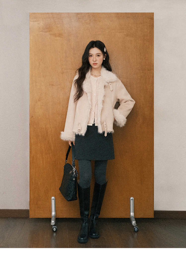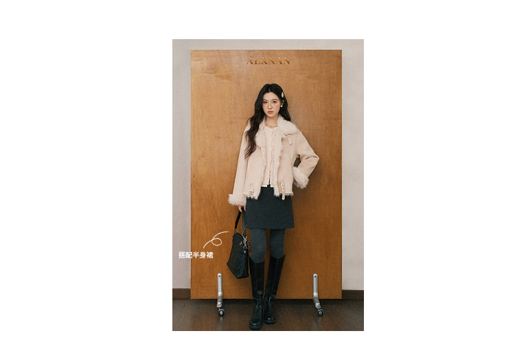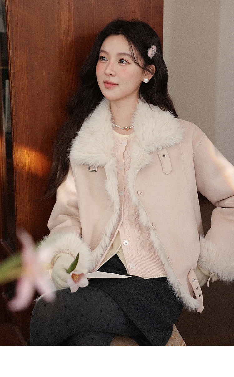 鹿向南「雪莉玫粉」浅粉色皮毛一体短外套女秋冬气质毛绒翻领上衣