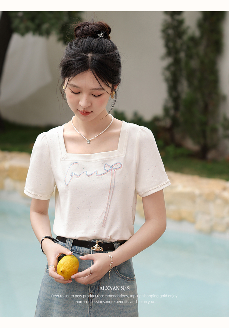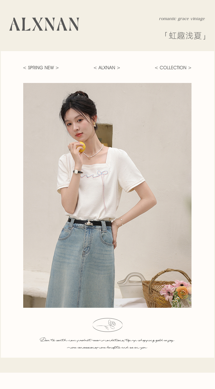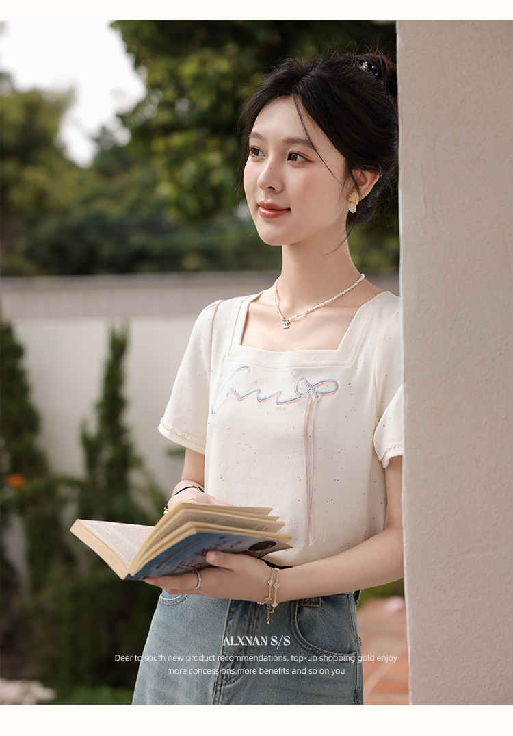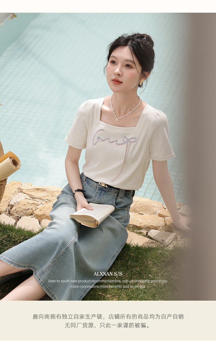 鹿向南「虹趣浅夏」杏色方领T恤2025夏季新款时尚短袖上衣女L53706