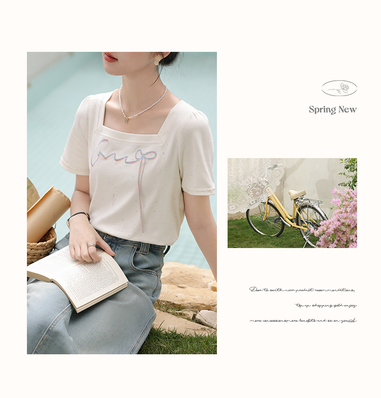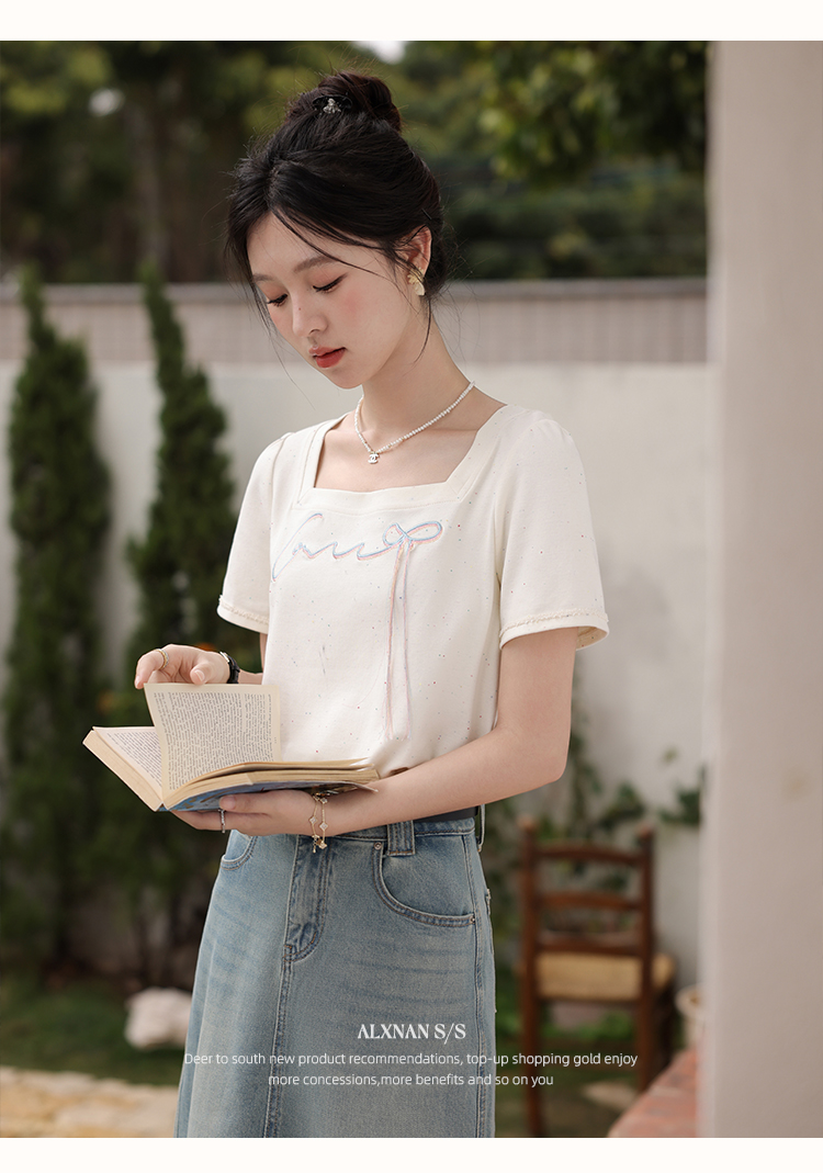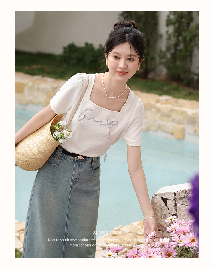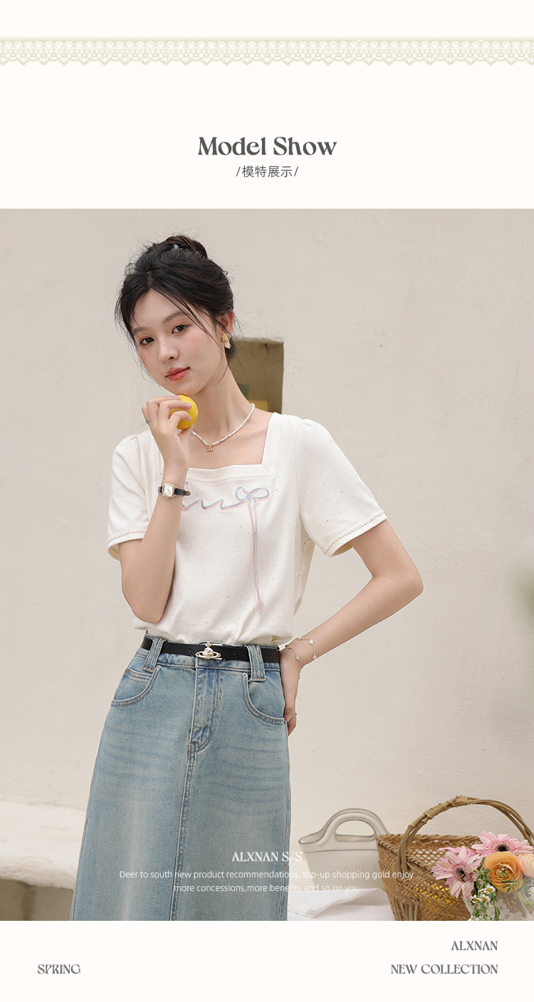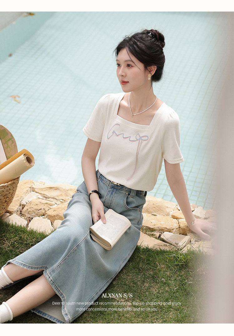鹿向南「虹趣浅夏」杏色方领T恤2025夏季新款时尚短袖上衣女L53706