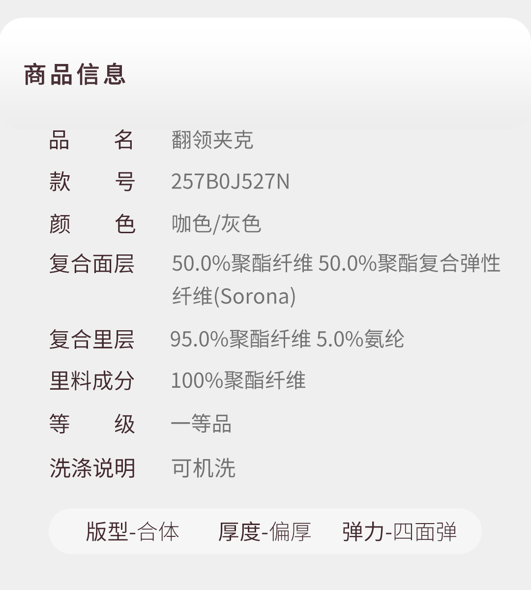 领航五号男士翻领夹克257B0J527NSorona混纺面料耐磨保暖[门店专款]