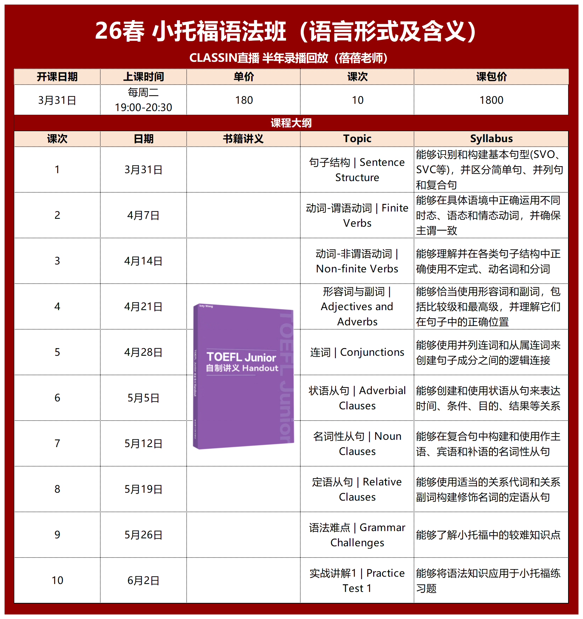 系统提升孩子在英语语法、词汇与句子结构上的掌握程度和应试能力,作为【小托福冲刺班】的前导课程,专为语法基础薄弱的孩子而设计,直击小托福语法考点、重难点与易错点,帮助孩子在语法板块上拿高分。