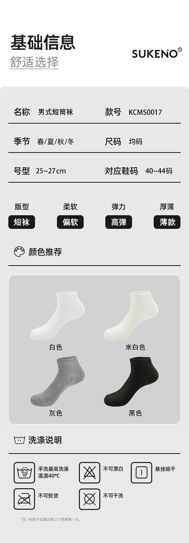 SUKENO夏季薄款男袜棉感亲肤透气短筒袜子