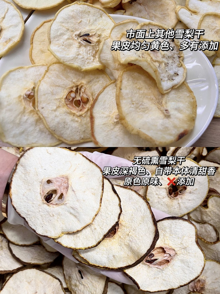通过太阳晒干或低温烘干的雪梨片🍐 去除雪梨的凉性 更适合大部分宝子们 味道清甜 大人小孩都爱喝 煲汤也适合🤭 自然烘干 🈚️熏硫的雪梨看着丑丑的 虽然不漂亮 但是纤维纹路明显 有些会出现淡黄色 红色 黑边 新鲜雪梨加工之前经过清洗 表皮有水分💧 生晒之后会发生氧化 导致表皮变黑🤭 都是梨干自然氧化的现象 实属正常🉑 对比金黄雪白的雪梨干更为健康!!