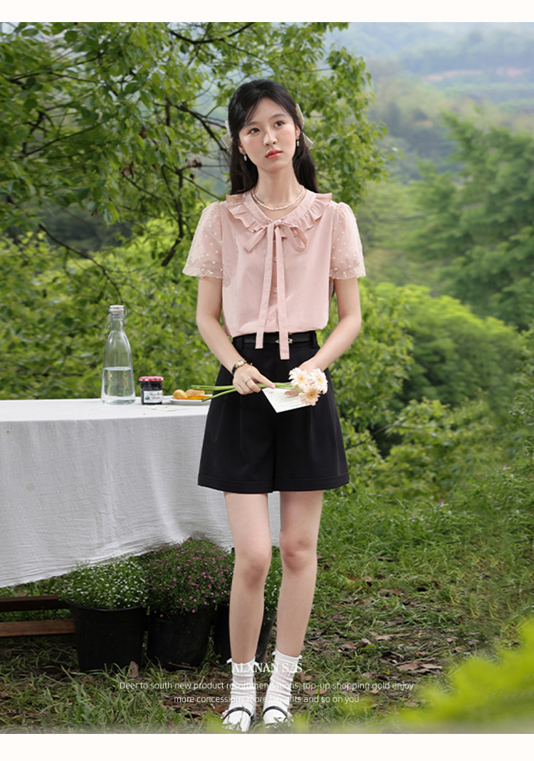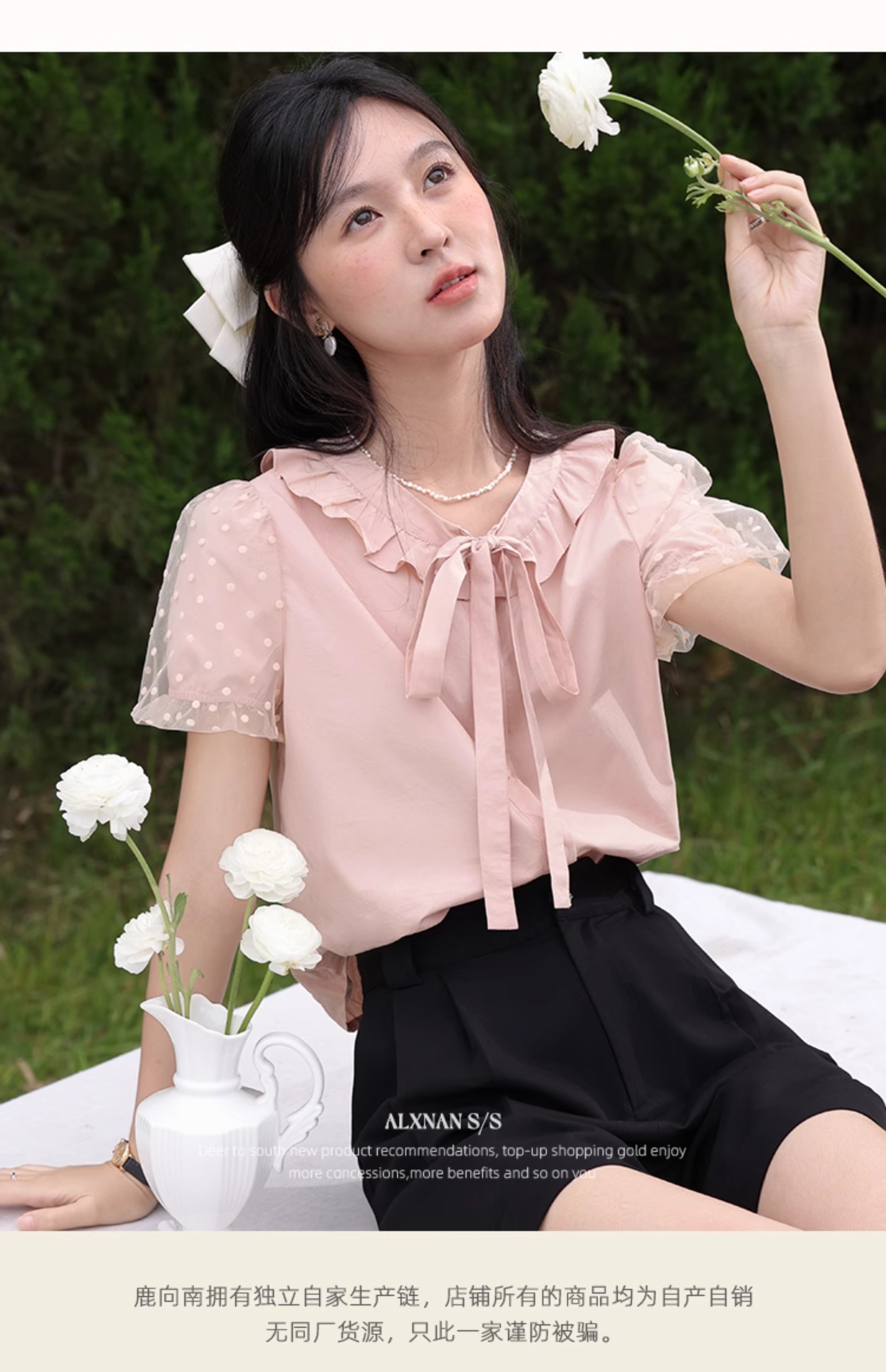 【6折秒杀】鹿向南「微熹樱红」法式黑白格子娃娃领衬衫女秋宽松显瘦长袖上衣L56770