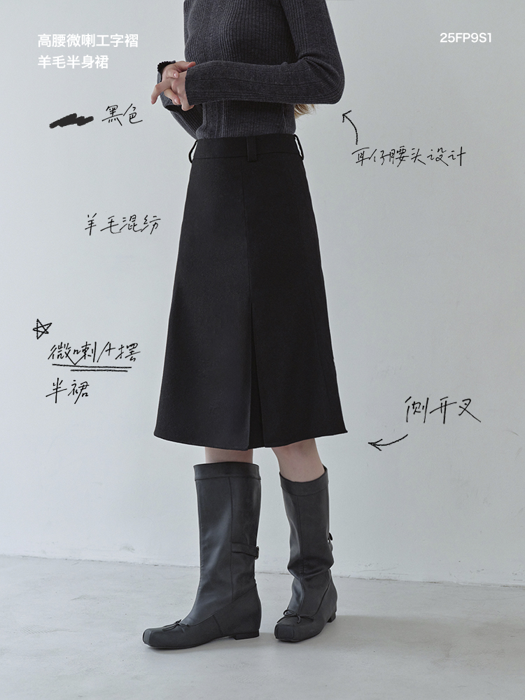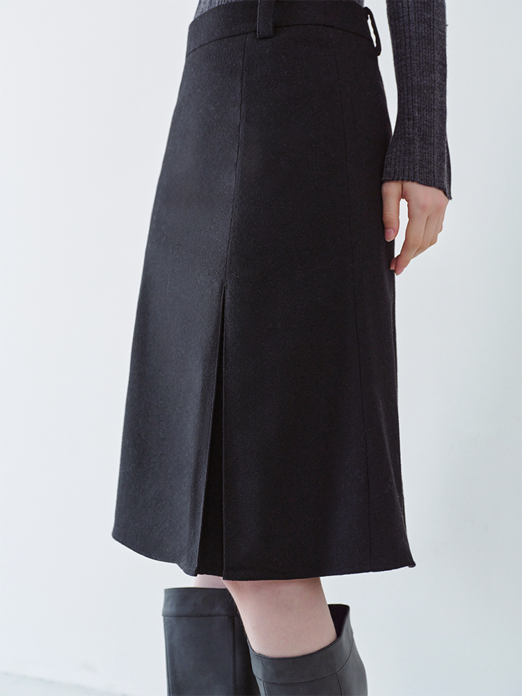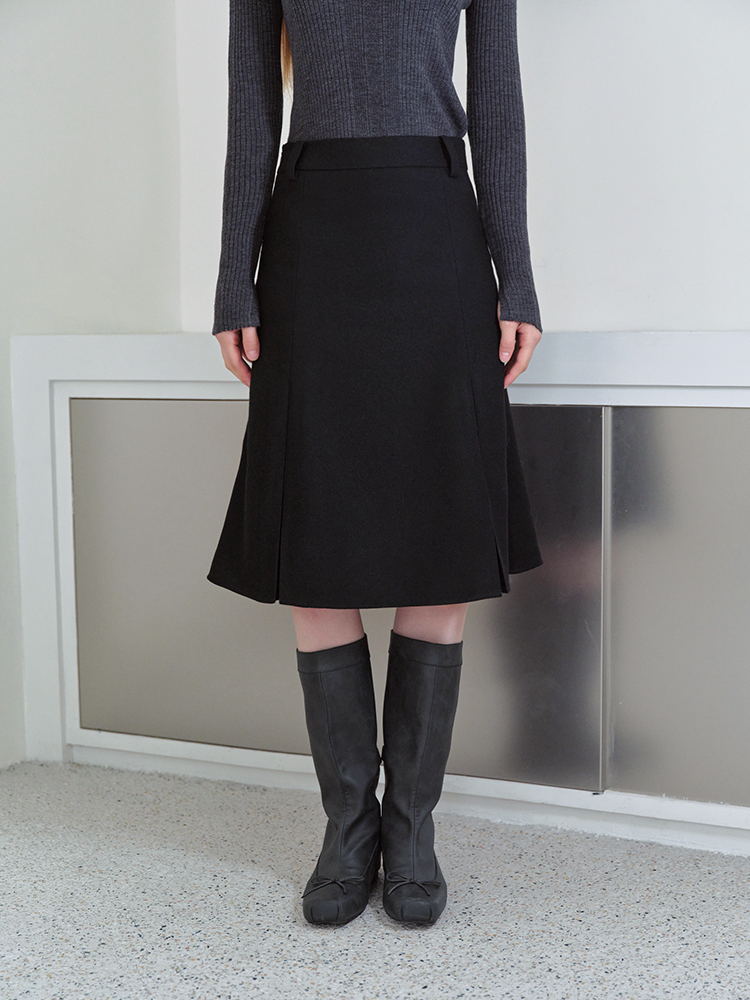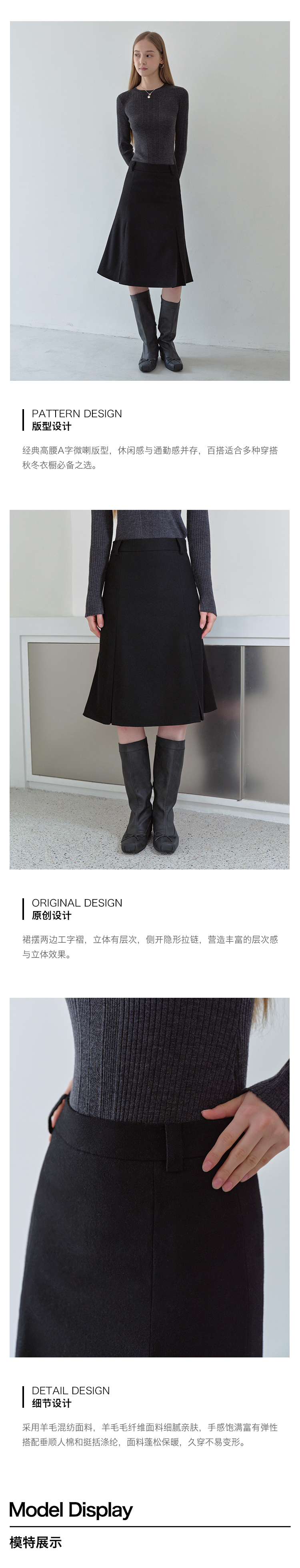 ForPoem 现货 25/FW原创设计中腰微喇工字褶黑色羊毛中裙半身裙