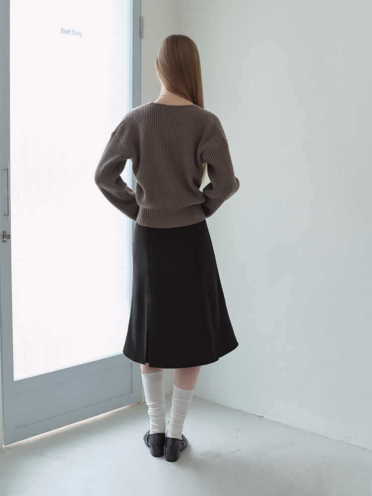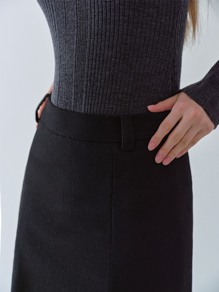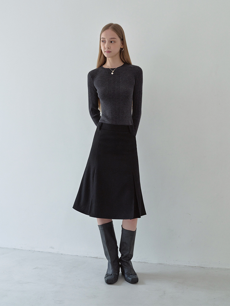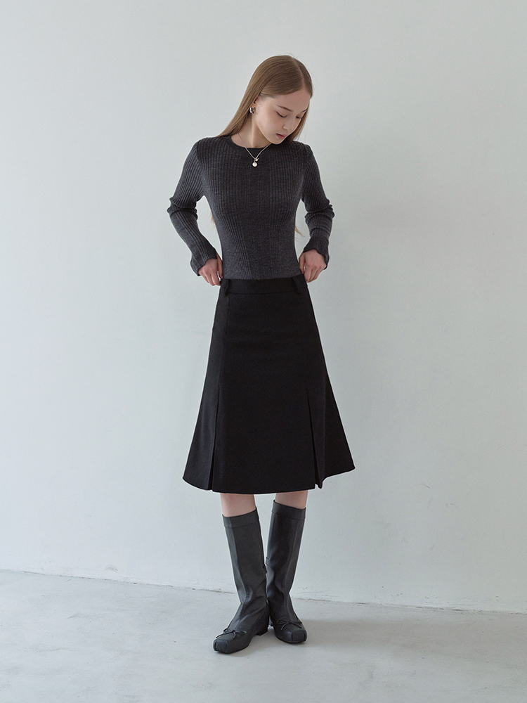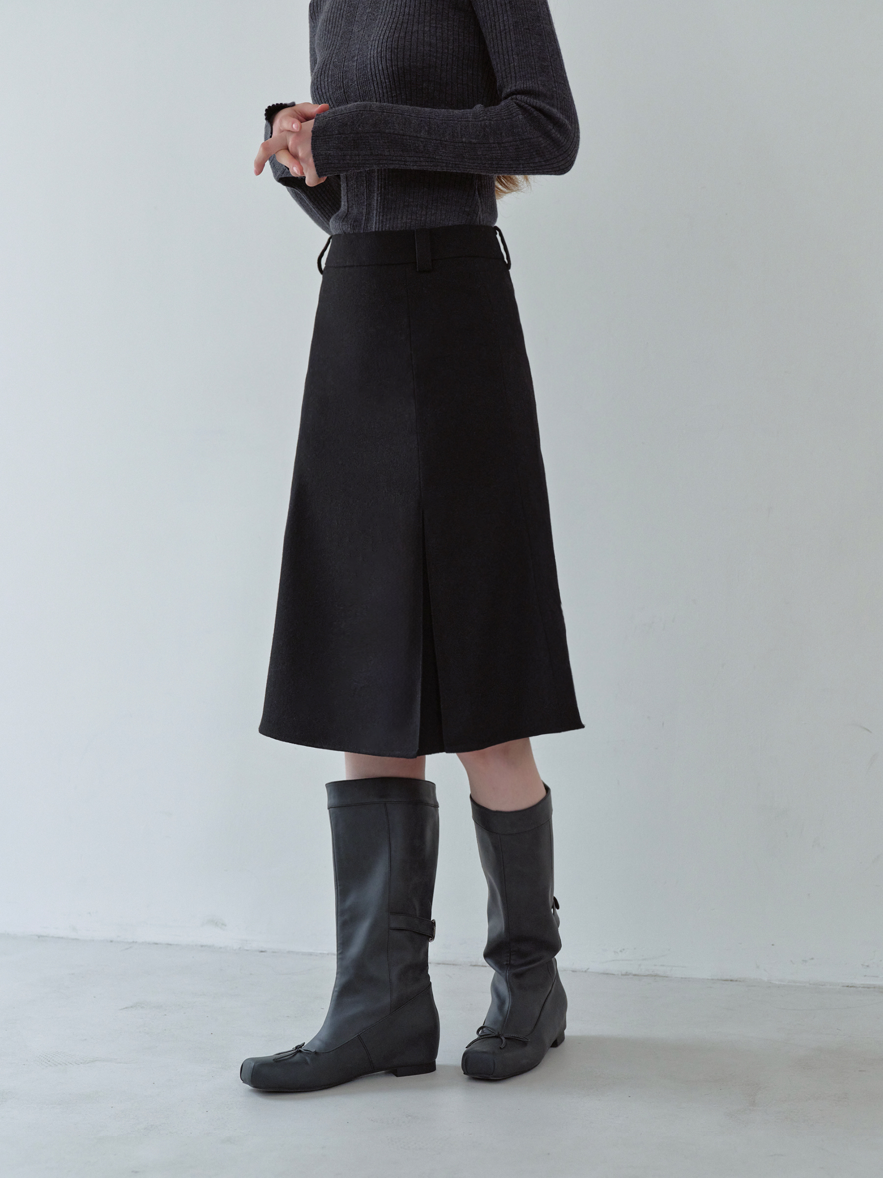 ForPoem 现货 25/FW原创设计中腰微喇工字褶黑色羊毛中裙半身裙
