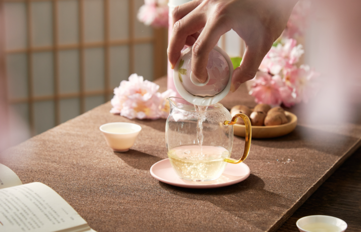 花香袅袅,茶香清透,茶汤中倒影的一抹淡淡的粉色,仿若将春的温柔尽收于底。