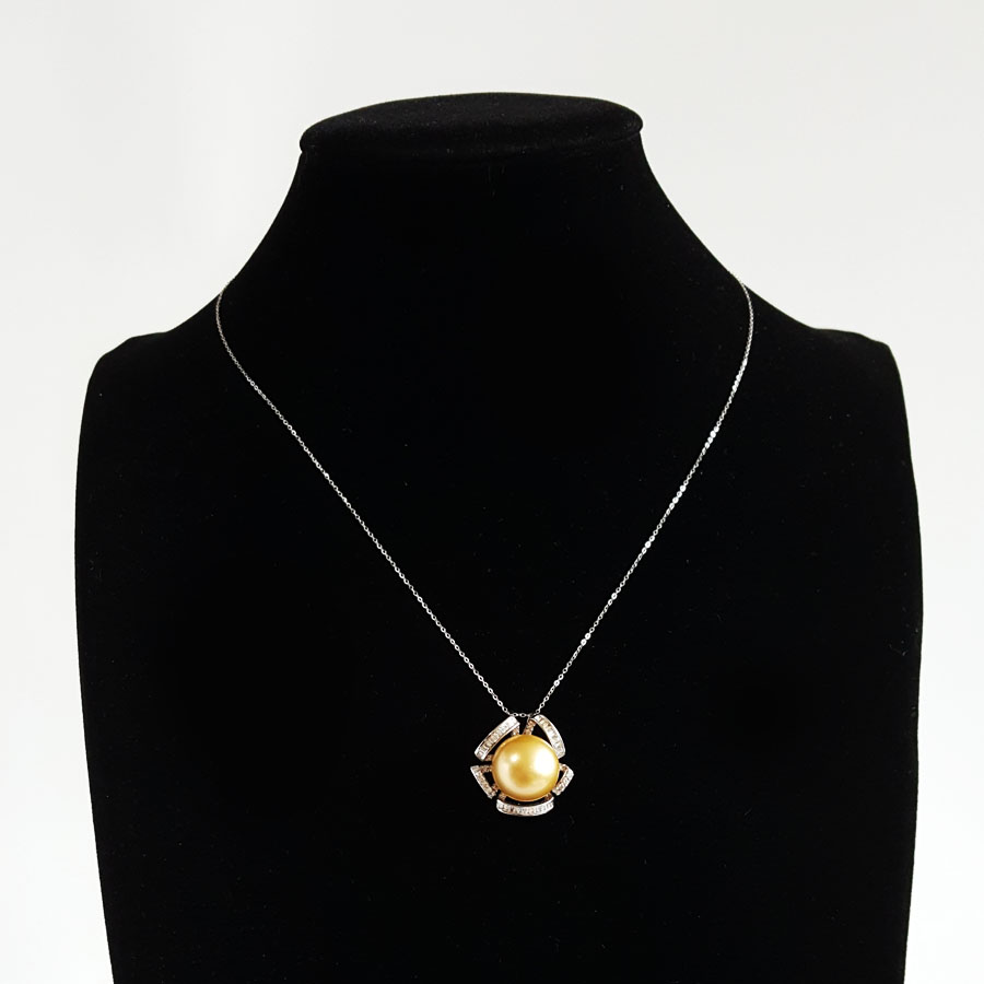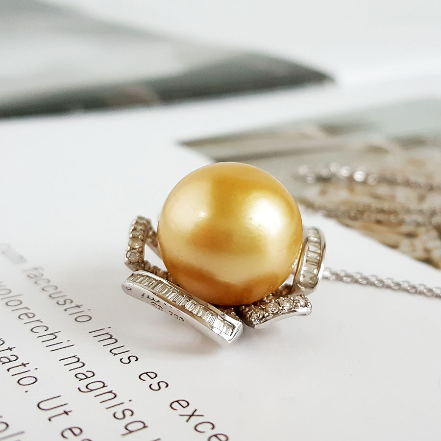 【天然正品】AU750收藏级白金镶钻镶天然近完美约14.5MM金色南洋海水珍珠吊坠项链链长:45CM(长度可调节)女士280925TJ17