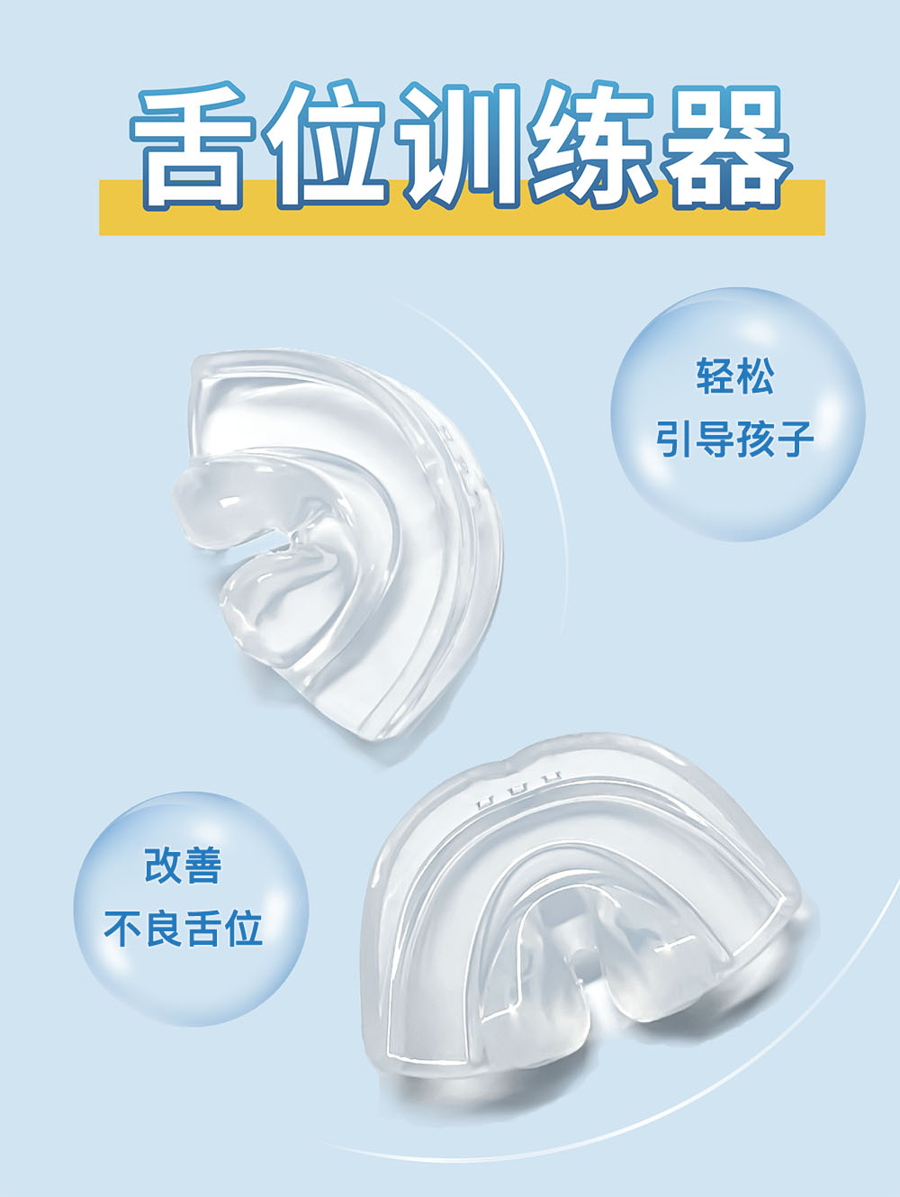舌位训练器由医用硅胶制成,由弧形唇挡、𬌗垫和舌侧结构三个 部分组成,非无菌提供。
