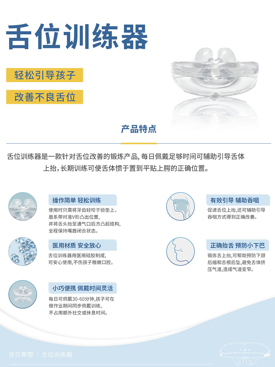 舌位训练器是一款主要针对舌位的训练装置, 牙列内侧舌肌 置于舌侧凸起结构上,可以有效训练舌体上抬,达到平贴上腭的 正确舌位。