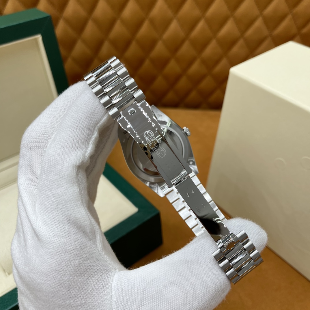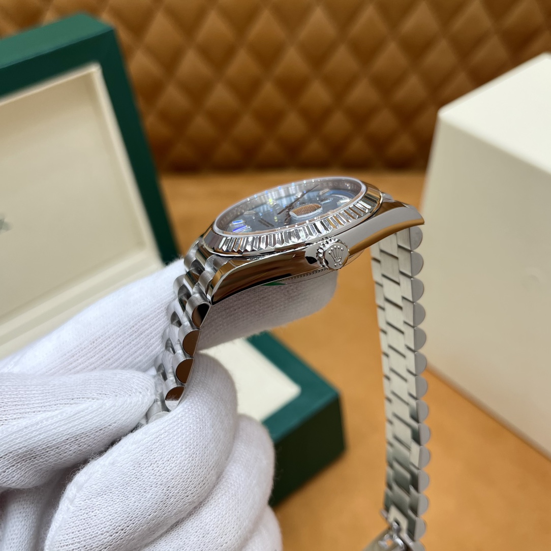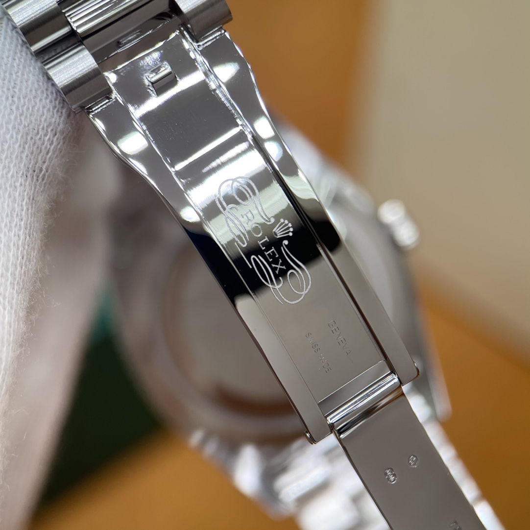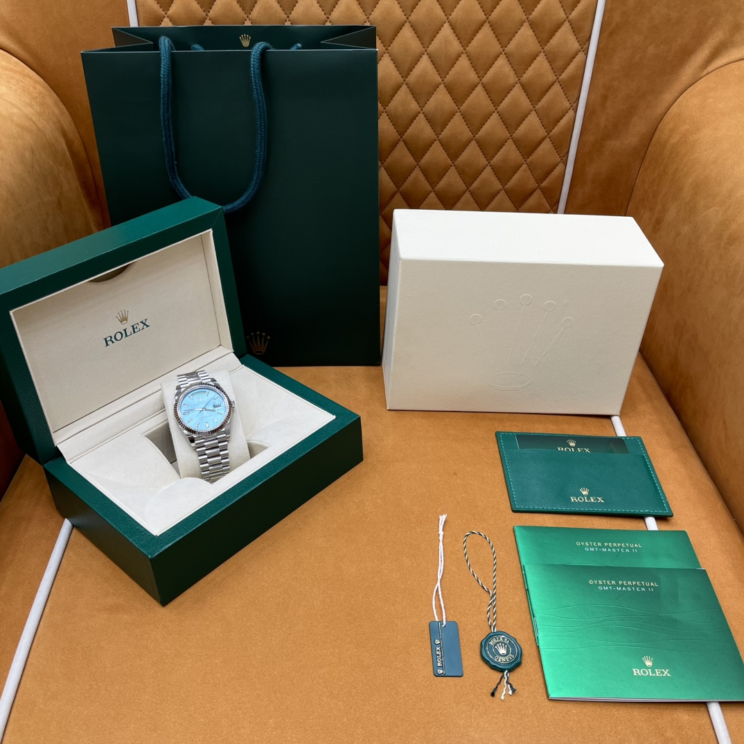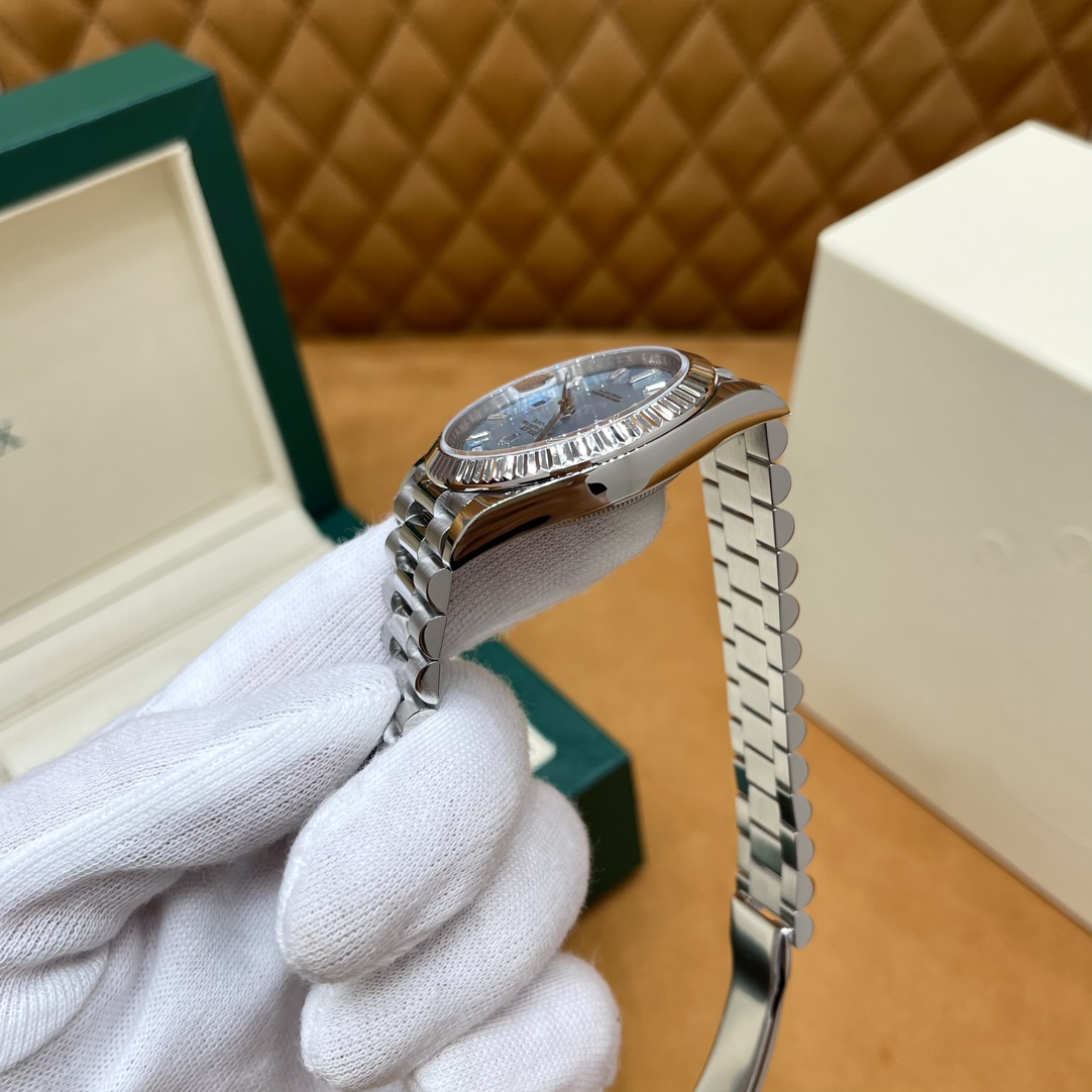 🏷️星期日历型系列 冰蓝日志DD (40mm) M228236-0006 这款冰蓝日志DD真的绝了!采用原版3255自动机械机芯,搭配高性能Paraflex缓震装置,和原版一致的厚度与尺寸,调时调日历功能完全同步,堪称完美复刻! 蓝宝石水晶镜面,搭配2.5倍放大镜的日历窗设计,实用又经典!每一处细节都融入了高科技与非凡美学,向劳力士这款传奇腕表的卓越传统致敬。 硬质合金蚝式钢表带,配备折叠式蚝式保险扣,表带与表耳无缝衔接,戴上它就能感受到满满的质感。高难度的龟壳外观开启方式不仅独特,锁扣紧密,推拉顺滑,佩戴起来压手感非常接近原版,非常安心!旋入式底盖和上链表冠设计,再次提升了整表的实用性和精致感。 尺寸:40mm