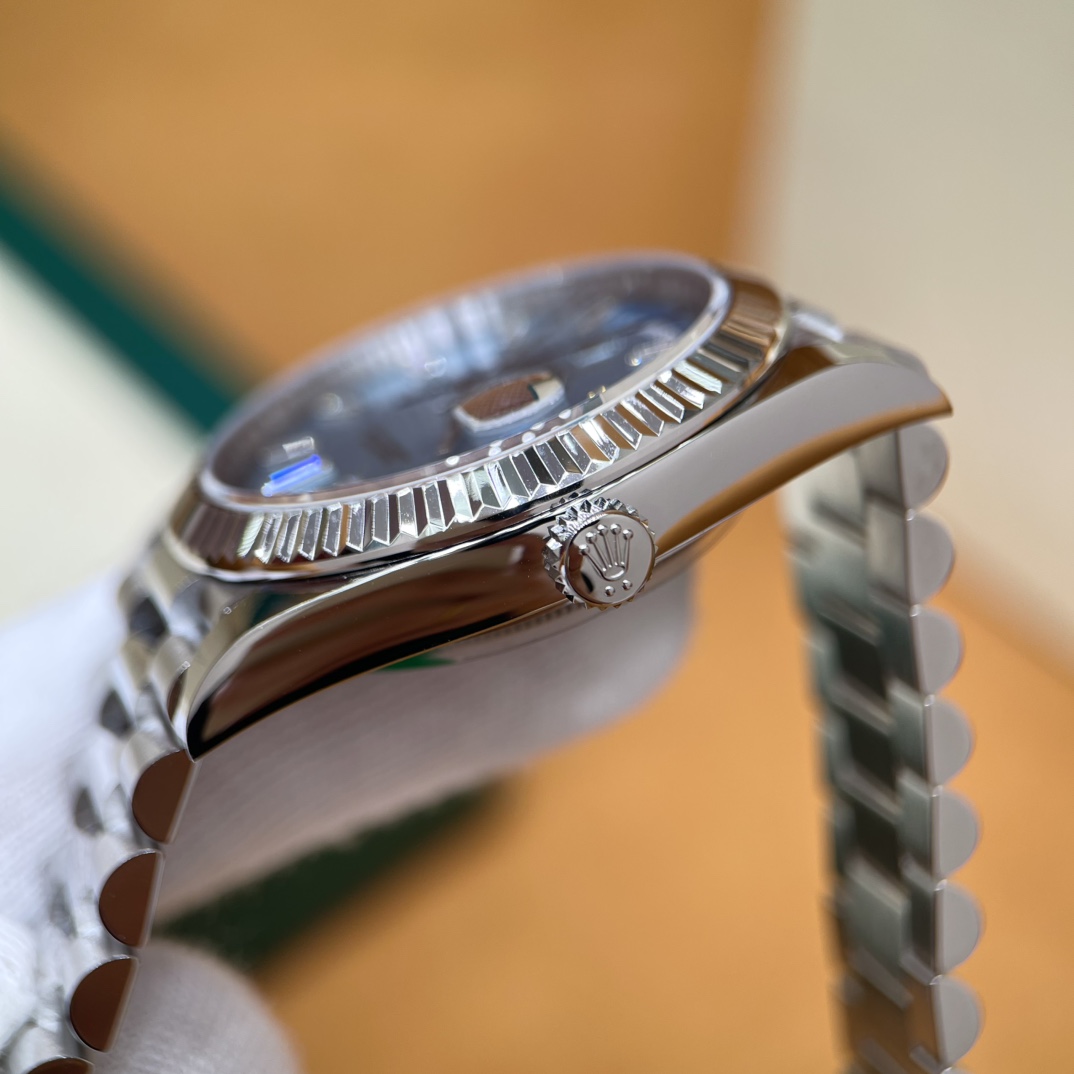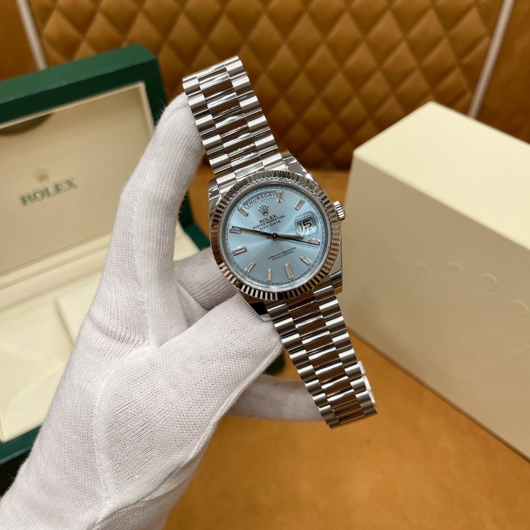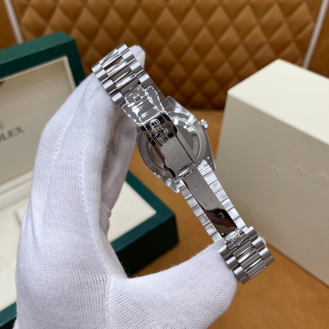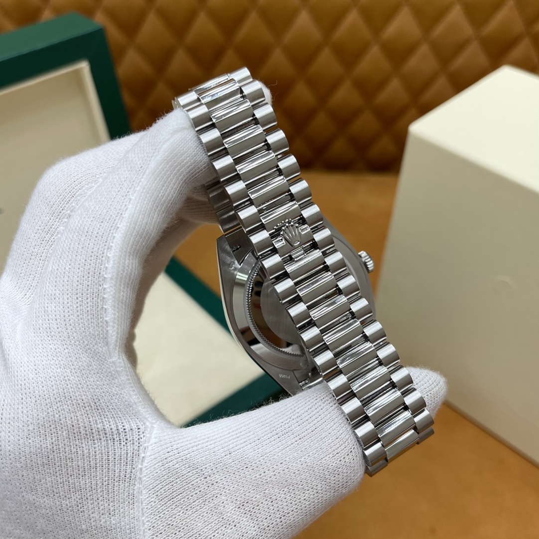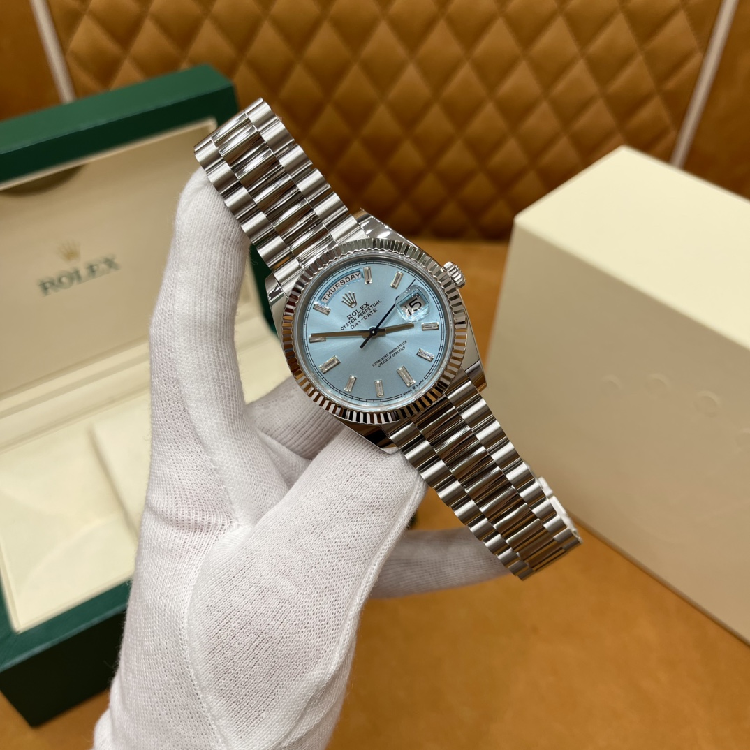 🏷️星期日历型系列 冰蓝日志DD (40mm) M228236-0006 这款冰蓝日志DD真的绝了!采用原版3255自动机械机芯,搭配高性能Paraflex缓震装置,和原版一致的厚度与尺寸,调时调日历功能完全同步,堪称完美复刻! 蓝宝石水晶镜面,搭配2.5倍放大镜的日历窗设计,实用又经典!每一处细节都融入了高科技与非凡美学,向劳力士这款传奇腕表的卓越传统致敬。 硬质合金蚝式钢表带,配备折叠式蚝式保险扣,表带与表耳无缝衔接,戴上它就能感受到满满的质感。高难度的龟壳外观开启方式不仅独特,锁扣紧密,推拉顺滑,佩戴起来压手感非常接近原版,非常安心!旋入式底盖和上链表冠设计,再次提升了整表的实用性和精致感。 尺寸:40mm