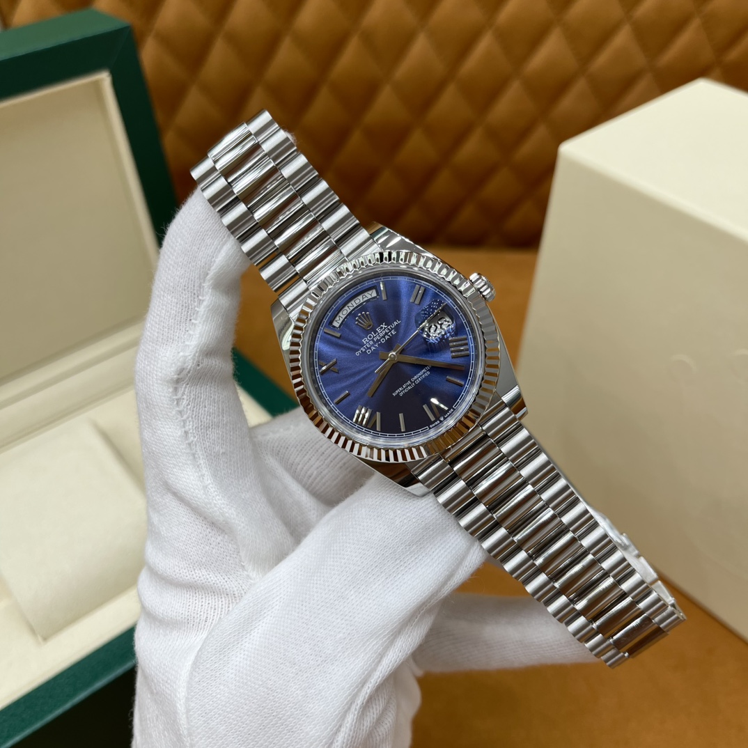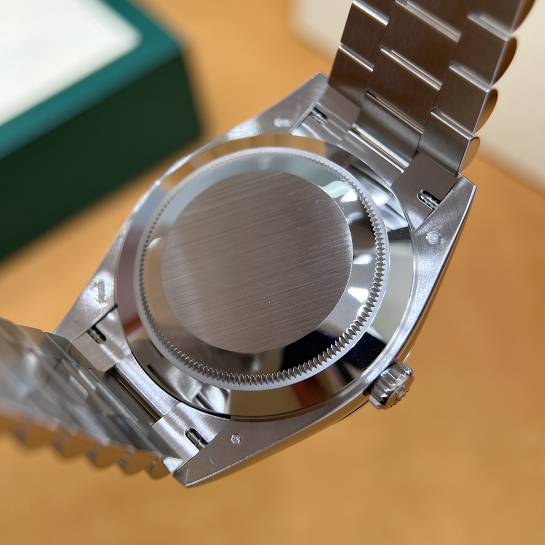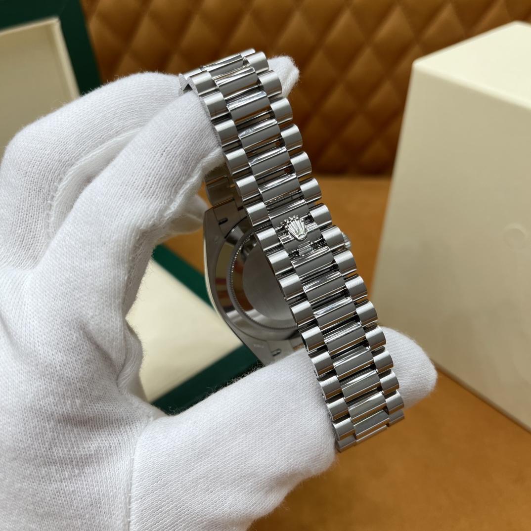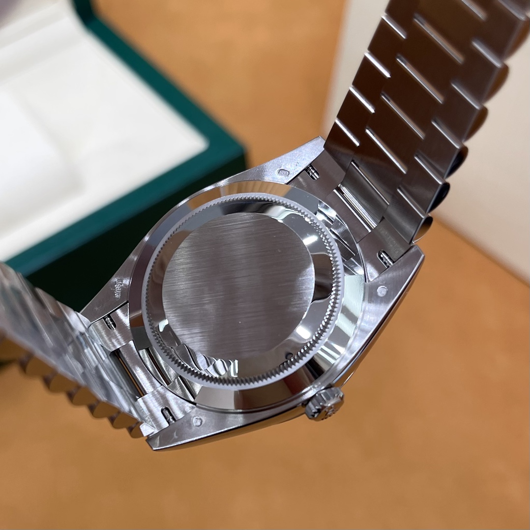 🏷️星期日历型系列 冰蓝日志DD (40mm) M228236-0006 这款冰蓝日志DD真的绝了!采用原版3255自动机械机芯,搭配高性能Paraflex缓震装置,和原版一致的厚度与尺寸,调时调日历功能完全同步,堪称完美复刻! 蓝宝石水晶镜面,搭配2.5倍放大镜的日历窗设计,实用又经典!每一处细节都融入了高科技与非凡美学,向劳力士这款传奇腕表的卓越传统致敬。 硬质合金蚝式钢表带,配备折叠式蚝式保险扣,表带与表耳无缝衔接,戴上它就能感受到满满的质感。高难度的龟壳外观开启方式不仅独特,锁扣紧密,推拉顺滑,佩戴起来压手感非常接近原版,非常安心!旋入式底盖和上链表冠设计,再次提升了整表的实用性和精致感。 尺寸:40mm