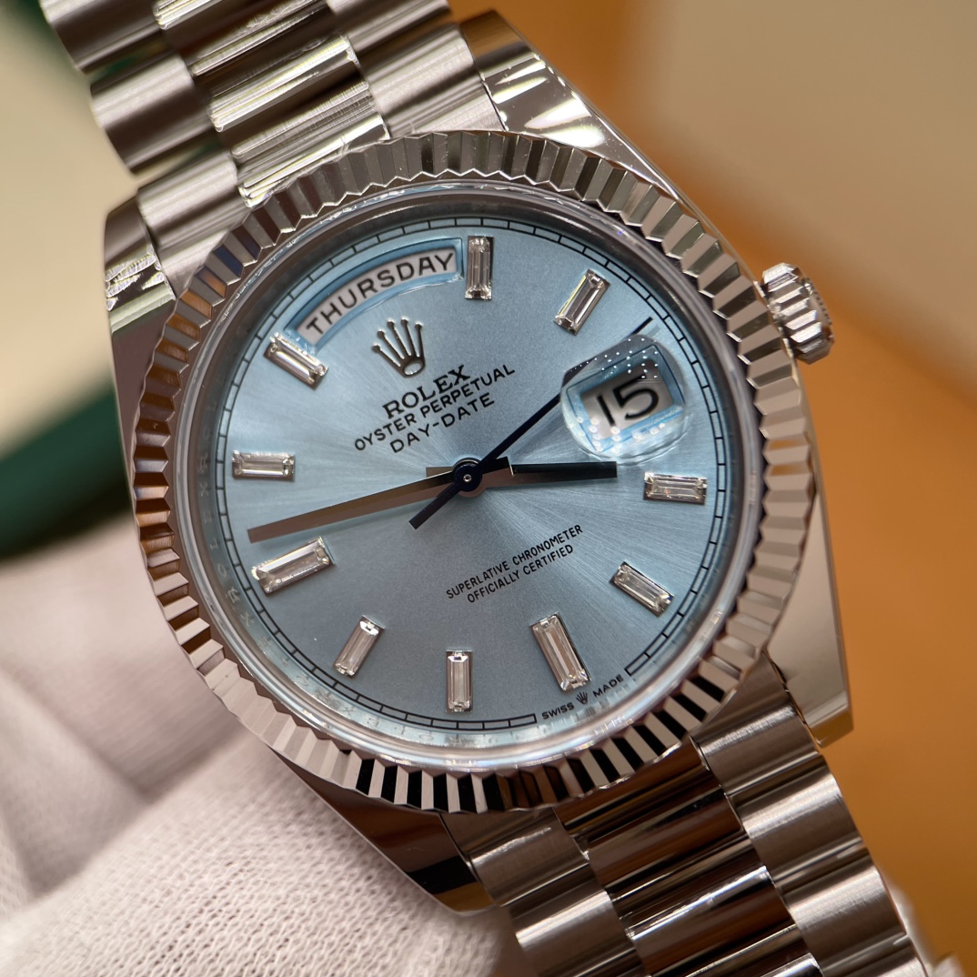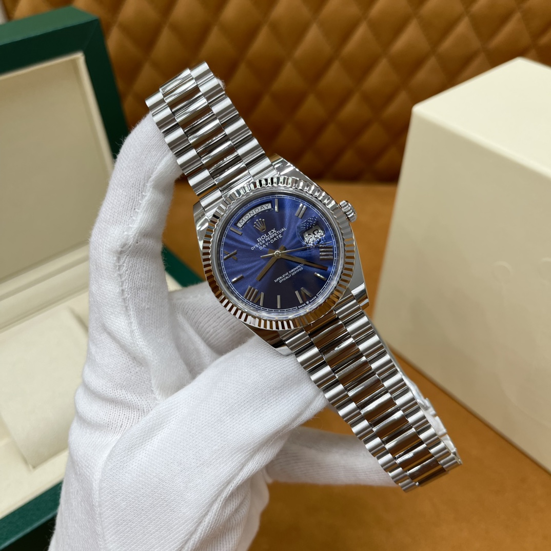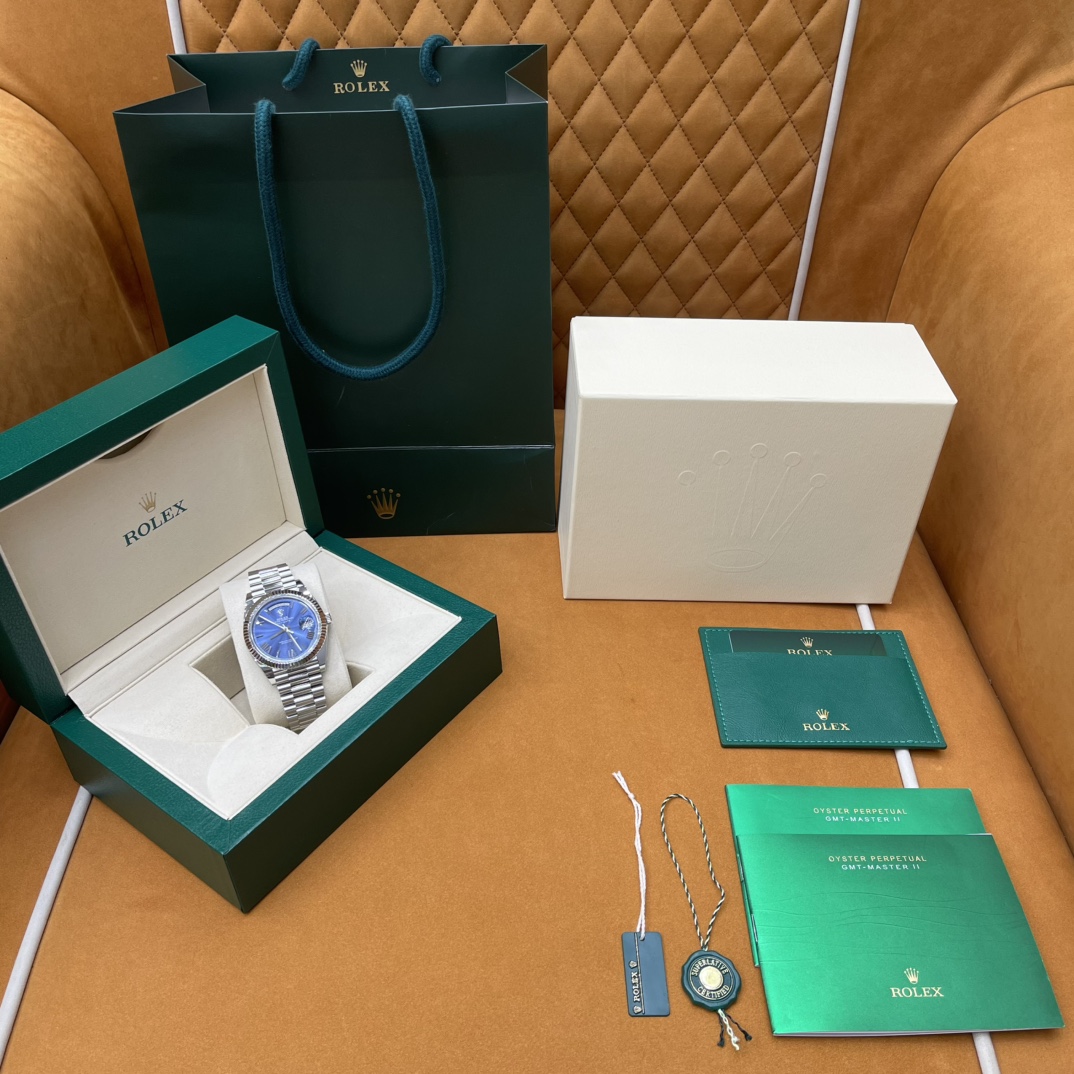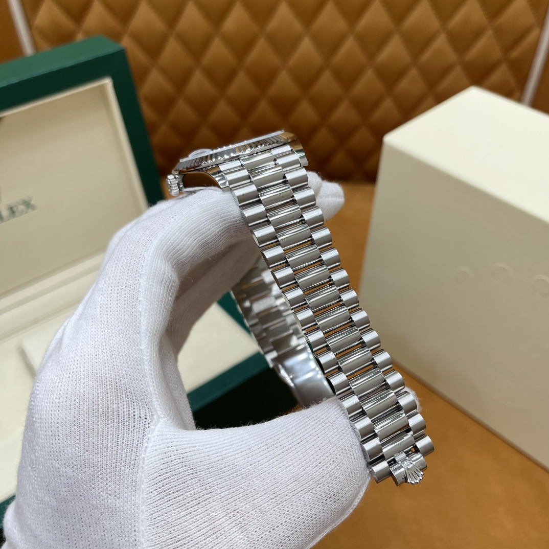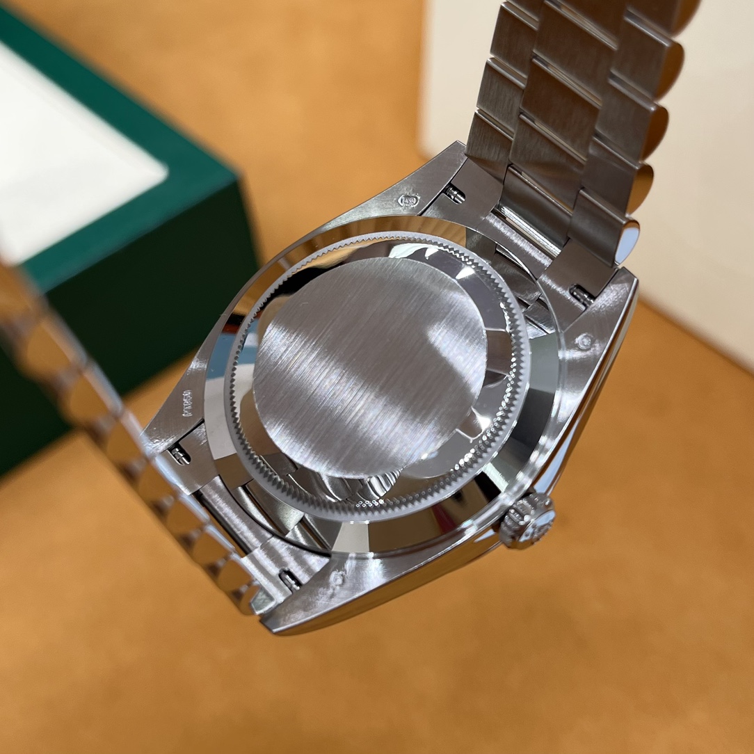 🏷️星期日历型系列 冰蓝日志DD (40mm) M228236-0006 这款冰蓝日志DD真的绝了!采用原版3255自动机械机芯,搭配高性能Paraflex缓震装置,和原版一致的厚度与尺寸,调时调日历功能完全同步,堪称完美复刻! 蓝宝石水晶镜面,搭配2.5倍放大镜的日历窗设计,实用又经典!每一处细节都融入了高科技与非凡美学,向劳力士这款传奇腕表的卓越传统致敬。 硬质合金蚝式钢表带,配备折叠式蚝式保险扣,表带与表耳无缝衔接,戴上它就能感受到满满的质感。高难度的龟壳外观开启方式不仅独特,锁扣紧密,推拉顺滑,佩戴起来压手感非常接近原版,非常安心!旋入式底盖和上链表冠设计,再次提升了整表的实用性和精致感。 尺寸:40mm
