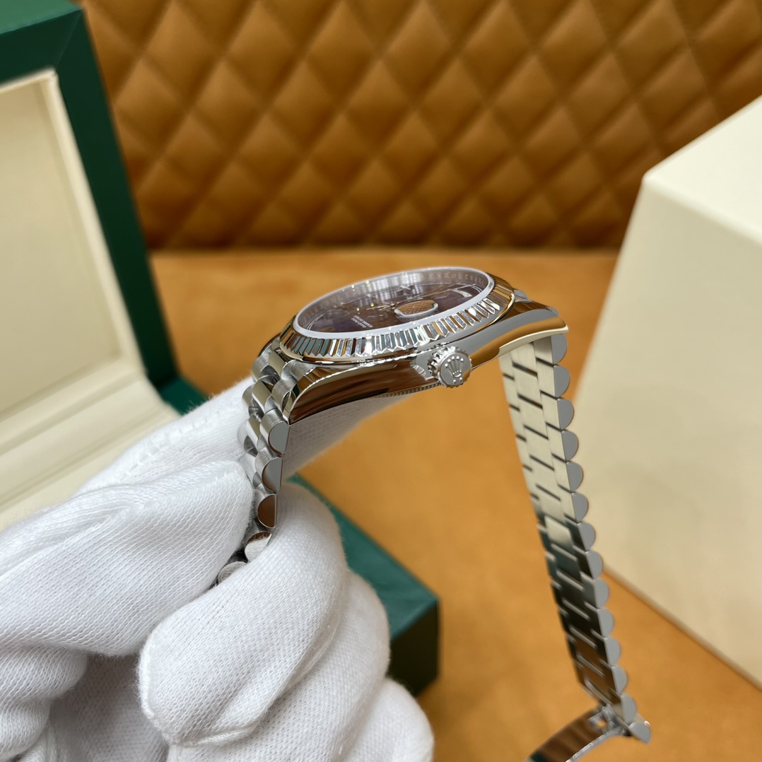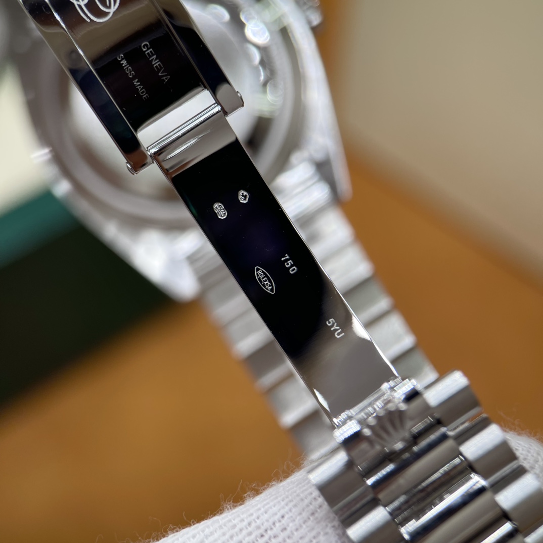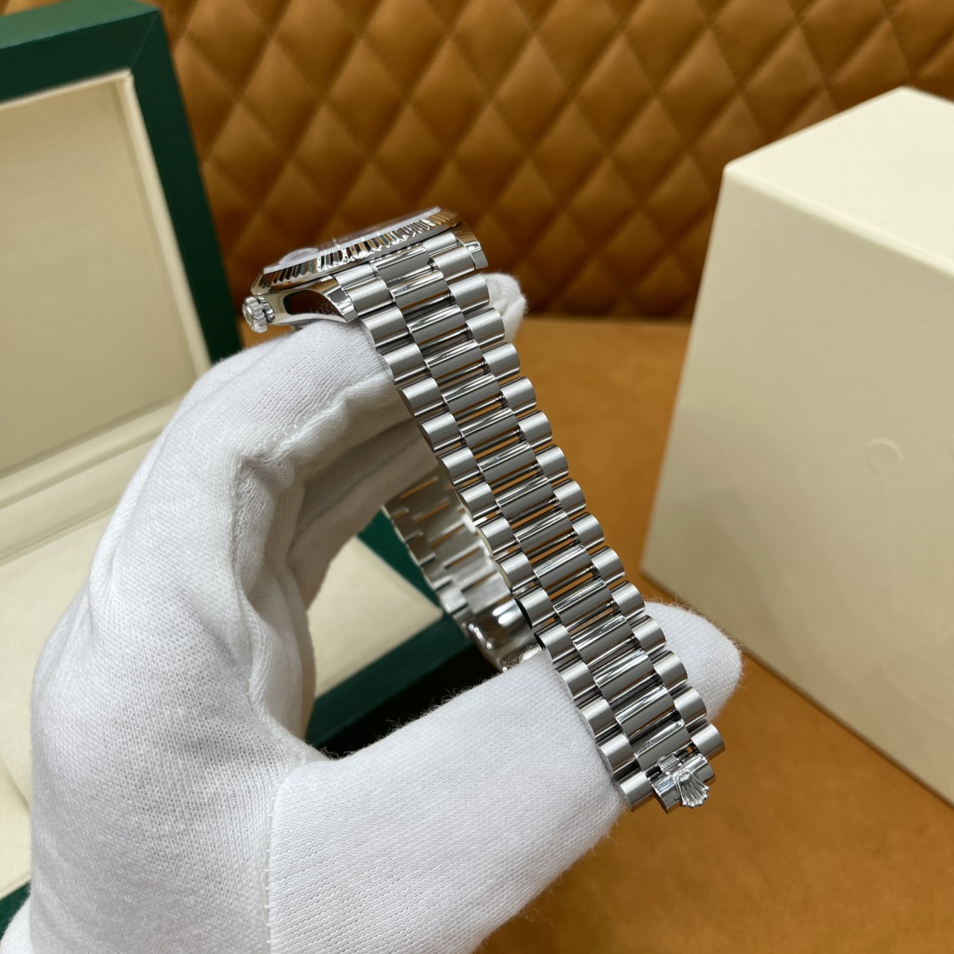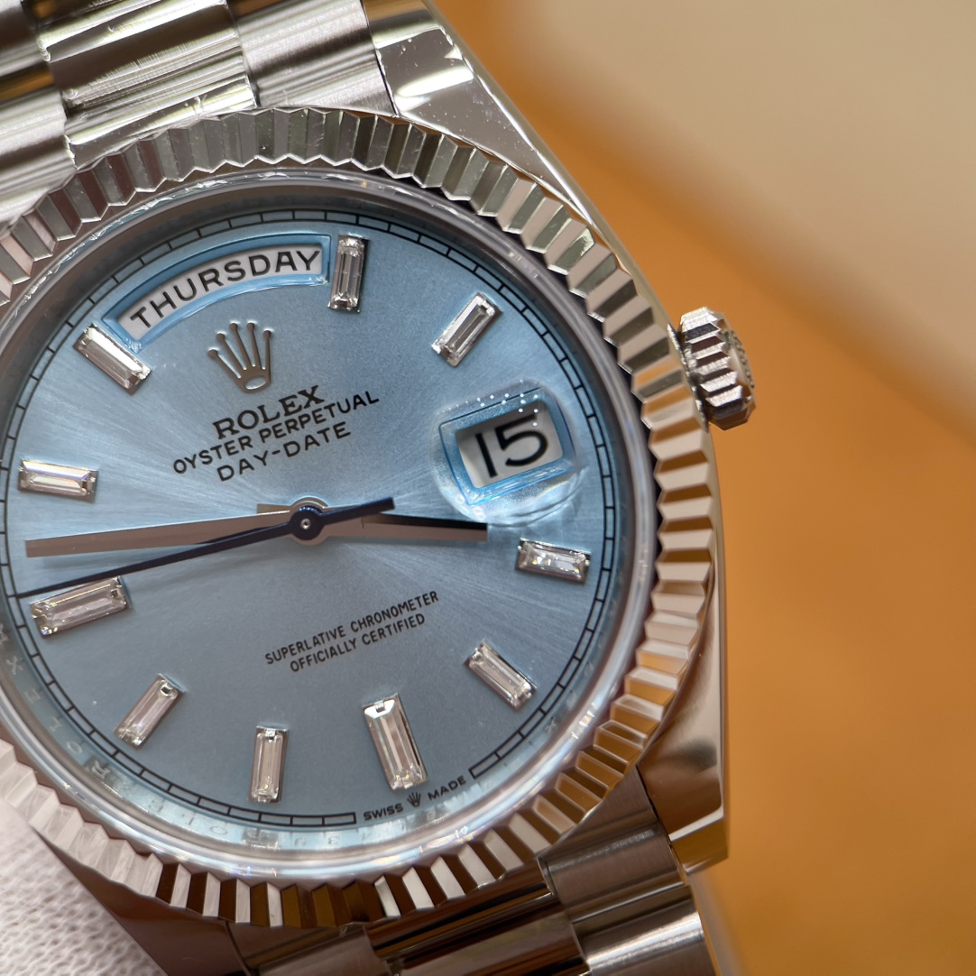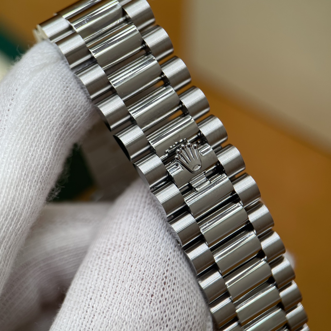 🏷️星期日历型系列 冰蓝日志DD (40mm) M228236-0006 这款冰蓝日志DD真的绝了!采用原版3255自动机械机芯,搭配高性能Paraflex缓震装置,和原版一致的厚度与尺寸,调时调日历功能完全同步,堪称完美复刻! 蓝宝石水晶镜面,搭配2.5倍放大镜的日历窗设计,实用又经典!每一处细节都融入了高科技与非凡美学,向劳力士这款传奇腕表的卓越传统致敬。 硬质合金蚝式钢表带,配备折叠式蚝式保险扣,表带与表耳无缝衔接,戴上它就能感受到满满的质感。高难度的龟壳外观开启方式不仅独特,锁扣紧密,推拉顺滑,佩戴起来压手感非常接近原版,非常安心!旋入式底盖和上链表冠设计,再次提升了整表的实用性和精致感。 尺寸:40mm
