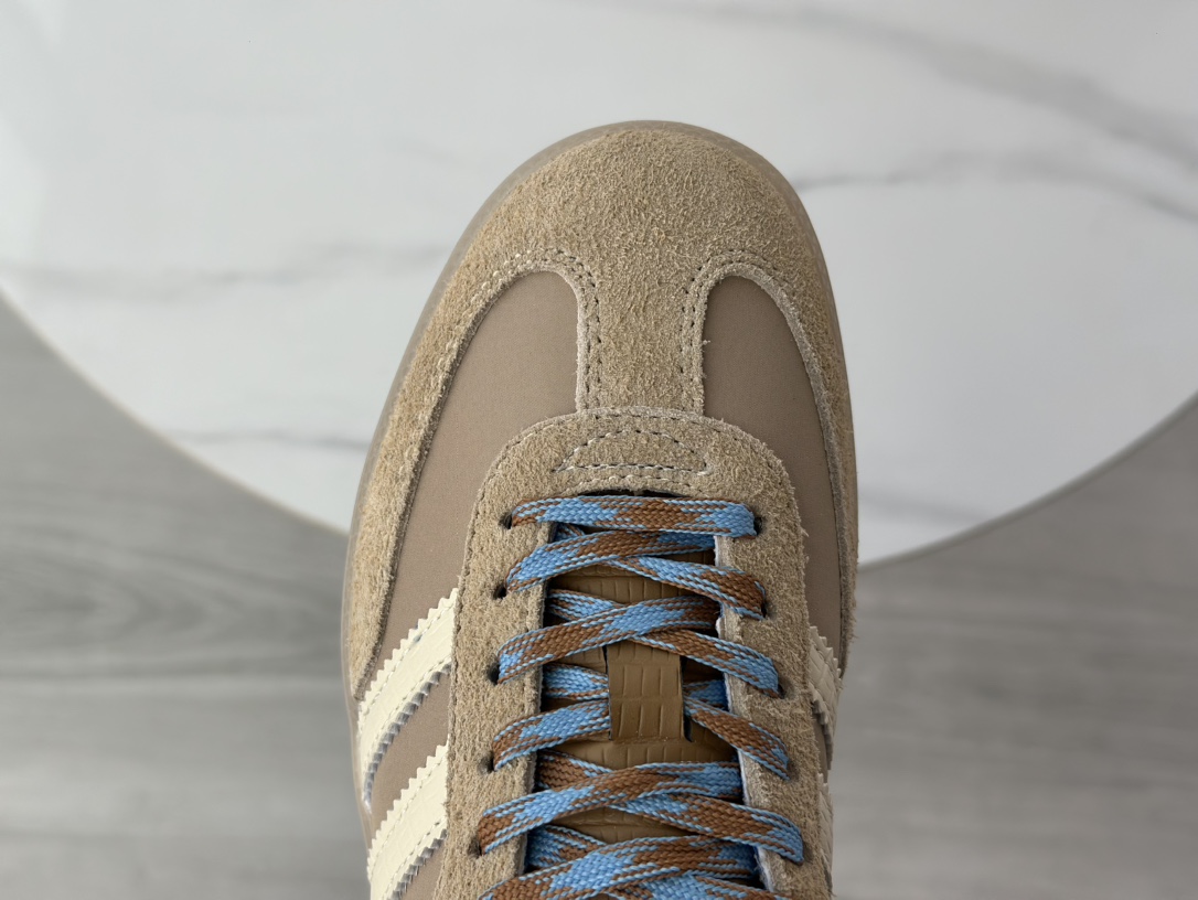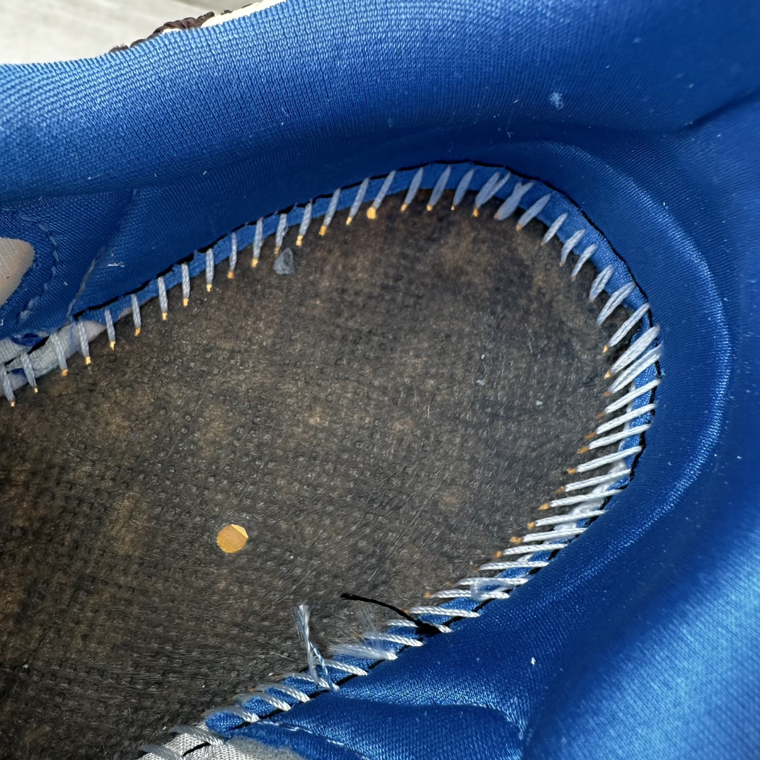 “联名米白皇家蓝生胶底”升级原楦原纸版数据开发,采用长绒翻毛皮组合牛津布鞋面材质,内环保可再生海玻璃鞋垫,外置RB耐磨防滑橡胶大底,超高人气鞋款再出新,联乘英国设计师品牌!