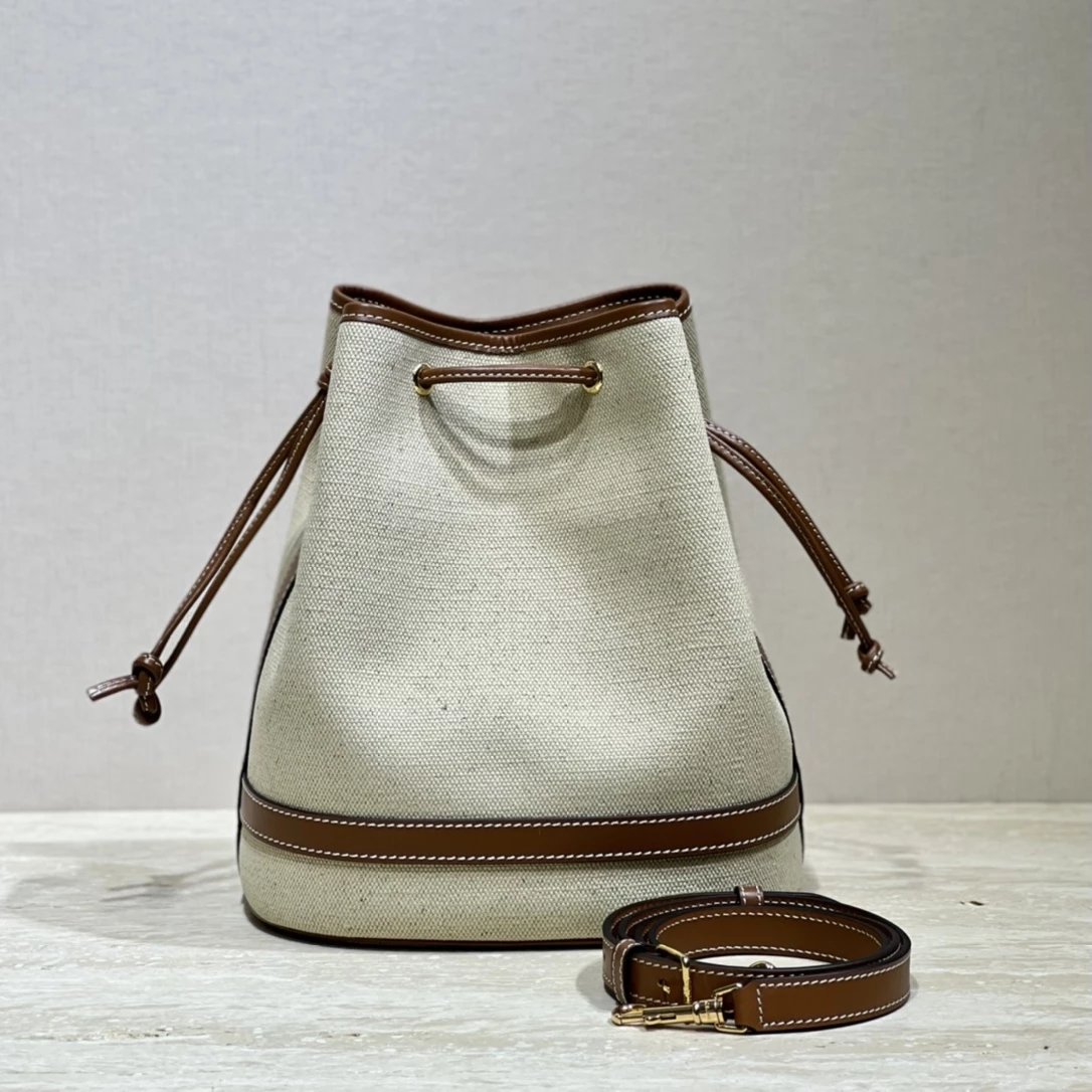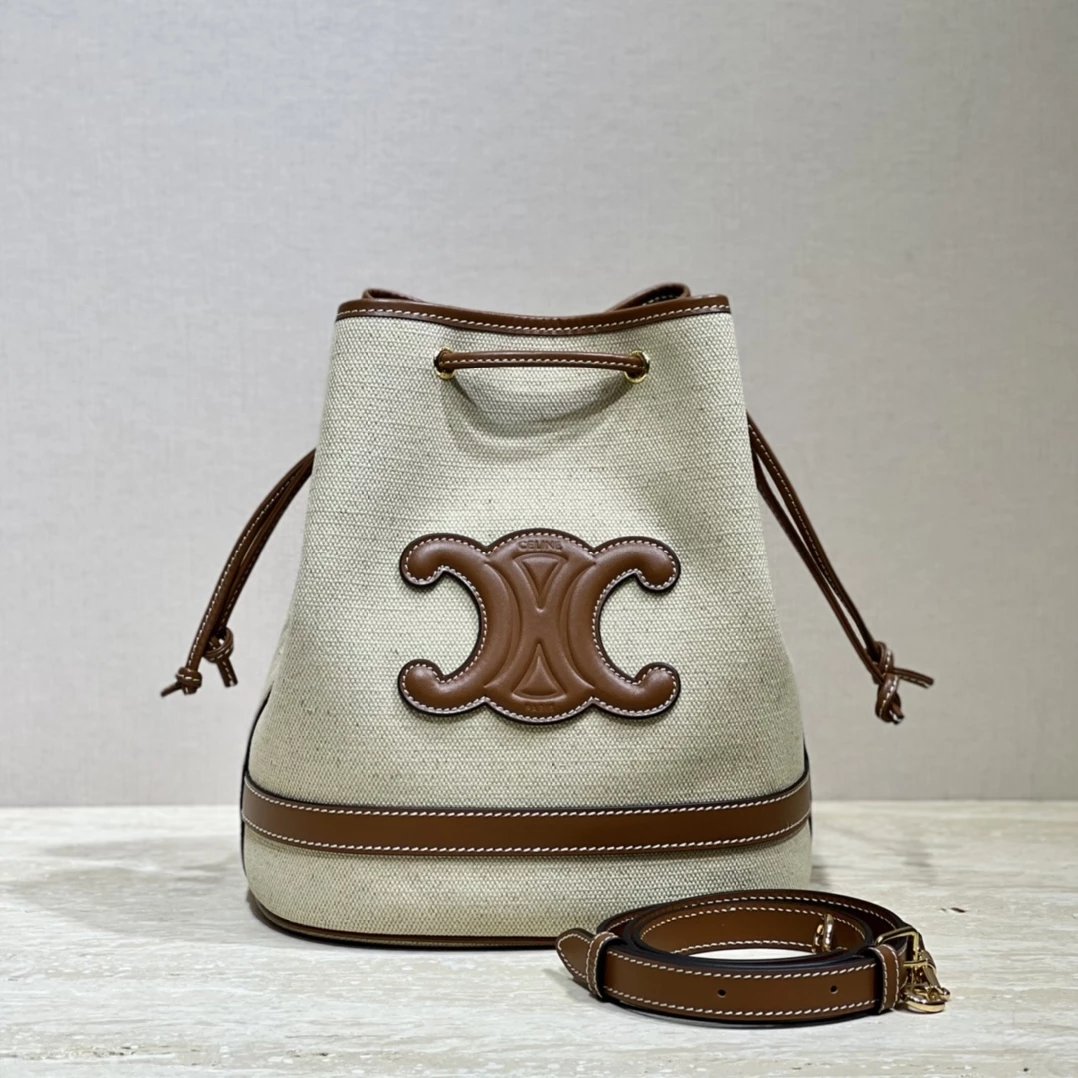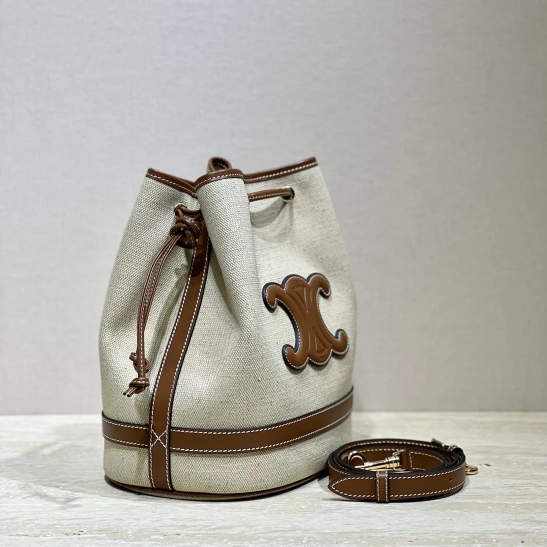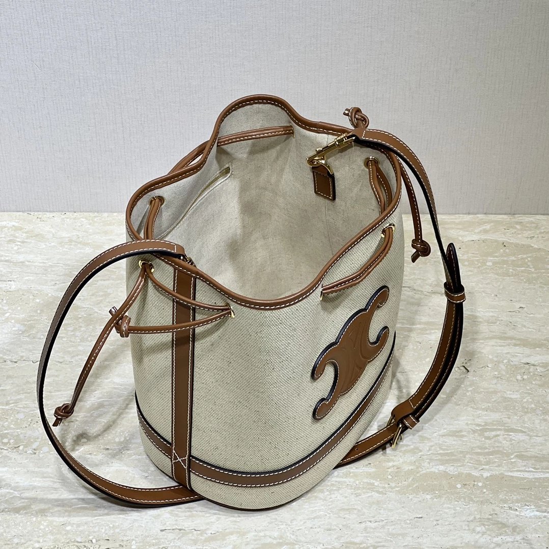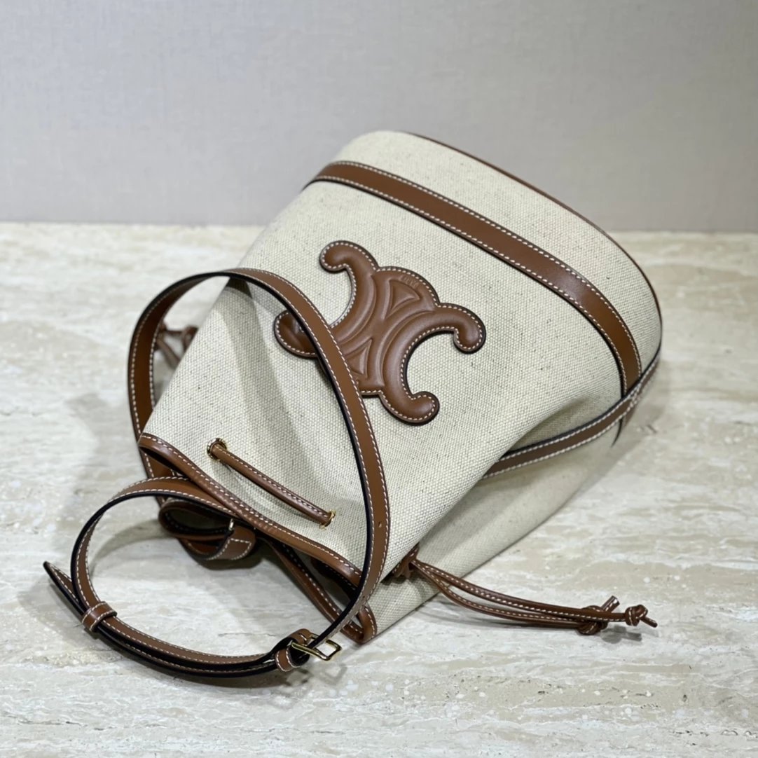 帆布水桶包,帆布正面标志着经典凯旋门logo,棕皮3D浮雕有着高颜值的复古文艺气息~