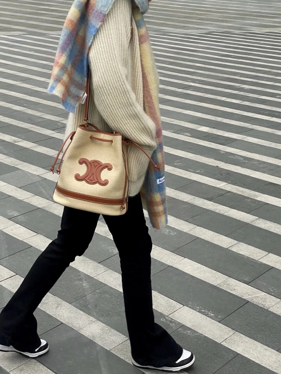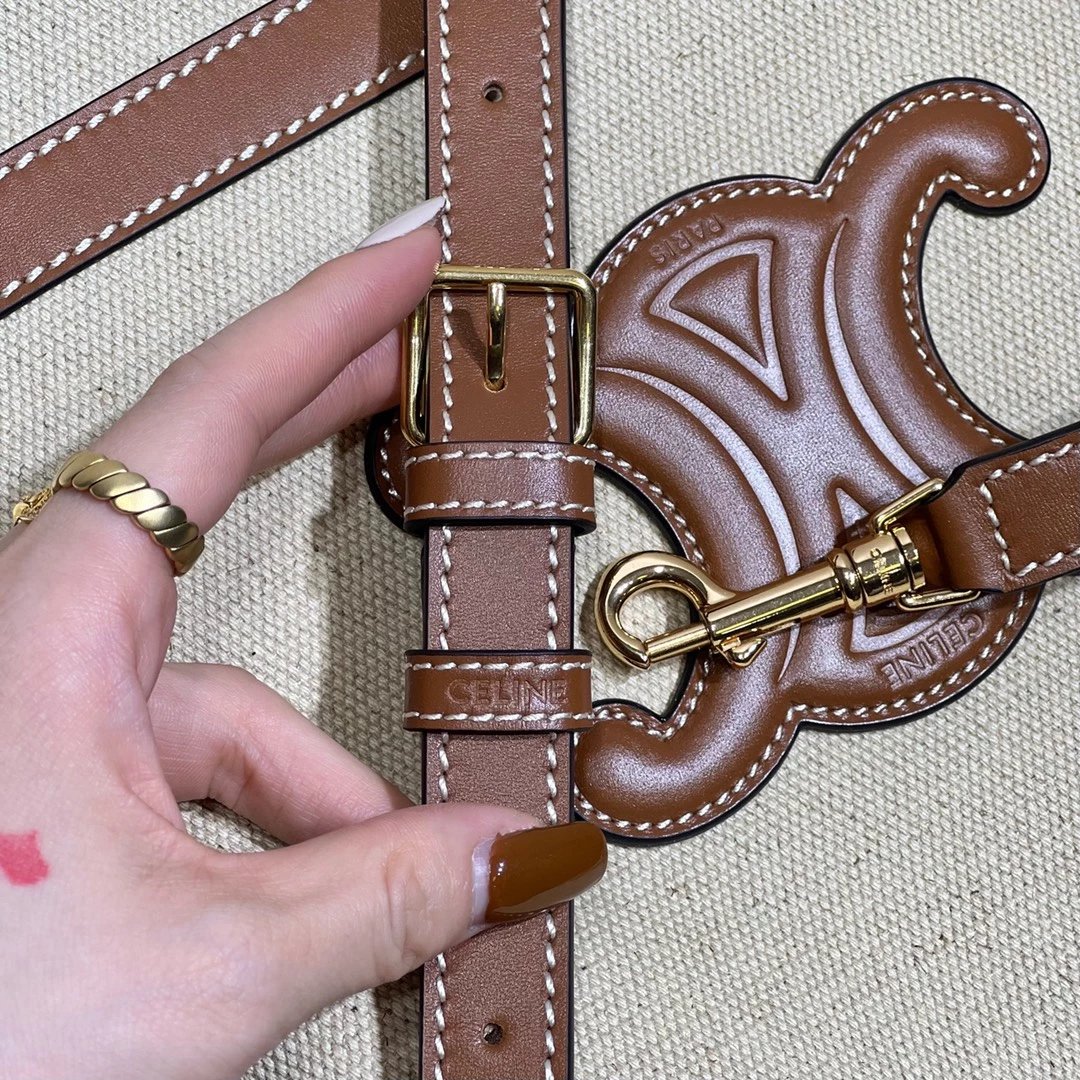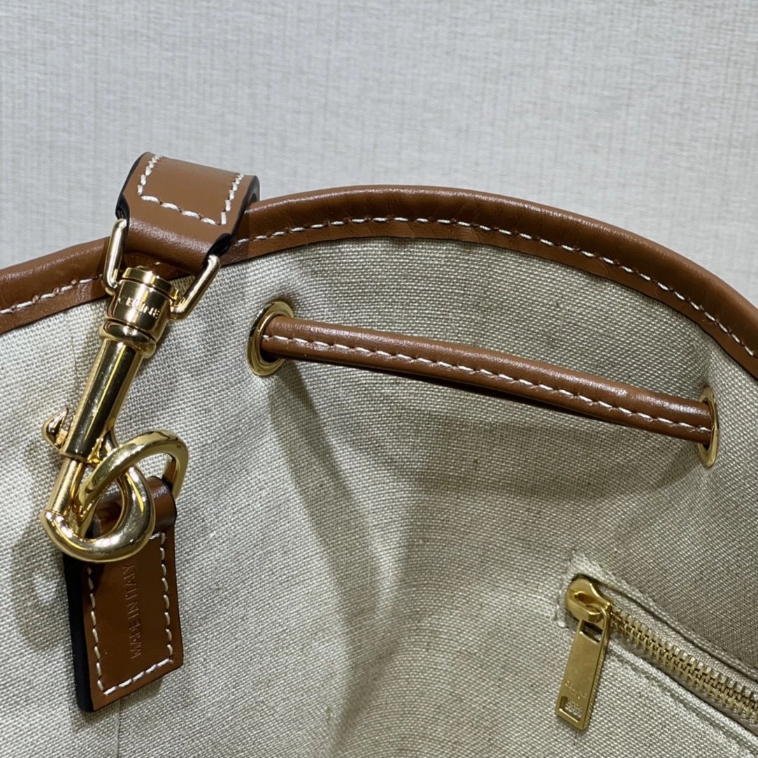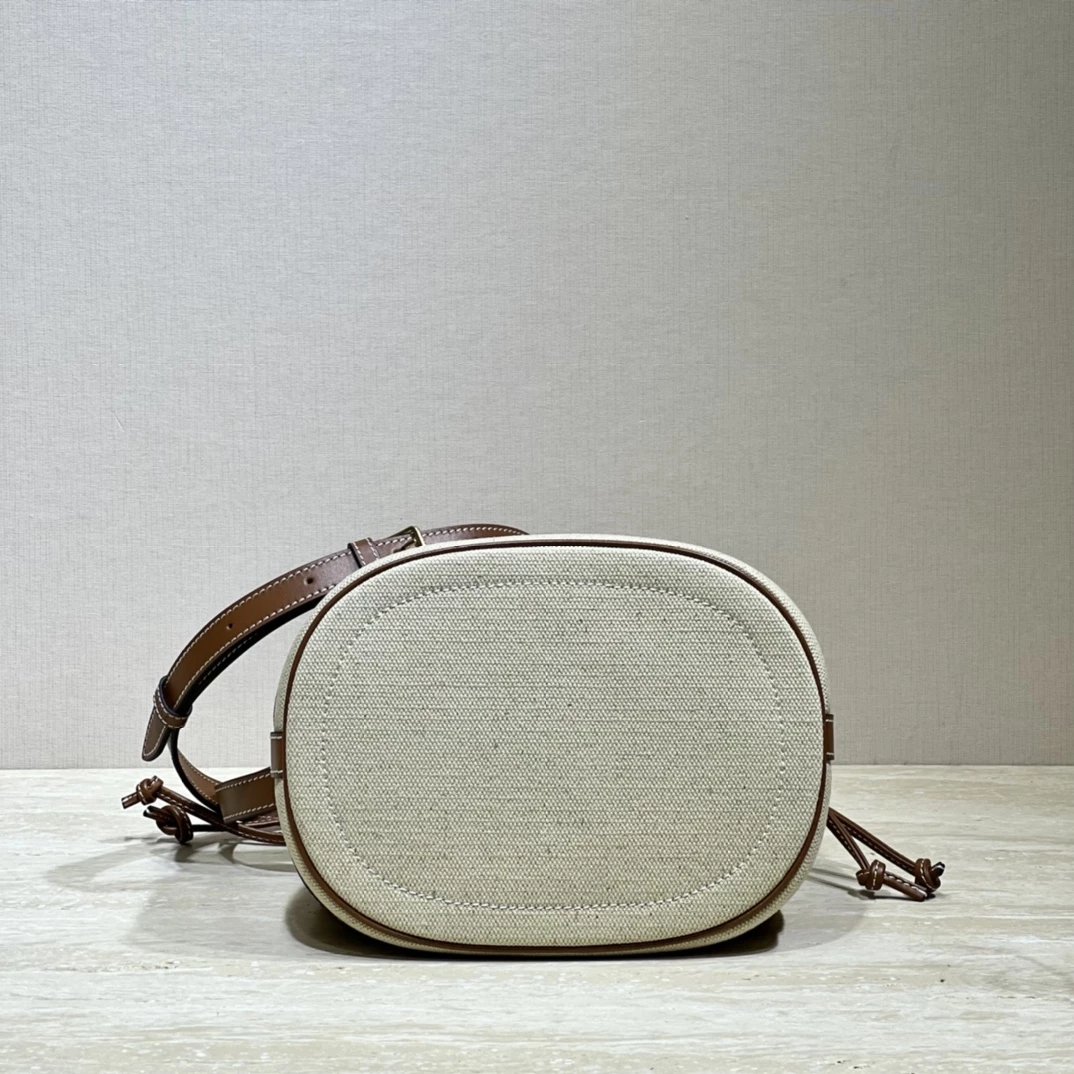 帆布水桶包,帆布正面标志着经典凯旋门logo,棕皮3D浮雕有着高颜值的复古文艺气息~
