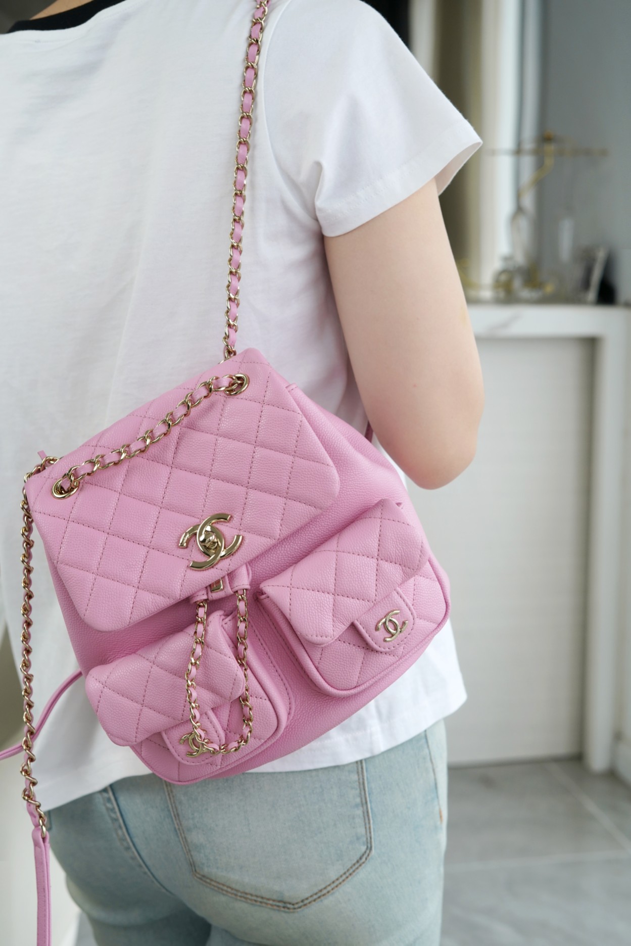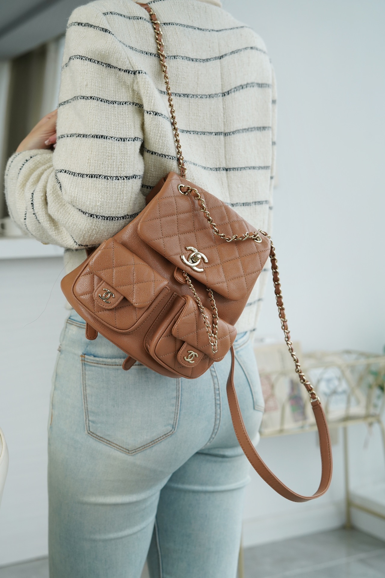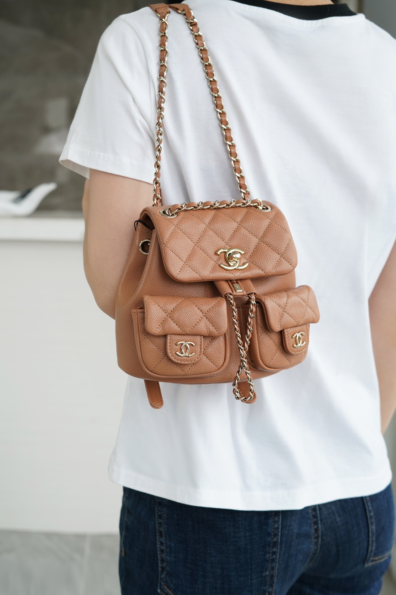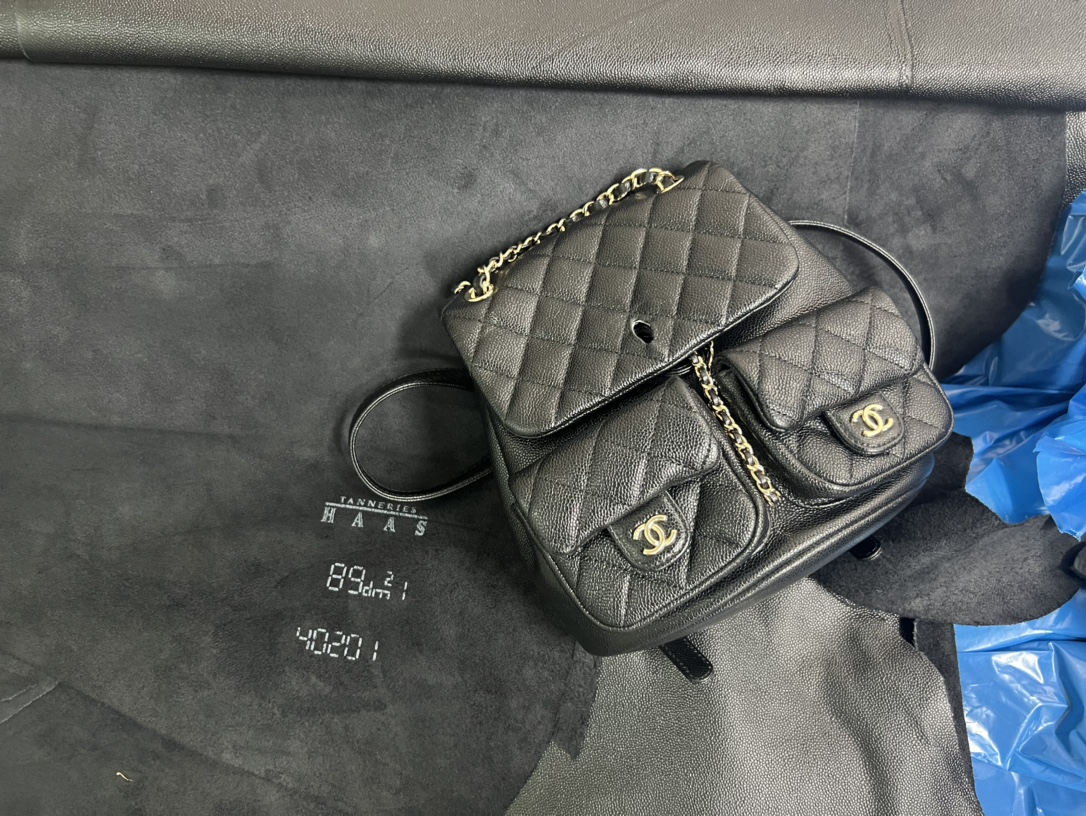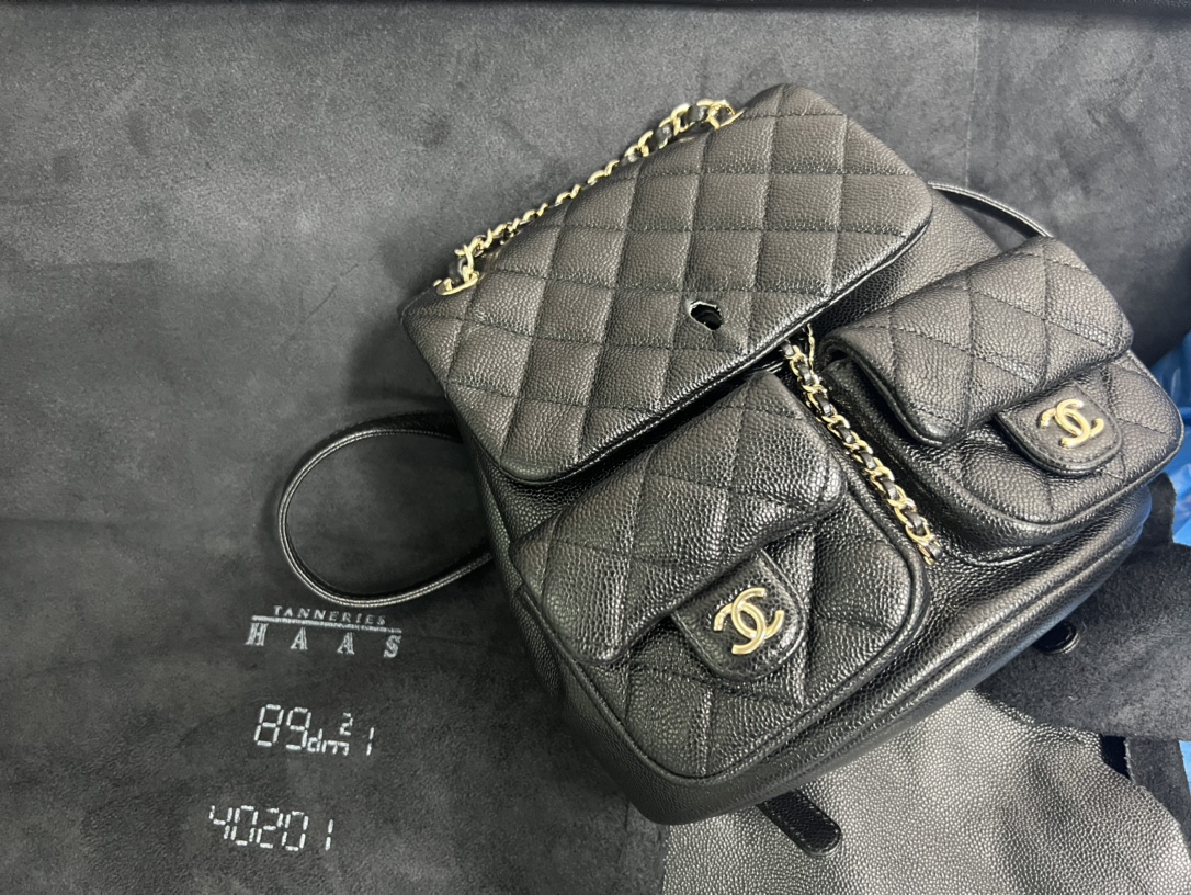 𝗖𝗛𝗔𝗡𝗘𝗟 23P新款 Duma双肩 牛皮 本季黑马 法国🇫🇷《𝐇𝐀𝐀𝐒》皮革厂,软度并存的一级原产小牛皮,与上季Duma双肩如出一撤,改变了前侧下方口袋变成两小只,实用度还是颜值都让人无法拒绝呀~容量很ok,日常出行放的全都能放得下! 尺寸:16.5*17.5*10cm