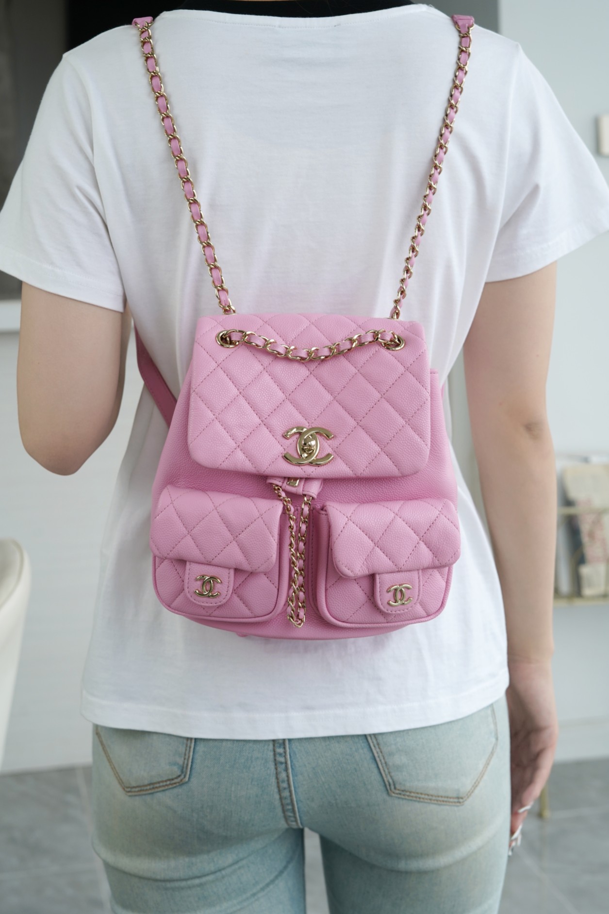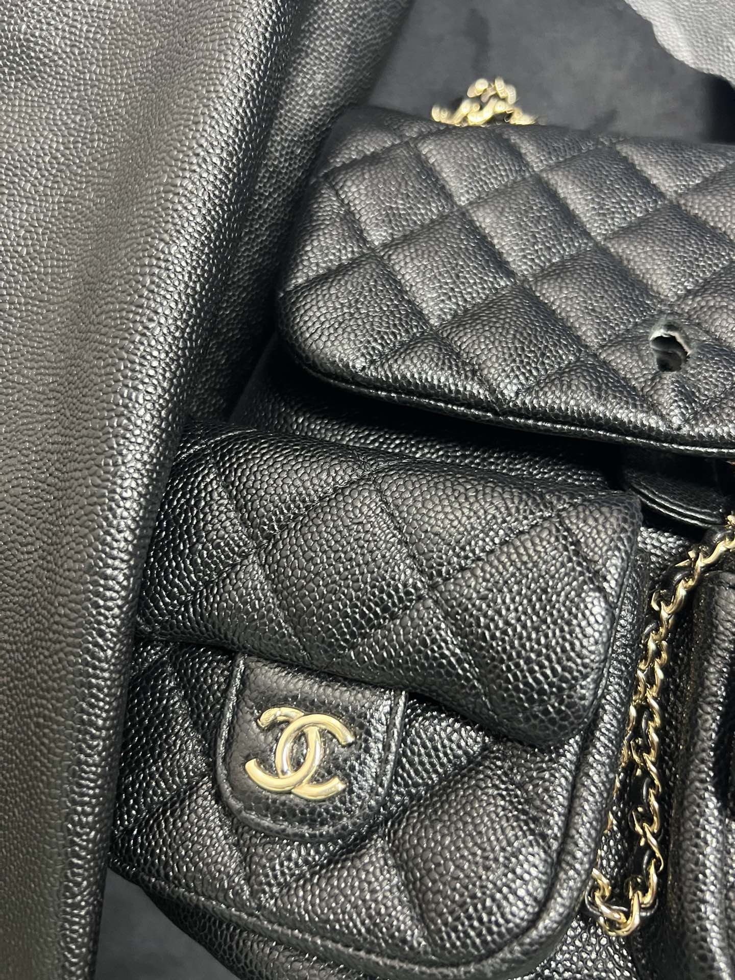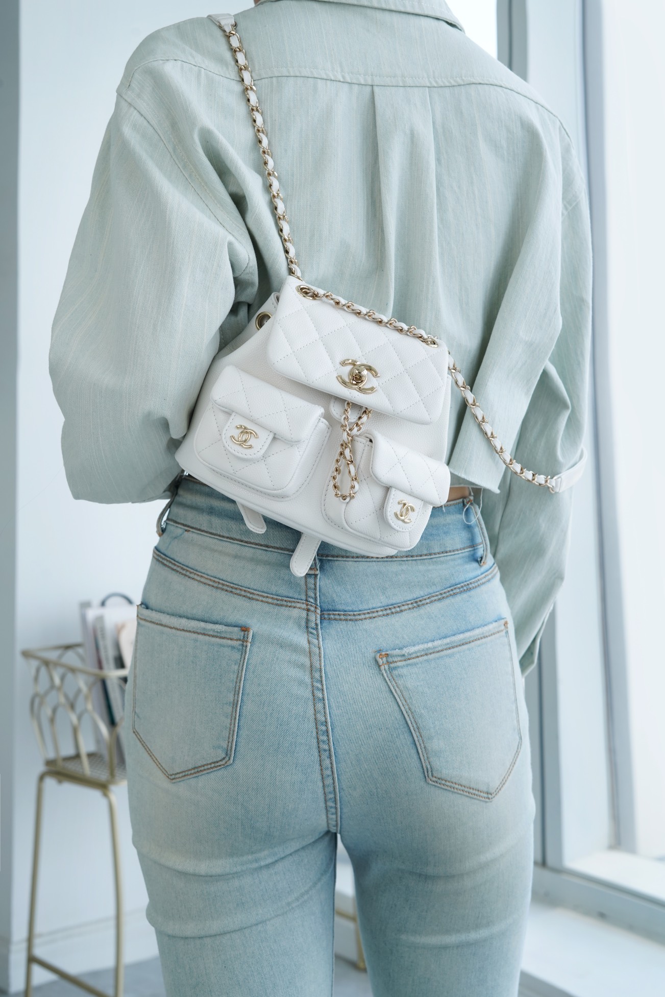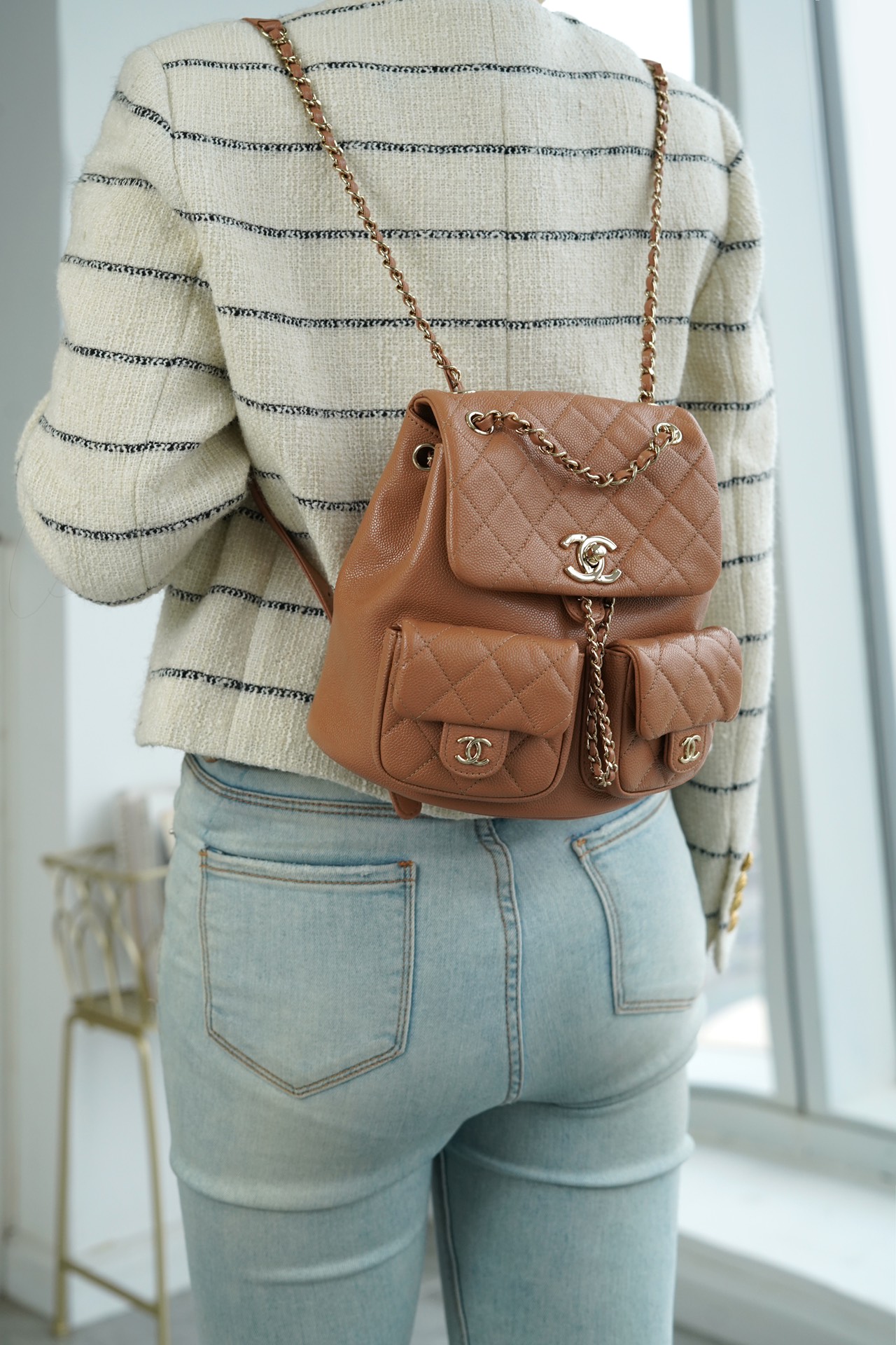 𝗖𝗛𝗔𝗡𝗘𝗟 23P新款 Duma双肩 牛皮 本季黑马 法国🇫🇷《𝐇𝐀𝐀𝐒》皮革厂,软度并存的一级原产小牛皮,与上季Duma双肩如出一撤,改变了前侧下方口袋变成两小只,实用度还是颜值都让人无法拒绝呀~容量很ok,日常出行放的全都能放得下! 尺寸:16.5*17.5*10cm
