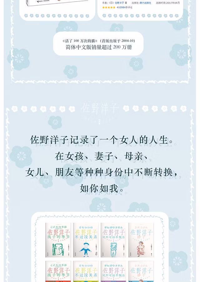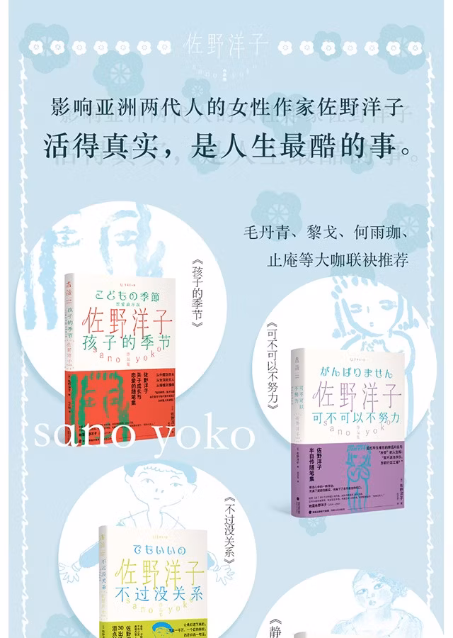 读她的文字就像有一只宽厚的手,紧紧握住你,一起穿过世事难料的人生险境和凡庸日常。佐野洋子出生在北京,有一段与家人在海外漂泊的时光;早年接连遭遇父亲、兄长等至亲离世,她早早地挑起照顾弟弟妹妹的重任;晚年时身患癌症,却依然能够不屈不挠地笑对人生……岁月的磨砺让面庞长满皱纹,也沉淀着年少时代特有的青涩与锋芒,让佐野洋子变得更加洒脱、爽朗、睿智。