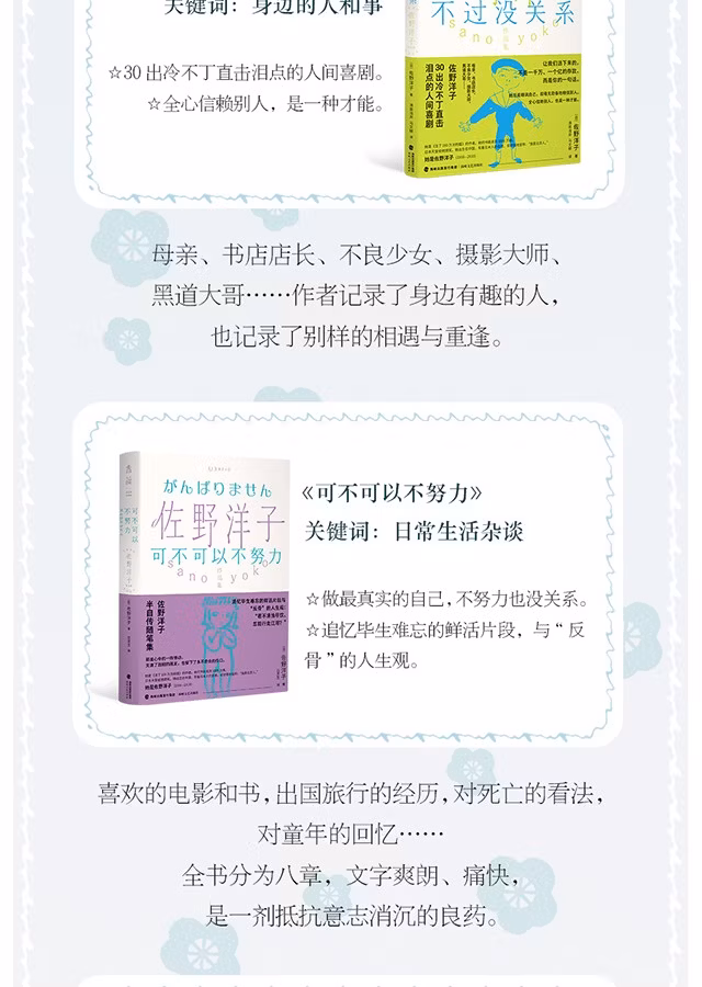 相信他人,却不太相信自己,这是佐野女士的有趣之处。她总是以嘲讽的眼光看待自己,甚至怀疑自己,却毫无防备地相信着他人。对于这种落差,我们不禁微笑、感动,佐野女士的文章,与那些轻浮地说着“相信自己”的歌词相比,简直就是对立的两极。