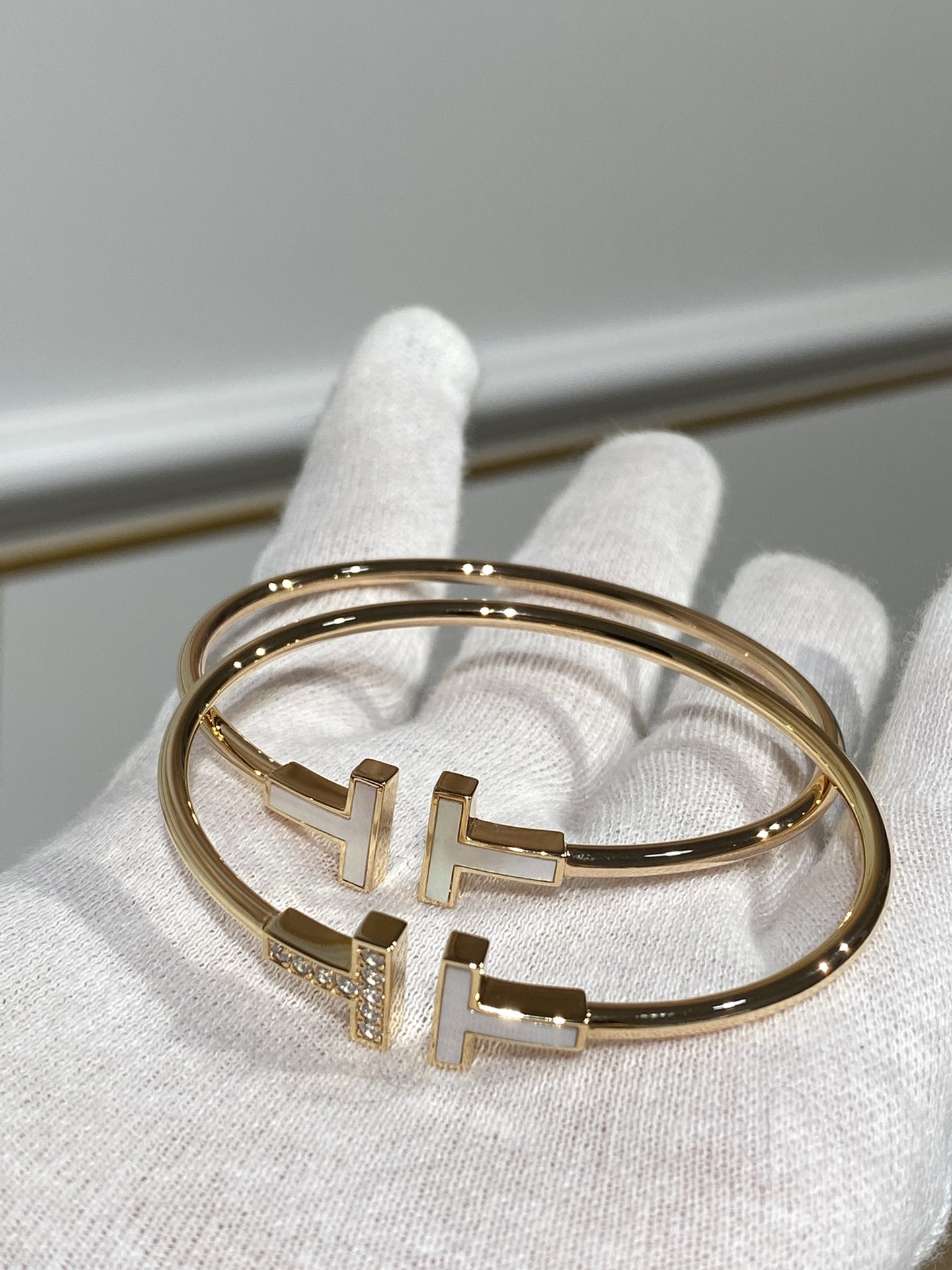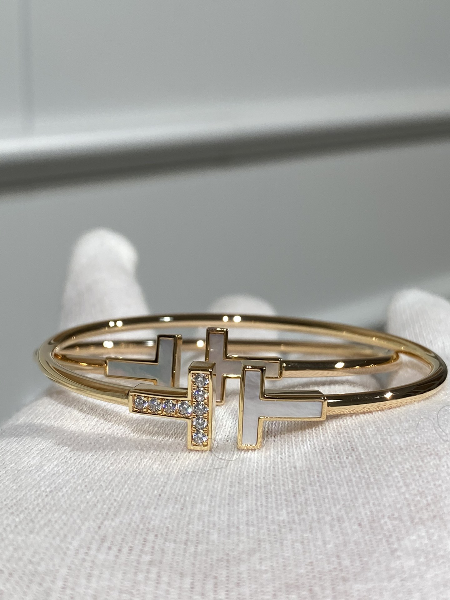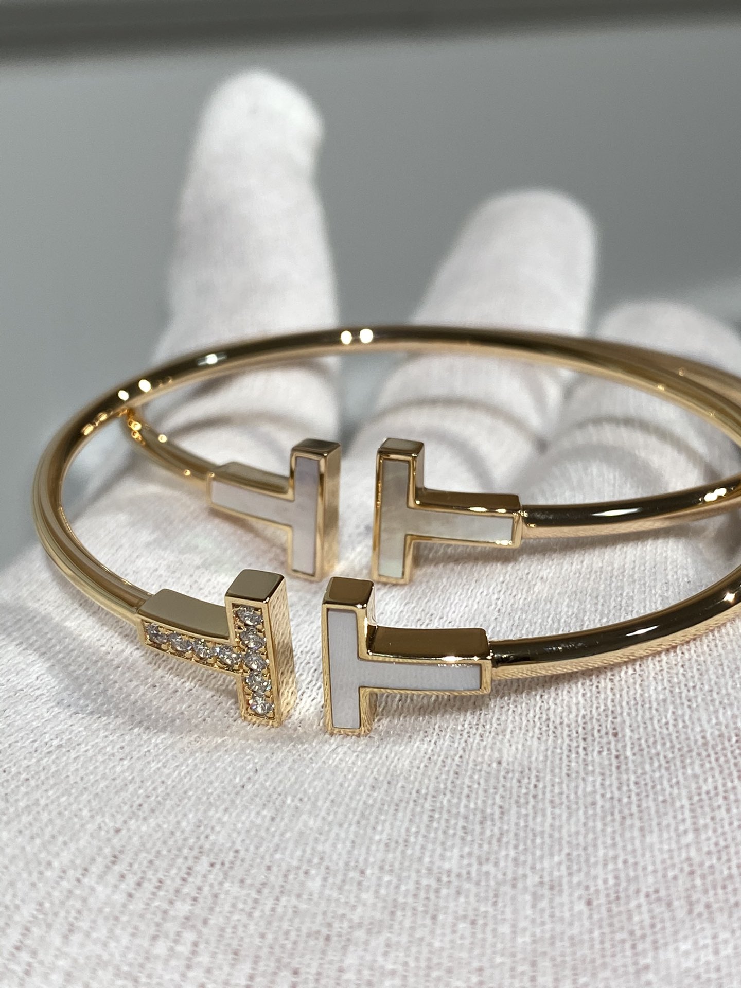T系列新款,双T手镯新增贝母款,T系列经典无需多言,专柜新增了很多配色,不管是手镯还是戒指配色琳琅满目,我们给大家先出了最好看的贝母版,闪闪发光的贝母温柔贵气,气场不输任何宝石,个人觉得带贝母的款比经典镶钻的更好看,更适合叠搭。然后说做工,看视频大家就已经被惊艳到了,全精雕的真金质感太奢华了!华丽丽~~带出去绝对高级有面子!这个款式最让人区分好坏的地方就在于第一眼看到的T字,他绝对不是软软薄薄的一小片,是很厚实很锋利的配件,经过精雕后安装在弹簧管上,也是这款手镯最重的地方。主体手镯部分和钉子手镯一样是带有弹力的,本身是比较轻的,这个在介绍钉子手镯的时候有专门介绍过,如果很重很沉那技术肯定是不过关的。石头采用进口硅钛料一级钻,非常通透闪耀,近期我们的高定都会采用这种钻,市面很难定到,因为成本会贵上很多,钻石全部人工手镶,不掉石是基本。贝母依旧采用最高级的深海白蝶贝,跟专柜是一样的石材,所有都是根据真金品质来定制的,甚至比一些真金做工更好!年底了大家珠宝首饰都要佩戴起来,气质提升的不是一点半点哦!