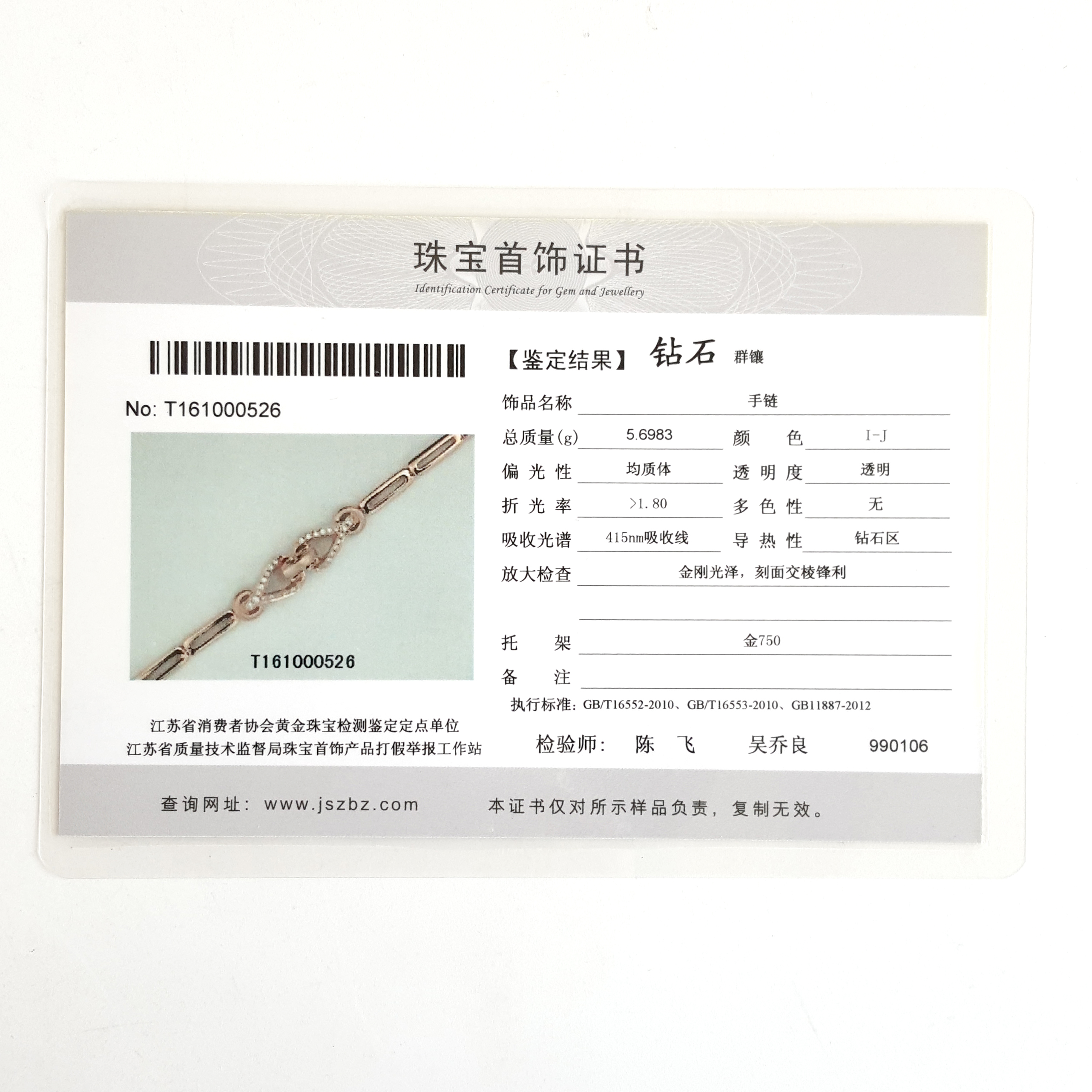 证书 | 江苏省质量技术监督珠宝首饰产品质量检验站证书 |