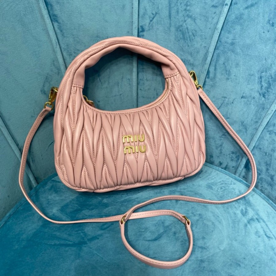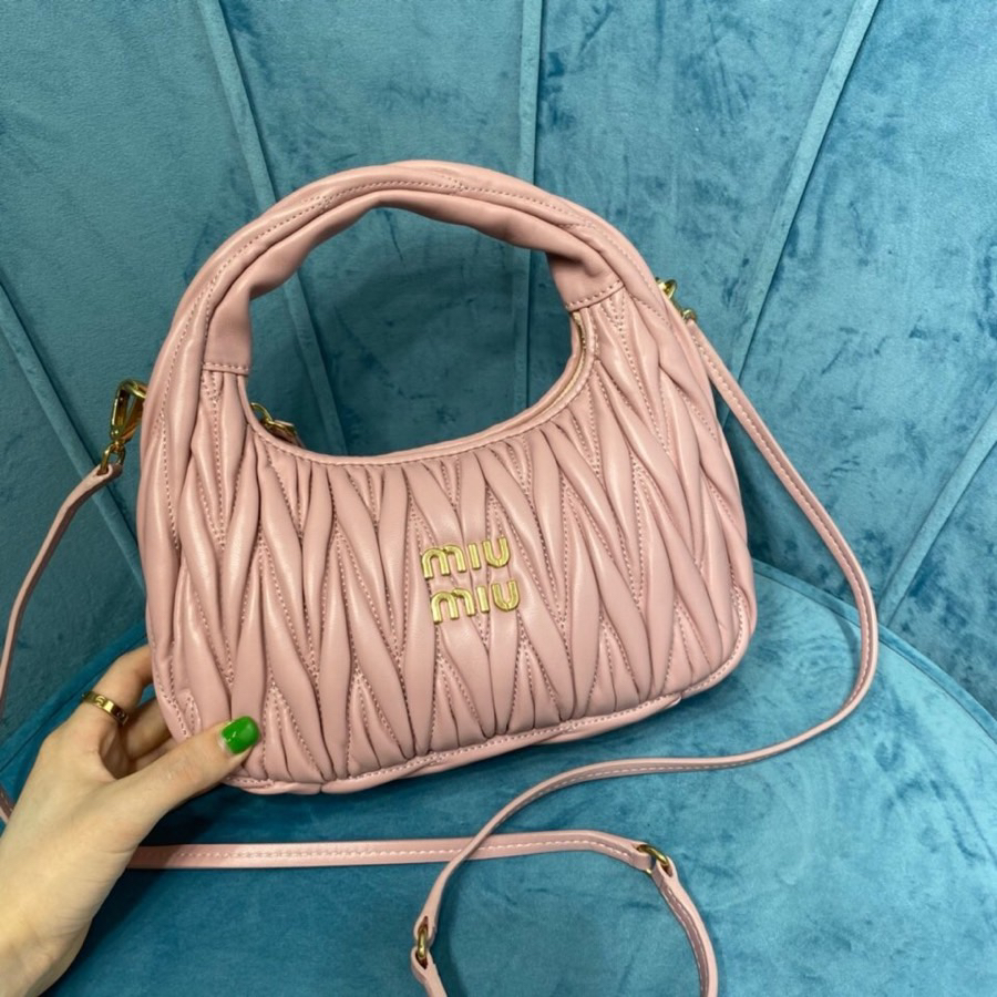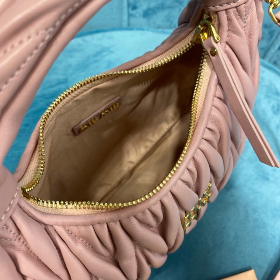 缪缪 Wander系列 时尚纯色褶皱金属刻字徽标Logo 软羊革 手提包斜挎包单肩包 女款 粉色(HH)