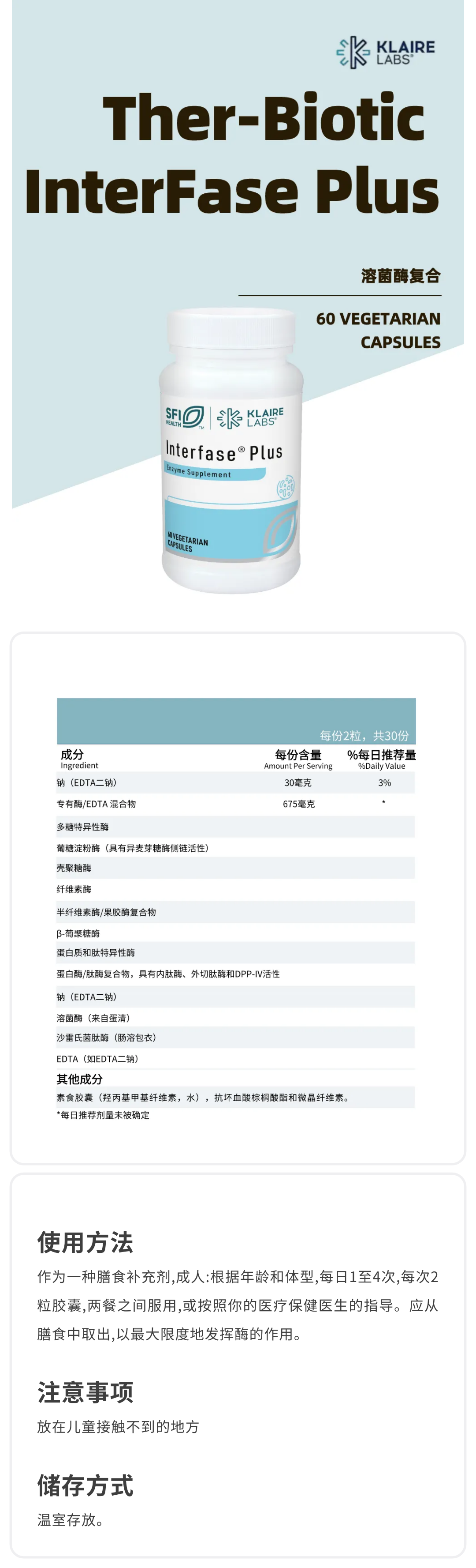 海淘 klaire labs克莱尔实验室 Ther-Biotic InterFase Plus 溶菌酶复合 60粒/瓶 26/10