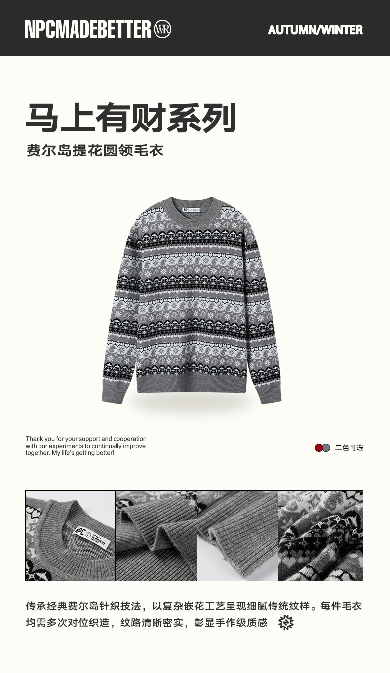 NPC潮牌马年限定【马上有财】费尔岛提花毛衣圆领重磅600克NP5CSW15