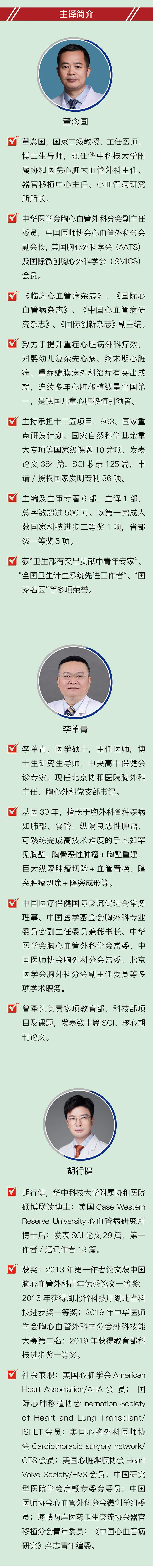董念国,国家二级教授、主任医师、博士生导师,现任华中科技大学附属协和医院心脏大血管外科主任、器官移植中心主任、心血管病研究所所长。 中华医学会胸心血管外科分会副主任委员,中国医师协会心血管外科分会副会长,美国胸心外科学会(AATS)及国际微创胸心外科学会(ISMICS)会员。 《临床心血管病杂志》 《国际心血管病杂志》、《中国心血管病研究杂志》、《国际创新杂志》副主编。 致力于提升重症心脏病外科疗效,对婴幼儿复杂先心病、终末期心脏病、重症瓣膜病外科治疗有突出成就,连续多年心脏移植数量全国一,,是我国儿童心脏移植引领者。 主持承担十二五项、863、国家重点研发计划、国家自然科学基金重大专项等GJ级课题10余项,发表论文384篇,SCl收录125篇,申请/授权国家发明专利36项。 主编及主审专著6部,主译1部,总字数超过500万。以第一完成人获国家科技进步二等奖1项,省部级一等奖5项。 获“卫生部有突出贡献中青年专家”、“全国卫生计生系统先进工作者”、“国家名医”等多项荣誉。 李单青,医学硕士、主任医师,博士生研究生导师,中央高干保健会诊专家。现任北京协和医院胸外科任,胸心外科党支部书记 从医30年,擅长于胸外科各种疾病如肺部、食管、纵隔良恶性肿瘤,可熟练完成高技术难度的手术如罕见胸壁、胸骨恶性肿瘤+胸壁重建、巨大纵隔肿瘤切除+血管置换、隆突肿瘤切除+隆突成形等。 中国医疗保健国际交流促进会常务理事、中国医学基金会胸外科专业委员会副主任委员兼秘书长、中华医学会胸心血管外科学会常委、中国医师协会胸外科分会常委、北京医学会胸外科分会副主任委员等多项学术职务。 曾牵头负责多项教育部、科技部项目及课题,发表数十篇SCl核心期刊论文。 胡行健,华中科技大学附属协和医院硕博联读博士;美国 Case Western Reserve University心血管病研究所博士后;发表SCI论文29篇,第一作者/通讯作者13篇。 获奖:2013年第一作者论文获中国胸心血管外科青年优秀论文一等奖;2015年获得湖北省科技厅湖北省科技进步奖一等奖;2019年中华医师学会胸心血管外科学分会外科技能大赛第二名:2019年获得教育部科技进步奖一等奖。 社会兼职:美国心脏学会American Heart Association/AHA会员;国际心肺移植协会Inernation Society of Heart and Lung Transplant/ISHLT会员;美国心胸外科医师协会Cardiothoracic surgery network/CSTA会员;美国心脏瓣膜协会Heart Valve Society/HVS会员;中国研究型医院学会房颤专委会委员;中国医师协会心血管外科分会微创学组委员;海峡两岸医药卫生交流协会器官移植分会青年委员;《中国心血管病研究》杂志青年编委。