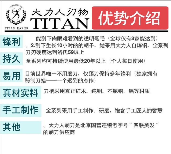 大力人剃刀 :系世界三大品牌之一, 由LeeBen设计,是大力人最早期的手工产品,是大力人最经典不可缺少的系列。在漫长的岁月中,它仍然完整保存了四十年前的手工工艺,他的特点是使用世界独有的刀蜡保持长期锋利.在欧美低碳环保的潮流下使人们重新拿出老式剃刀成为时尚.也让大力人刀具获得新的使命.