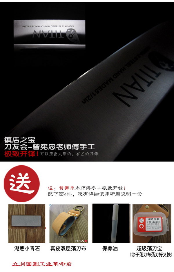 锋口: 全部由曾宪忠老师傅手工开锋到锋利无比!到手即用(您今后长期的使用中我们也有提供收费磨刀服务方便阁下使用)