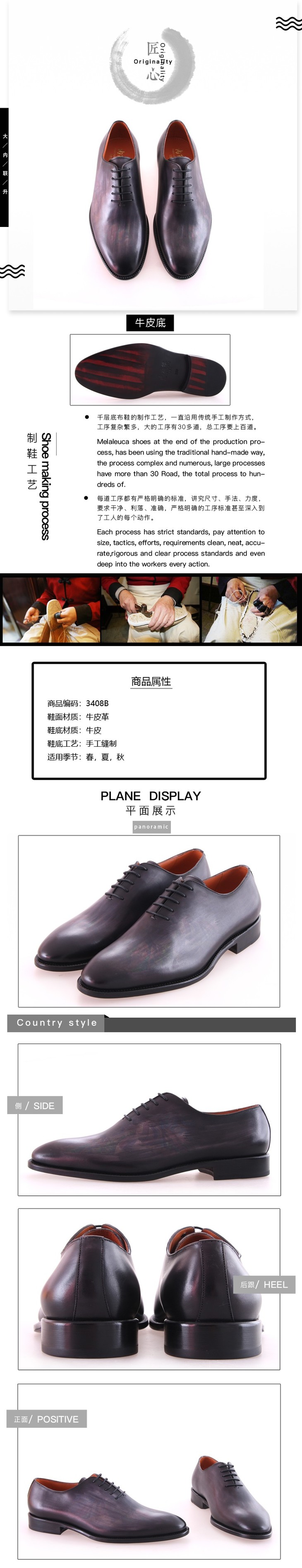 内联升男鞋手工皮鞋男式法国手绘长城时尚皮鞋3408B
