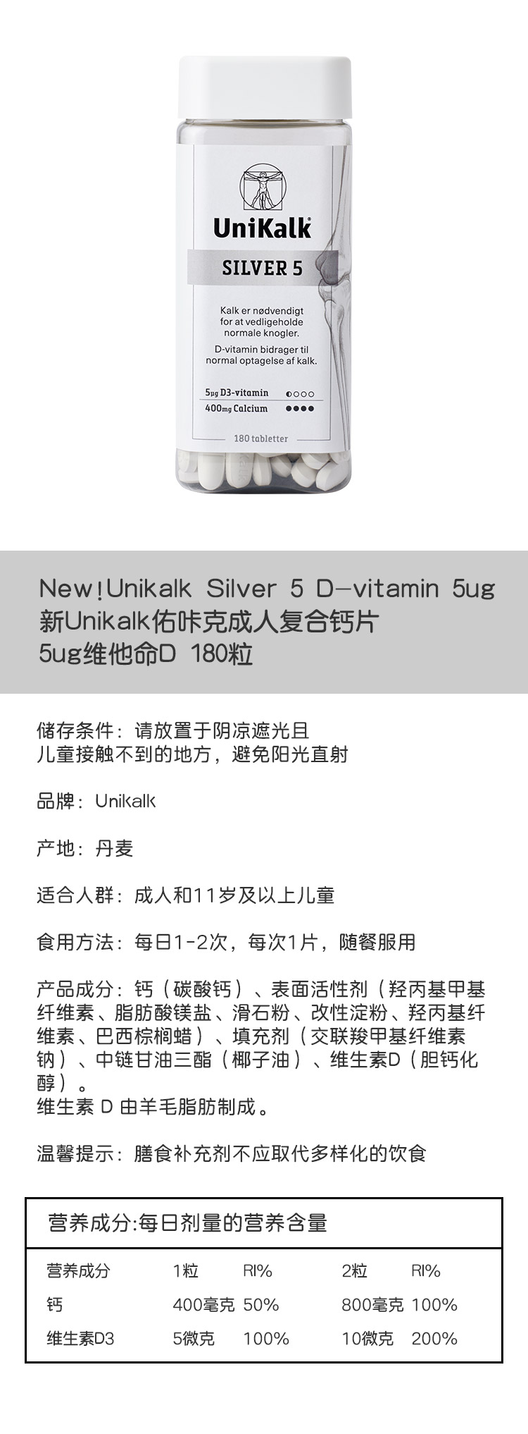 [极速送达-FX]新Unikalk佑咔克成人复合钙片180粒5µg维他命D. New!Unikalk Silver 5 D-vitamin 5µg 180stk.