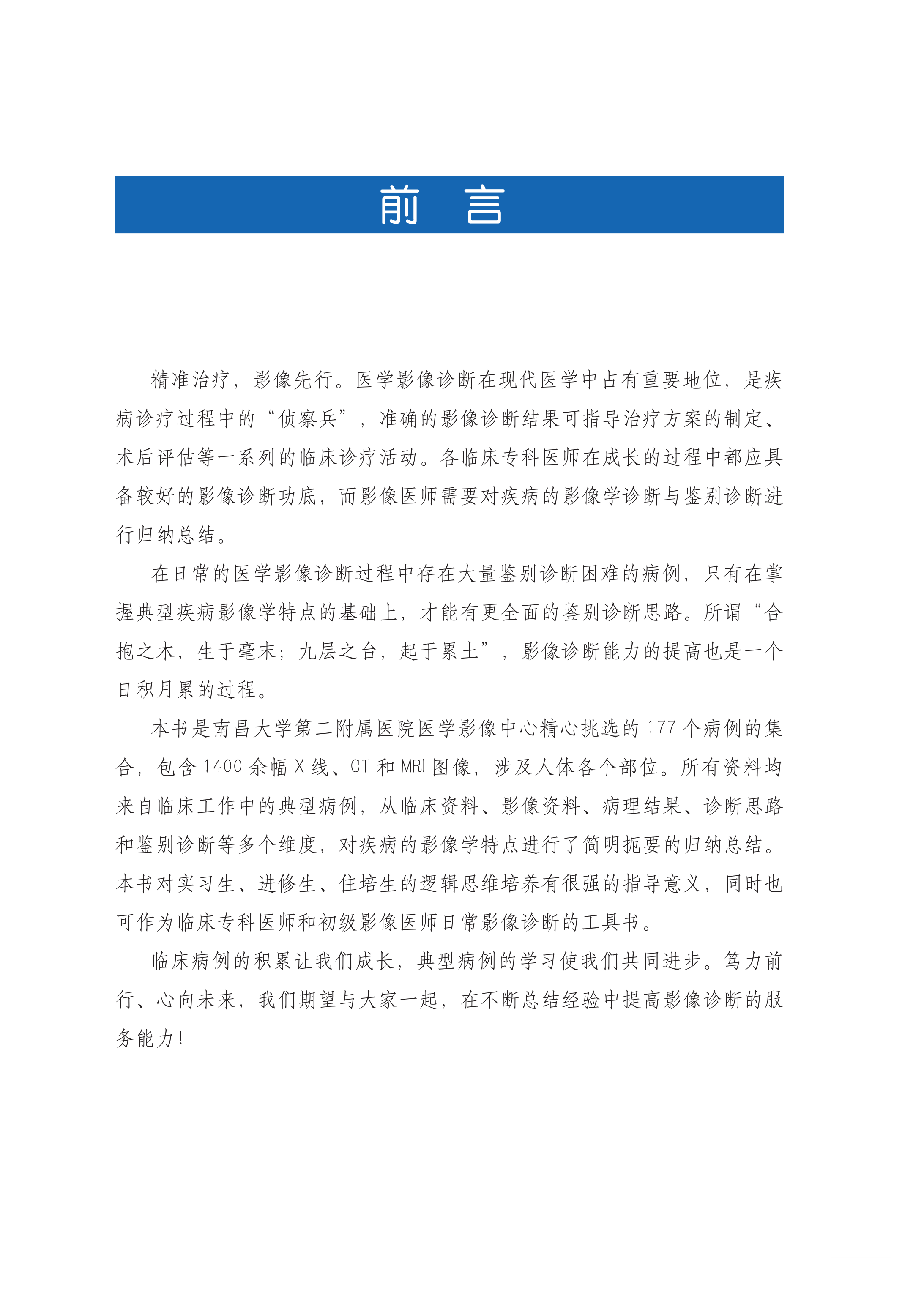 本书是南昌大学第二附属医院医学影像中心精心挑选的177 个病例的集合,包含1400 余幅 X 线、CT 和 MRI 图像,涉及人体各个部位。所有资料均来自临床工作中的典型病例,从临床资料、影像资料、病理结果、诊断思路