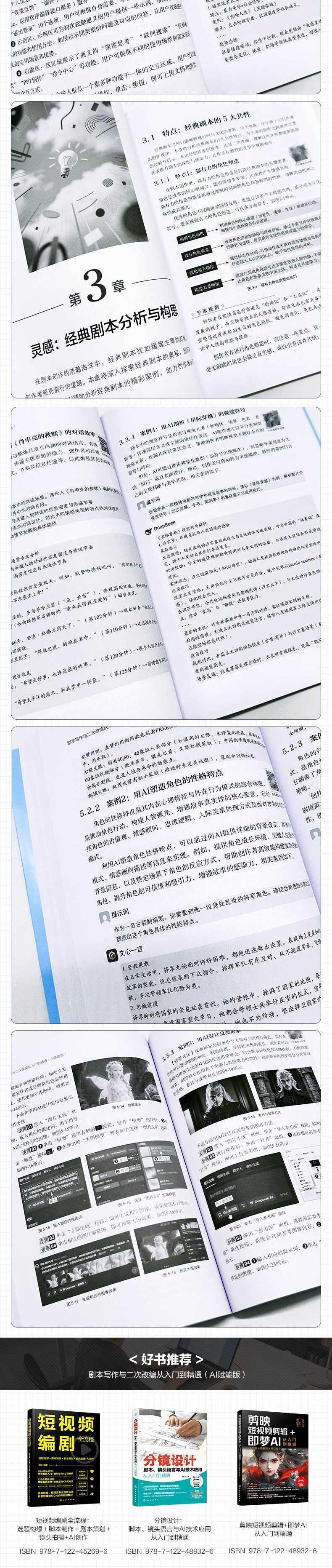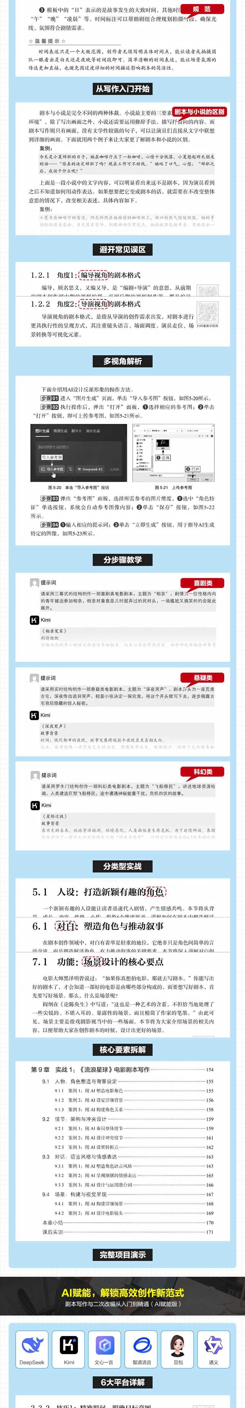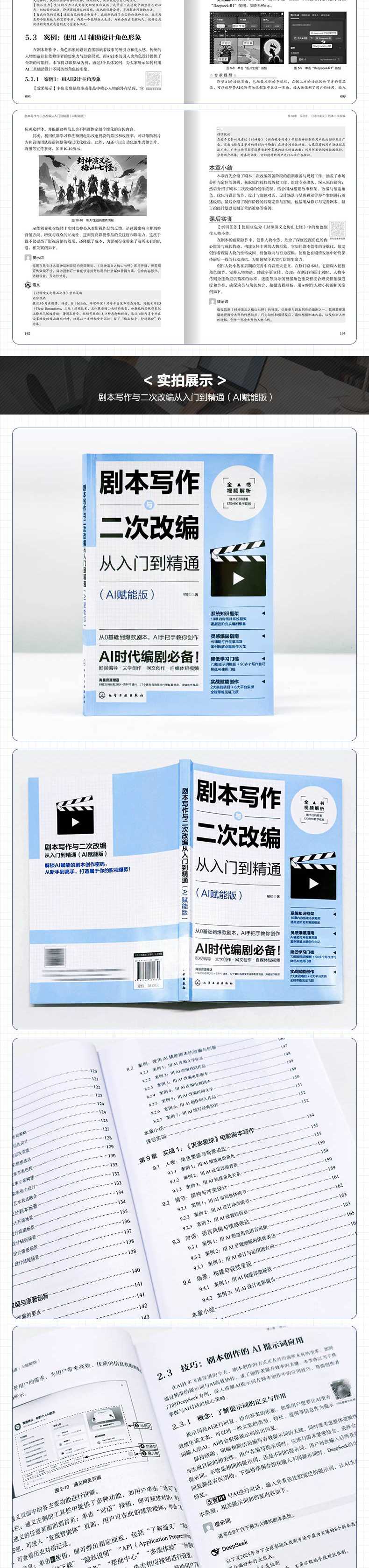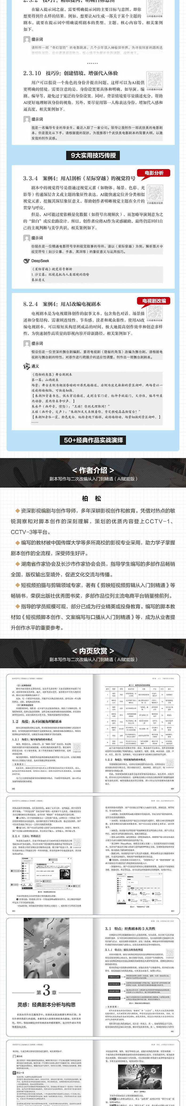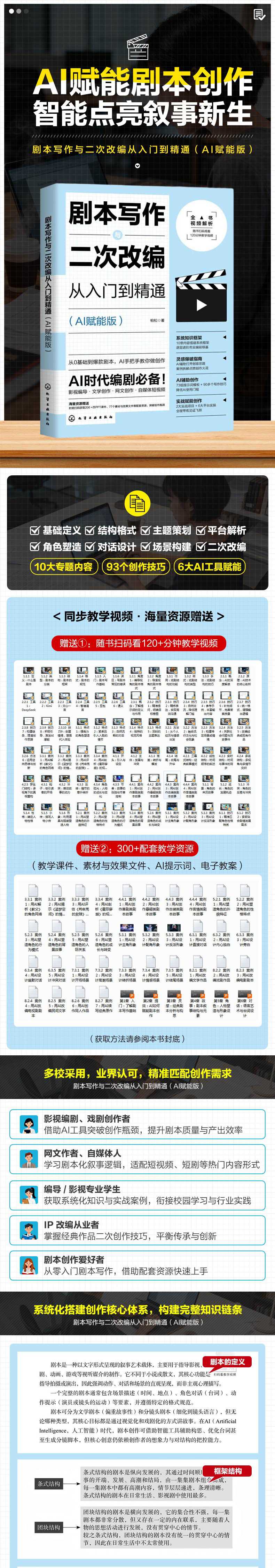 一、写作驱动在科技兴国的时代浪潮下,剧本创作正经历着从传统的纸笔创作到如今借助AI进行创作与改编的转变。本书正是在这样的浪潮中应运而生的,致力于为广大剧本创作者与爱好者提供一本全面且实用的剧本写作与二次改编指南,助力他们搭乘AI技术的快车,在影视创作的道路上加速前行,为我国影视文化产业的繁荣贡献力量。在这个内容为王的时代,无论是初出茅庐的新人,还是经验丰富的资深创作者,都面临着诸多创作困境。经过大量调研,我们发现创作者们普遍被以下10大难题所困扰。(1)缺乏系统的剧本写作知识框架,难以构建完整的故事结构。(2)创意与灵感匮乏,难以突破思维定式,作品难以在众多作品中脱颖而出。(3)角色塑造单薄,人物缺乏立体感和成长弧光,难以让观众产生共鸣。(4)对话设计生硬,无法自然推动剧情发展或展现角色性格。(5)情节冲突平淡,难以吸引观众。(6)场景描写缺乏视觉表现力,无法为导演提供清晰的拍摄依据。(7)二次改编时难以平衡原著精神与创新需求。(8)创作效率低下,耗费大量时间和精力却难以产出高质量的作品。(9)对AI工具不熟悉,不知如何利用其辅助创作。(10)缺乏实战案例参考,难以将理论转化为实践。这些痛点和难点,如同创作道路上的重重障碍,阻碍着创作者们迈向成功的步伐。而本书正是为了解决这些问题而编写的,我们将通过系统的理论讲解、丰富的实战案例及AI技术的赋能,帮助读者逐一攻克这些难关,让剧本创作之路变得不再艰难。二、本书特色为切实解决创作者面临的种种难题,本书精心打磨出了以下5大特色。(1)10大专题内容,93个创作技巧,覆盖创作全链路:从剧本的定义、分类、框架等写作基础到角色、对话、设计等深度创作,从传统写作技巧到AI赋能策略,覆盖剧本写作与二次改编从创意到成稿的全流程。(2)6大AI工具赋能,攻克创作难题:涵盖DeepSeek、Kimi、文心一言、智谱清言、豆包、通义6大AI工具,从提示词的应用技巧到各类工具在剧本创作与二次改编中的实操演练,针对对话、场景、角色等细分领域,提供即学即用的创作秘籍。(3)全流程AI实战,助力落地创作:选取《流浪星球》电影剧本创作和《封神演义》剧本二次改编两个实战案例,从人物、情节、对话、场景等方面详细展示创作过程,包括如何运用AI进行角色塑造、情节设计、对话创作和场景构建等。通过这些实战案例,创作者能将所学知识应用到实际创作中,提升创作能力,增强写出爆款剧本的信心。(4)丰富的案例演示,提升学习效率:120多分钟的教学视频通过动态演示,让观众直观掌握AI工具的操作与剧本创作技巧;40多张图片以可视化方式解析复杂概念,让学习更轻松高效;50多个实战案例清晰展现理论与实践的完美结合。(5)5大超值赠送,降低学习门槛:随书附赠丰富的学习资源,包括教学视频、素材文件、效果文件、AI提示词及工具链接等,这些资源将为读者提供更多的学习支持和创作灵感,让读者在创作过程中有章可循。这是一本写给编剧的实战宝典,无论你是初涉剧本创作的新手,还是希望借助AI提效的资深从业者,本书都能为你打开一扇通往高效创作的大门。从理论到实践,从传统到创新,从文字到视觉让AI成为你的创作伙伴,共同书写属于这个时代的精彩故事。三、教学资源本书提供的配套教学资源及具体数量如下表所示。四、获取方式如果读者需要获取书中案例的素材、效果、视频或其他资源,请使用微信;扫一扫功能,按需扫描下列对应的二维码即可。五、特别提示(1)版本更新:本书在编写过程中所采用的AI工具和网页平台的操作截图,均为截稿时的实际界面。但本书从编辑到出版需要一段时间,这些工具和平台的功能、界面等都可能会有变动,读者在阅读时,请根据书中的思路,举一反三,进行学习。(2)提示词:也称为文本提示(或提示)、文本描述(或描述)、文本指令(或指令)、关键词或;咒语等。需要注意的是,即使是使用完全相同的提示词,AI模型每次生成的图像和回复都会有差别,这是模型基于算法与算力得出的新结果,是正常的,所以大家会看到书中的回复与视频中的有所区别,包括大家用同样的提示词去生成时,生成的效果也会有差异。(3)因为篇幅有限,当AI工具回复的内容比较多时,正文中只展示了前面部分的内容,详细的回复内容,请看随书提供的完整效果文件。本书由柏松著,特别感谢参与编写整理的张玥、苏高等人。由于编者知识水平有限,书中难免有疏漏之处,恳请广大读者批评、指正。