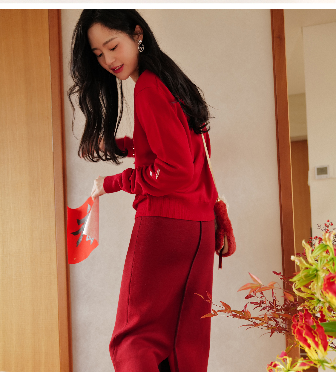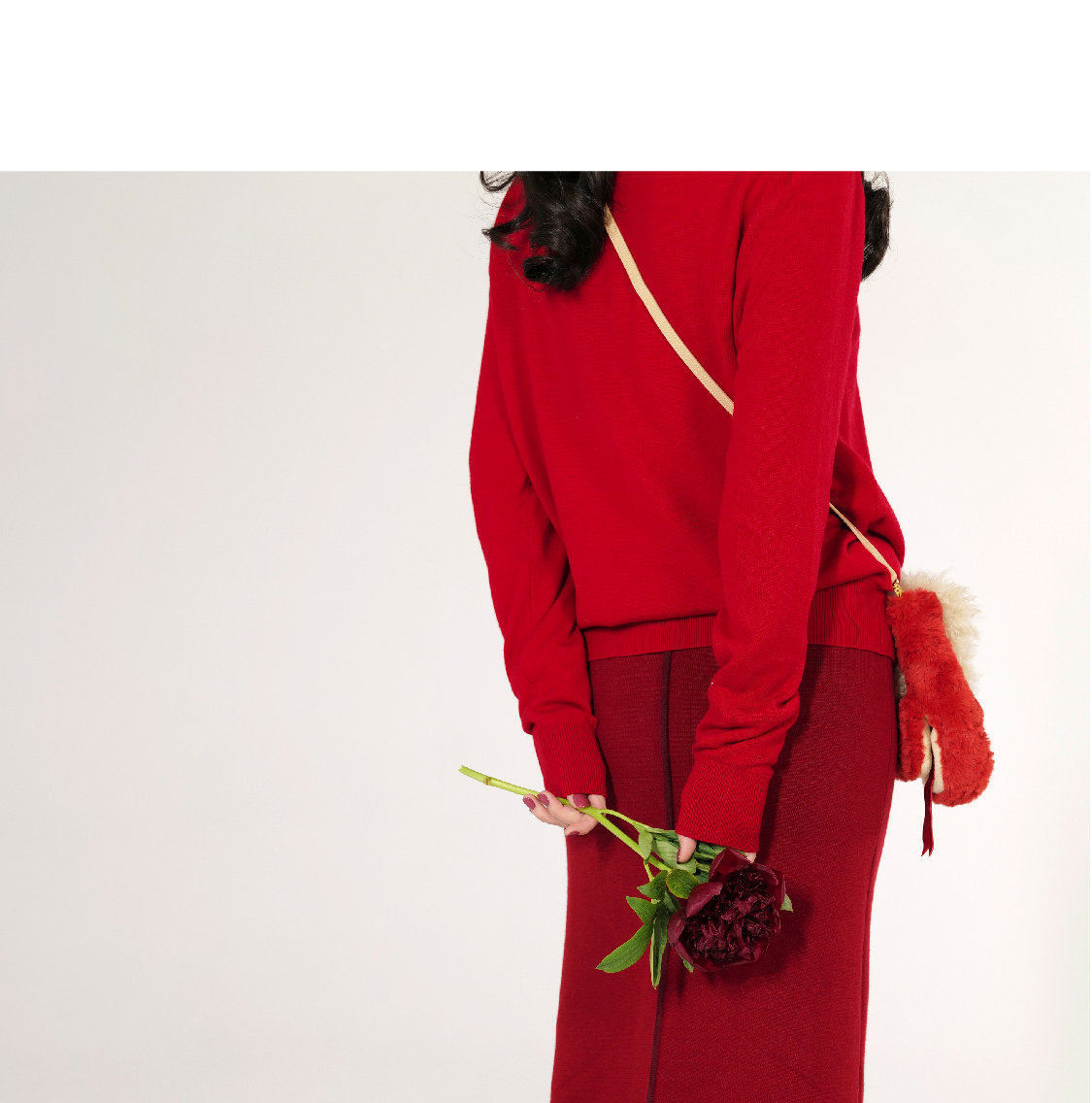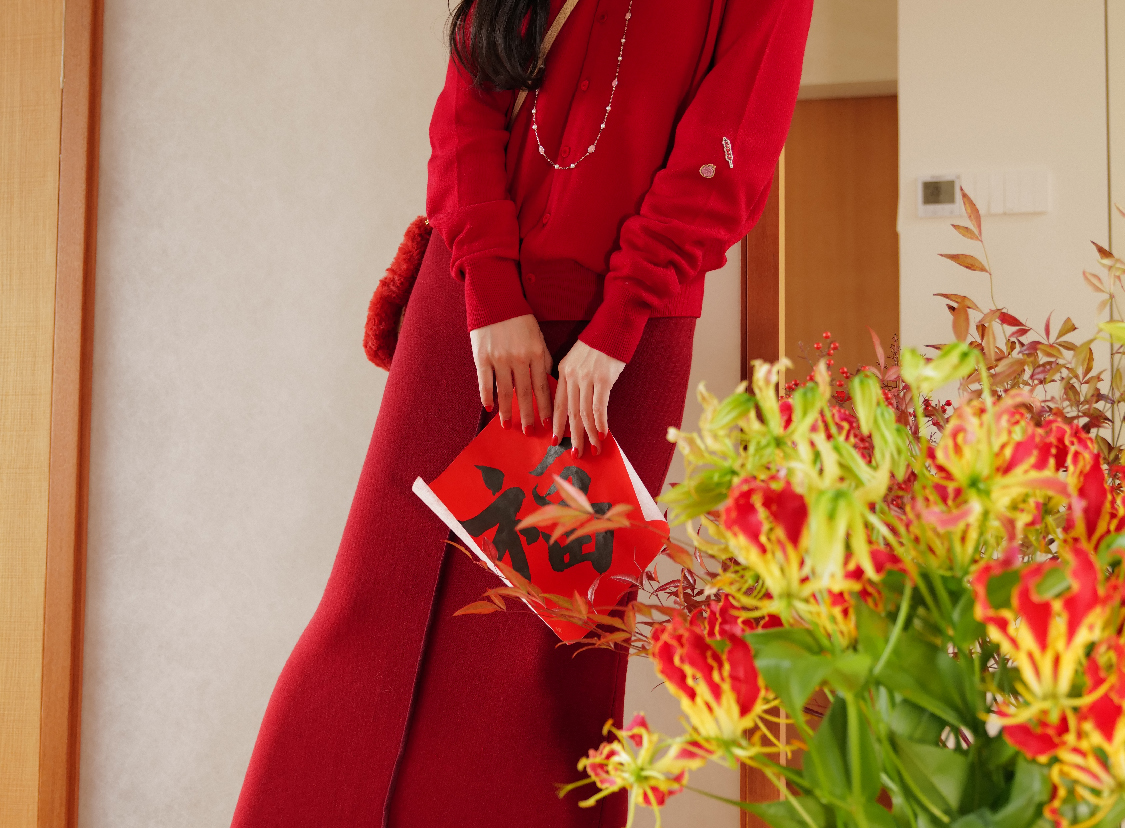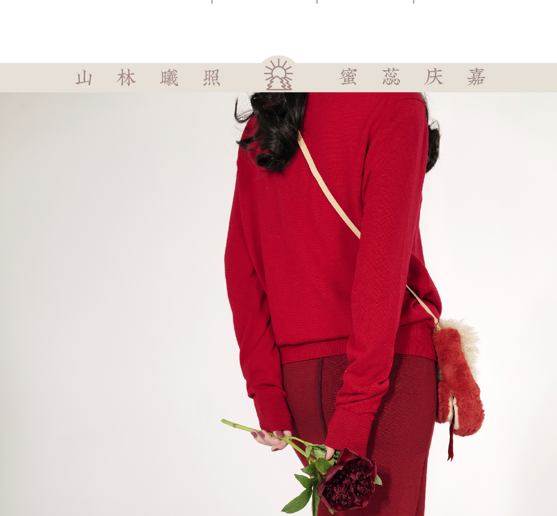 庆嘉 羊毛针织H型弹力红裙 山林曦照