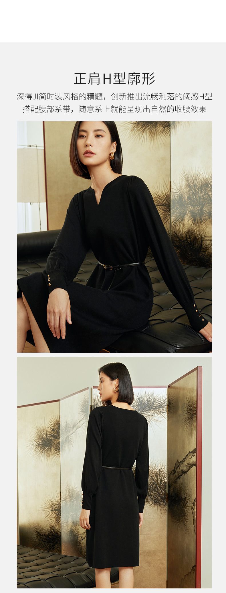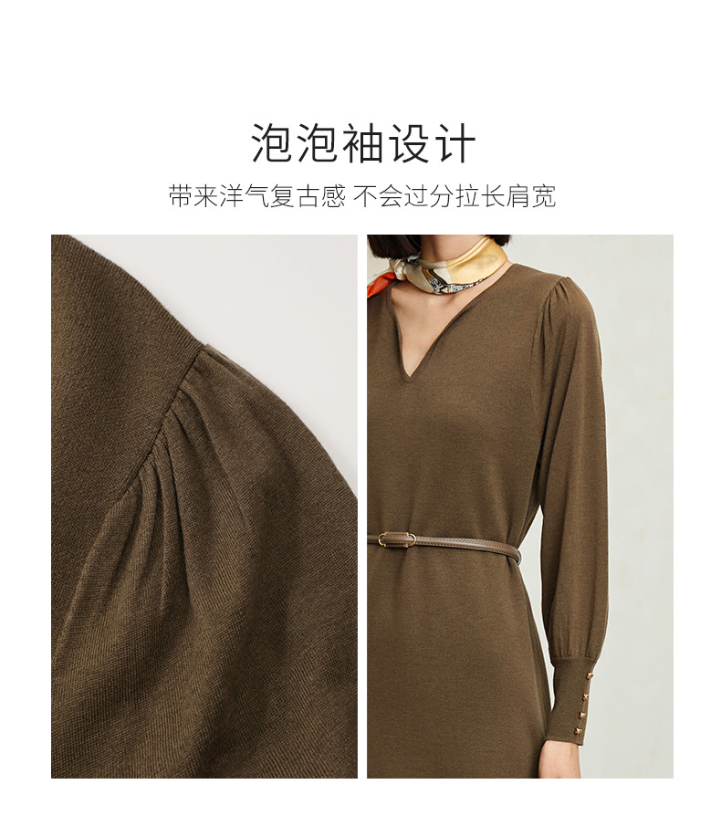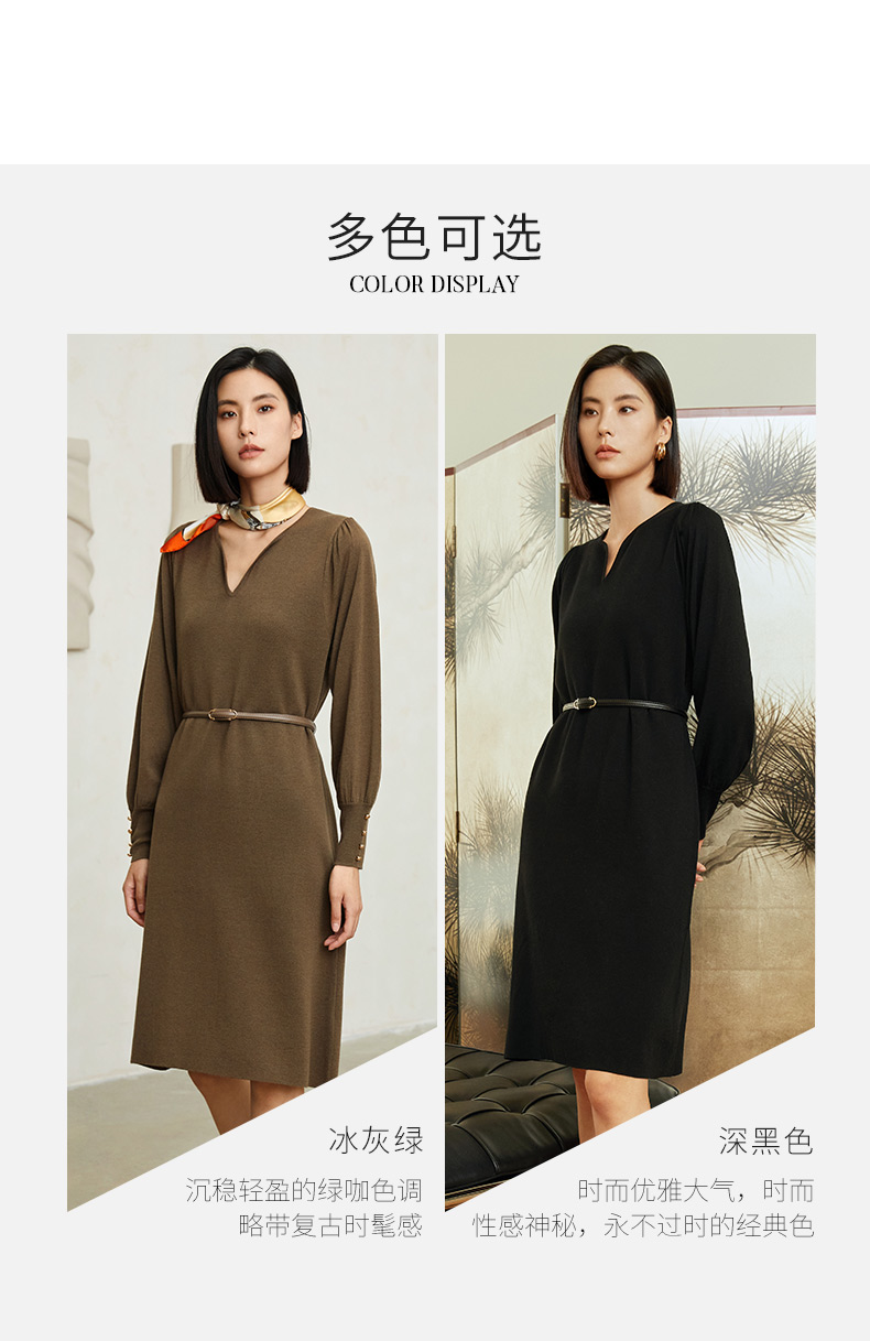 玳莎优雅波浪V领连衣裙2023年秋冬新款纯色显瘦羊毛中长款裙子 DC35303